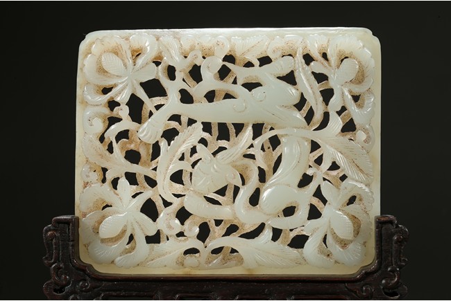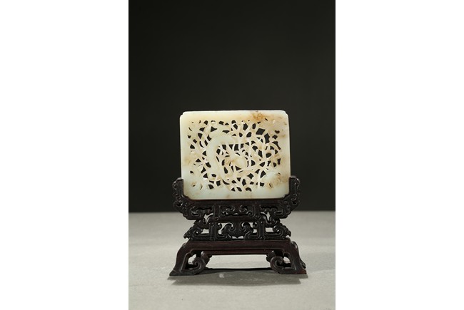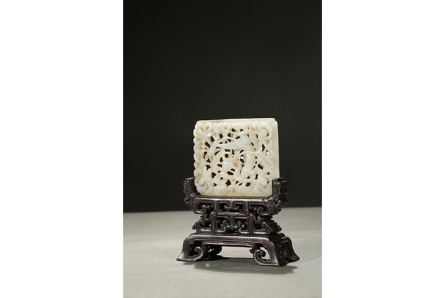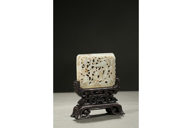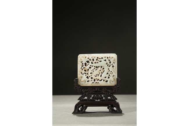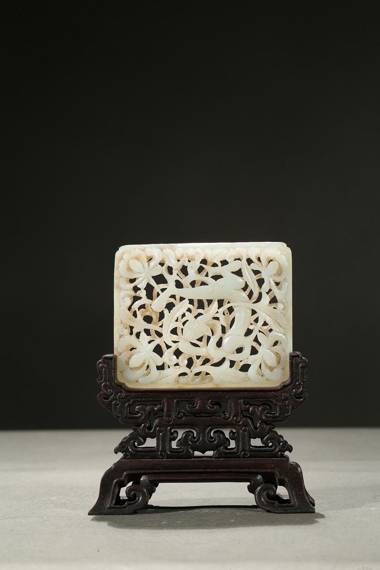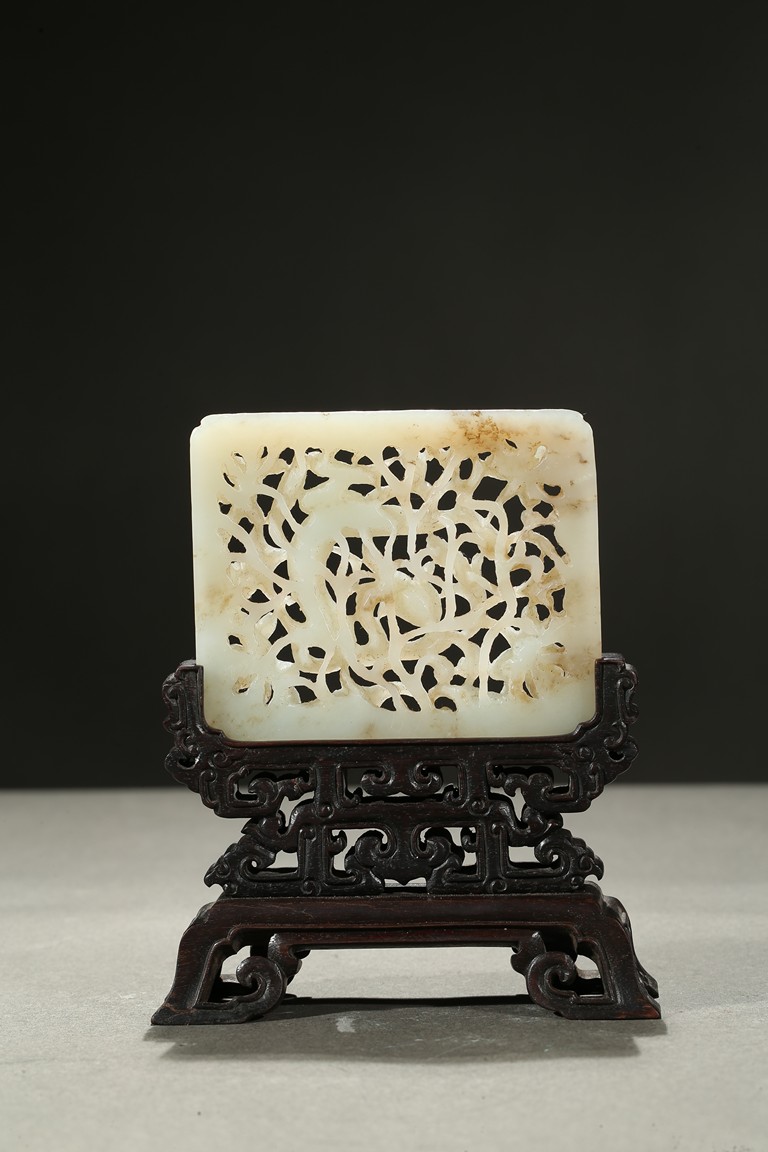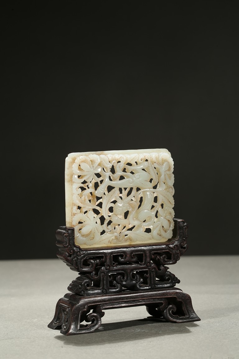 The square plaque finely reticulated to depict a chilong in meandering floral ground, supported on well carved zitan wood stand. Qing Dynasty period.