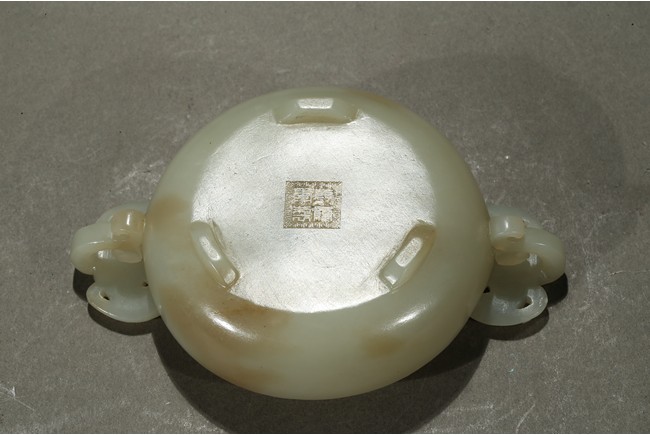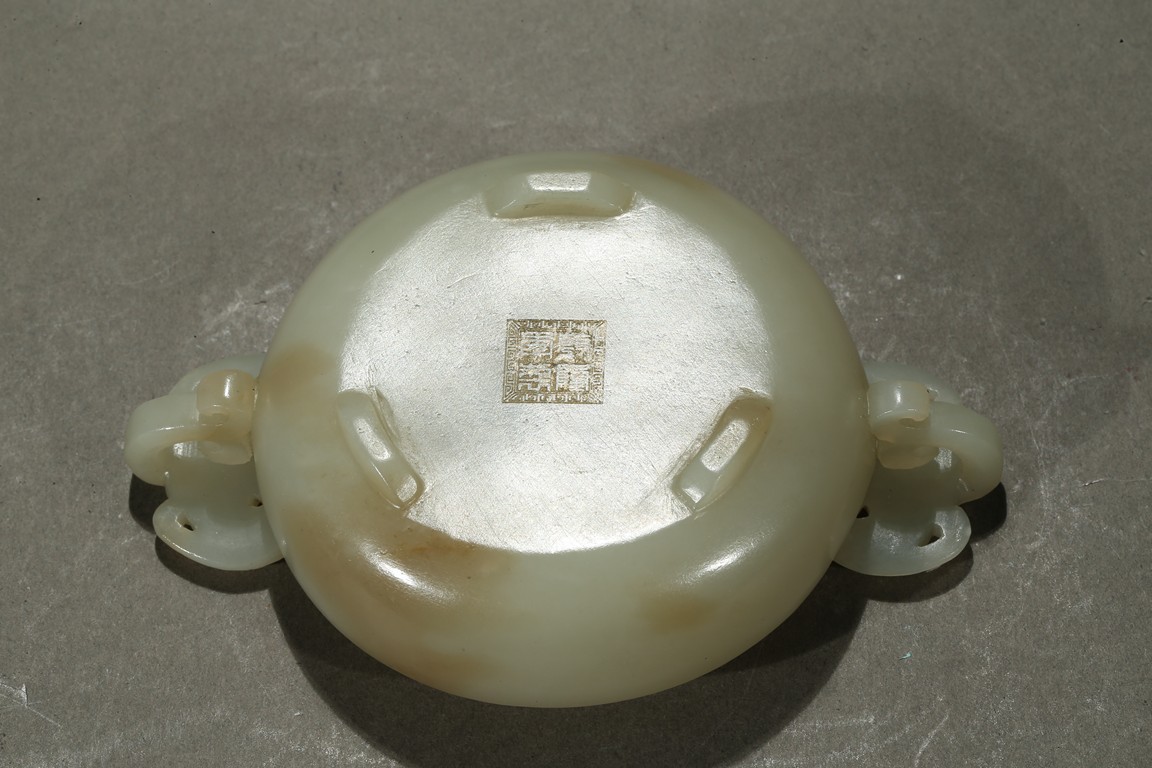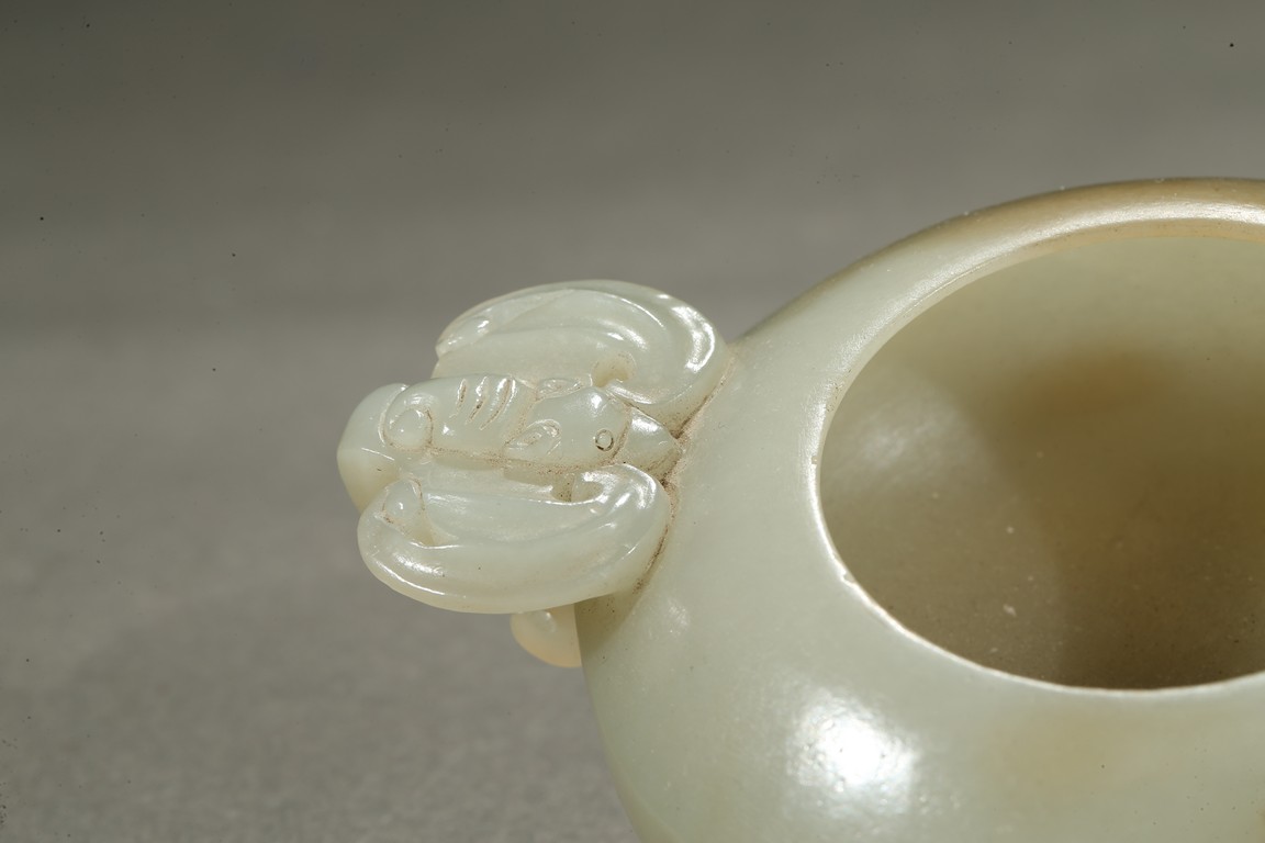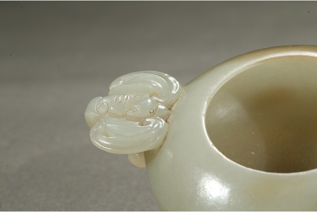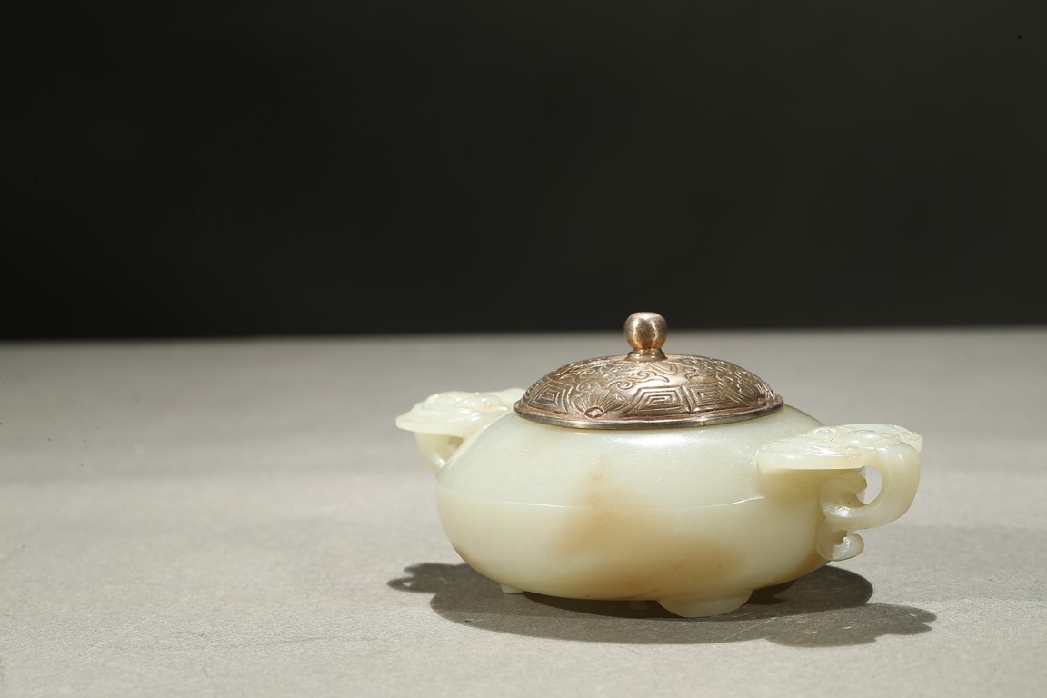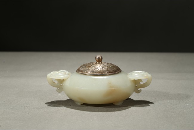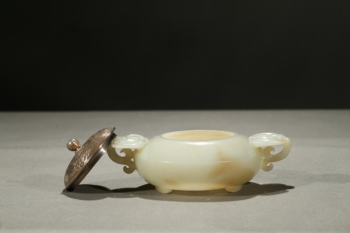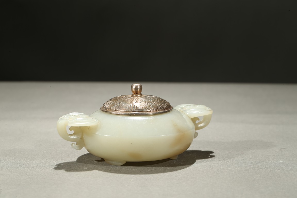 Of compressed globular form, supported on three short stubs, shoulder flanked by two bat-shape handles, fitted with a silver cover, base with mark.
