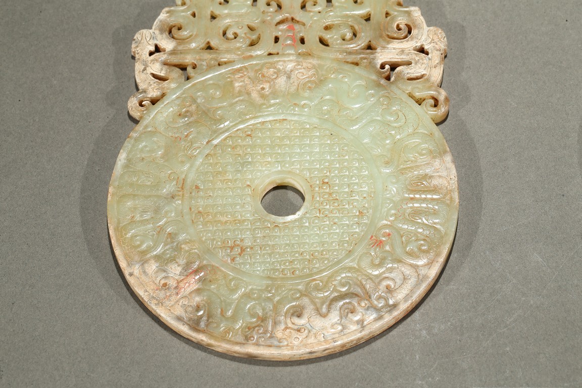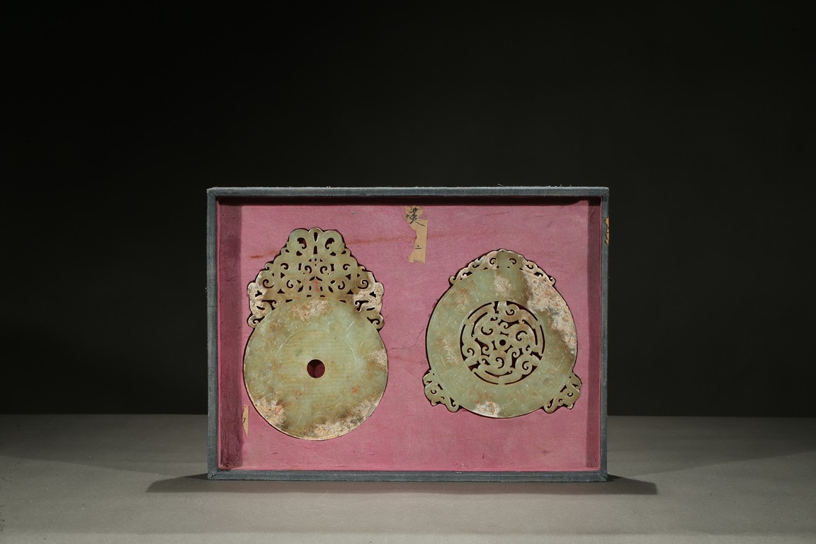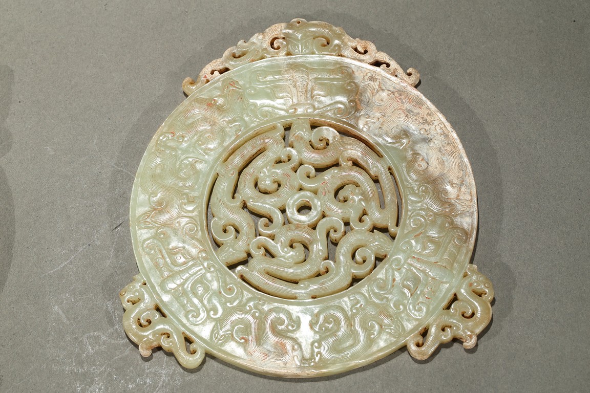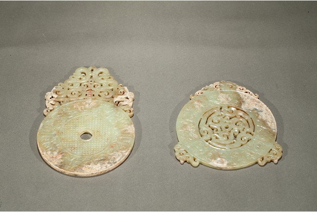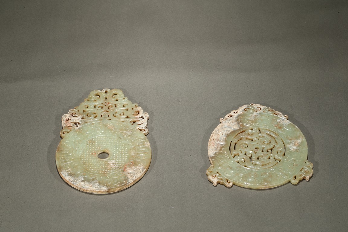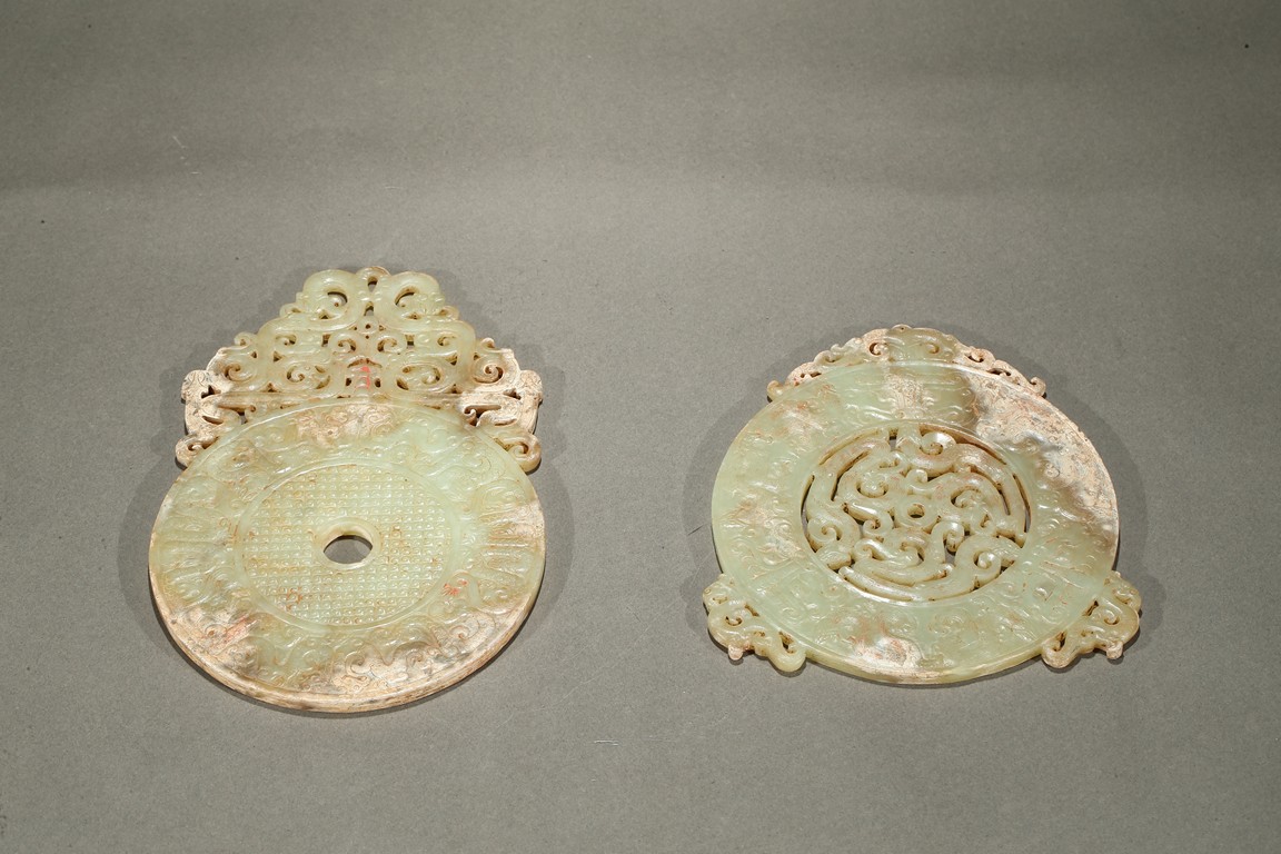 Consisting of a jade disc carved with dense rows of spiral pattern to the inner circle, the outer circle with stylized mythical snake like beast, the top extended flange reticulated to similar writhing mythical beasts; the other jade disc reticulated at the center with mythical beasts, extended with three flanges carved in openwork with mythical beast.
