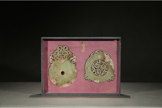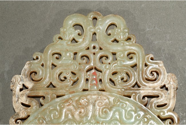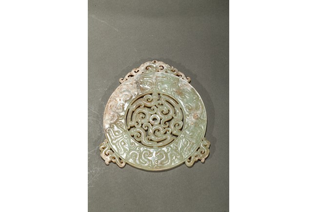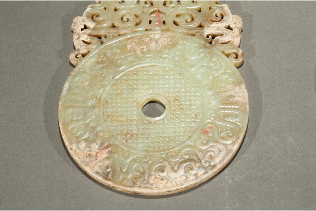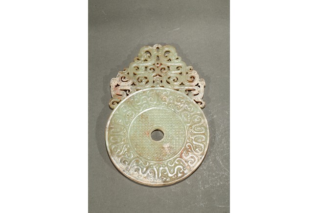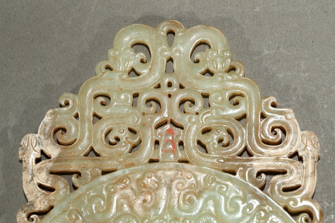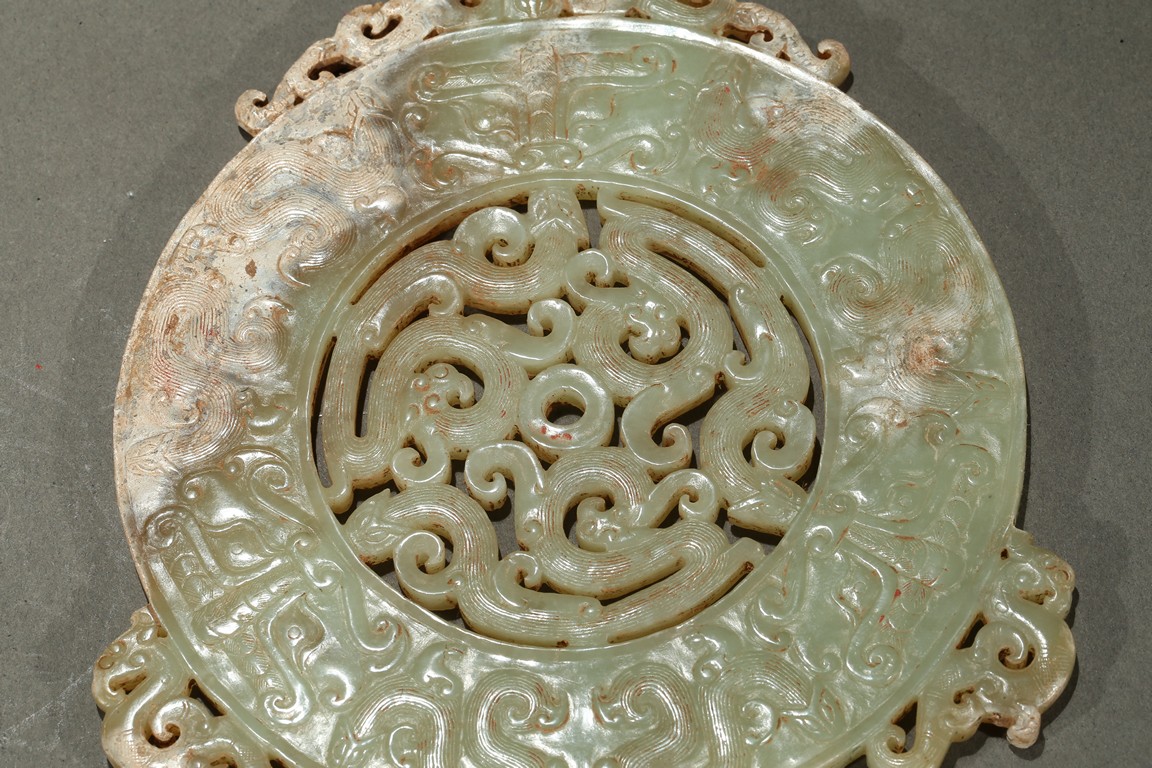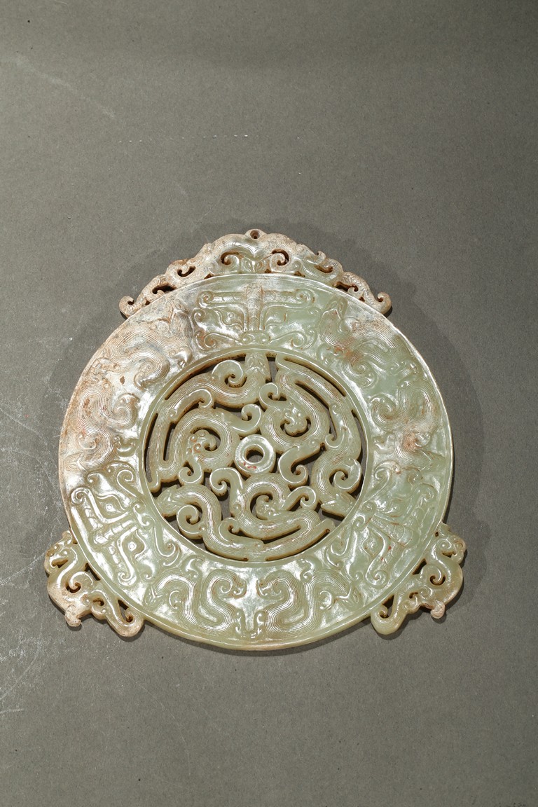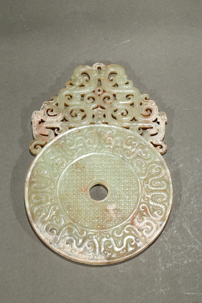 Consisting of a jade disc carved with dense rows of spiral pattern to the inner circle, the outer circle with stylized mythical snake like beast, the top extended flange reticulated to similar writhing mythical beasts; the other jade disc reticulated at the center with mythical beasts, extended with three flanges carved in openwork with mythical beast.