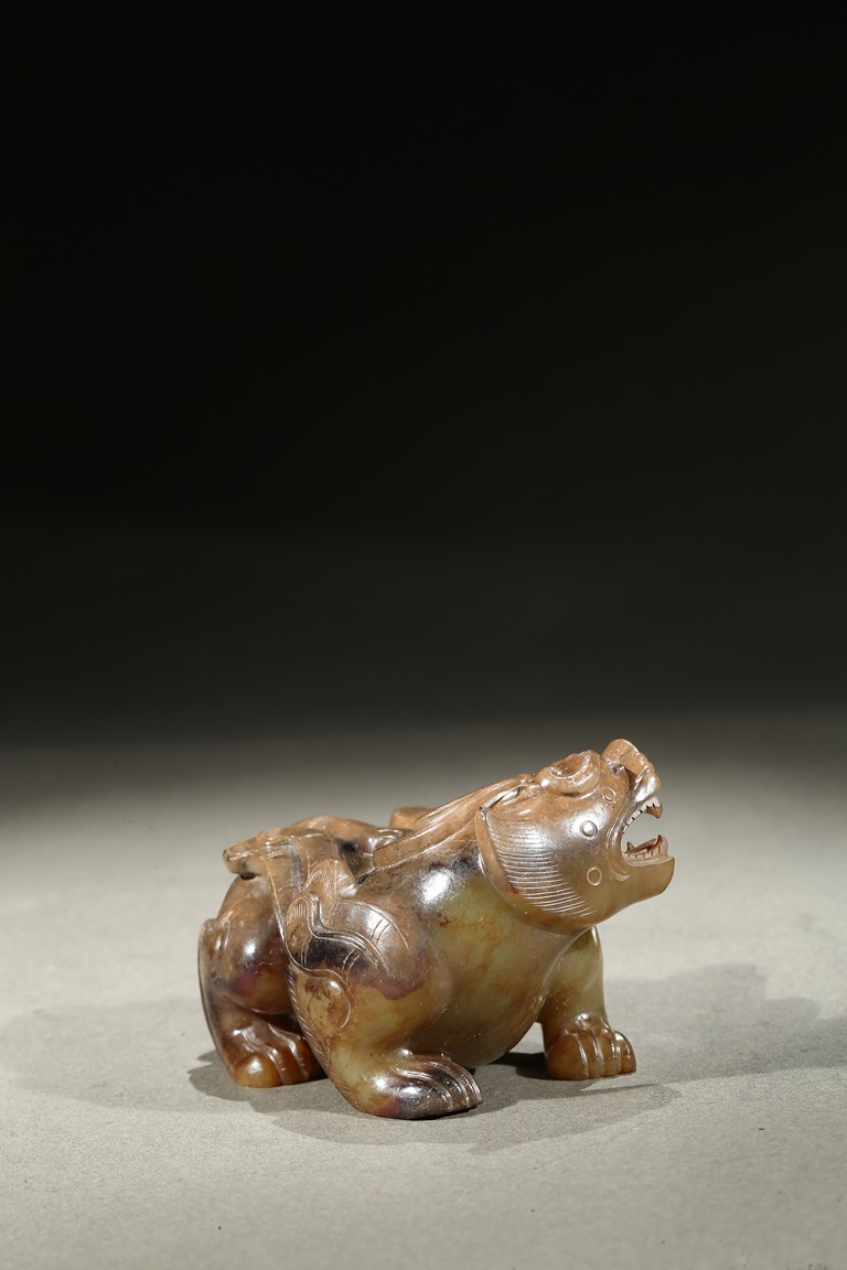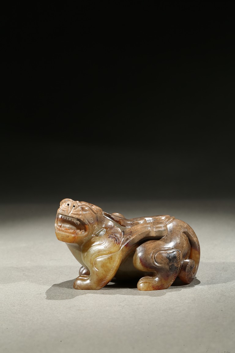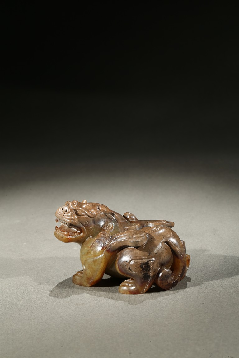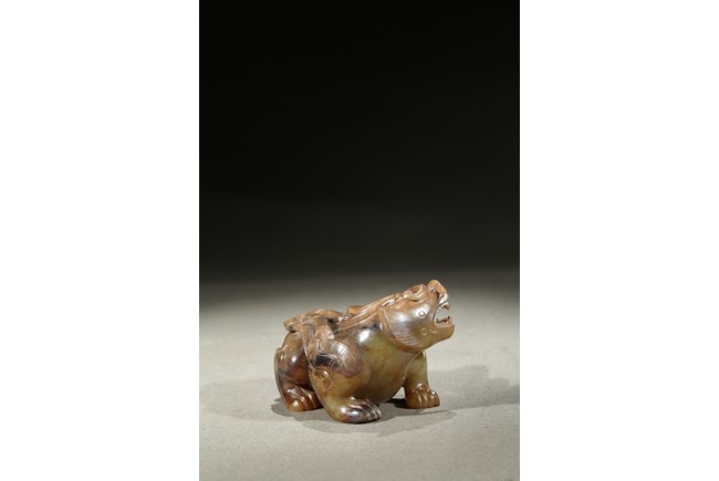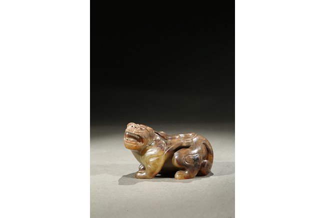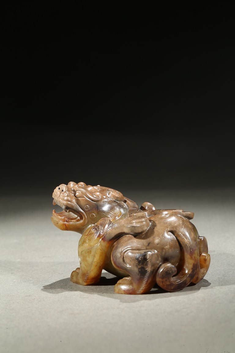 Carved in the form of a crouching bixie, the mythical beast rendered menacing with the head turned left and an open mouth baring its teeth, the curved contours repeated at the archaistic wings, haunches and tail, the stone is of yellow russet tone with brown skin.