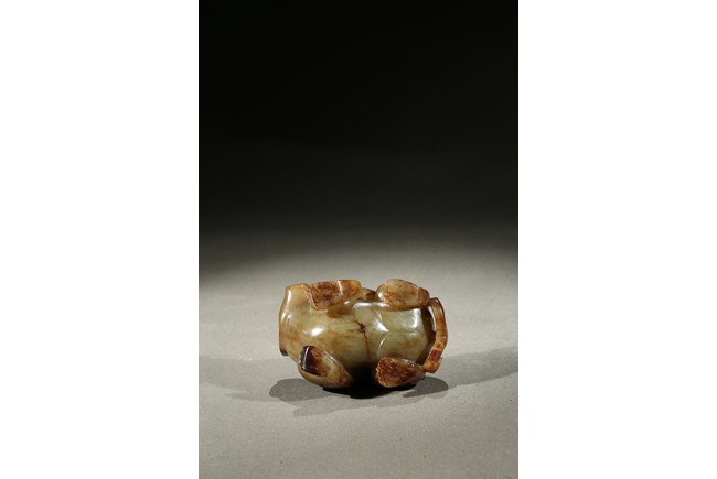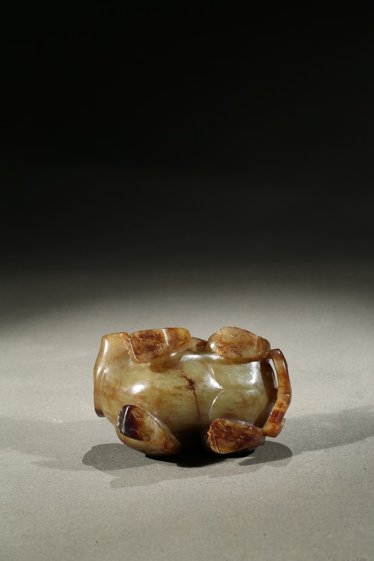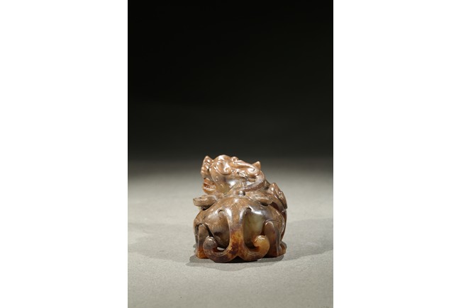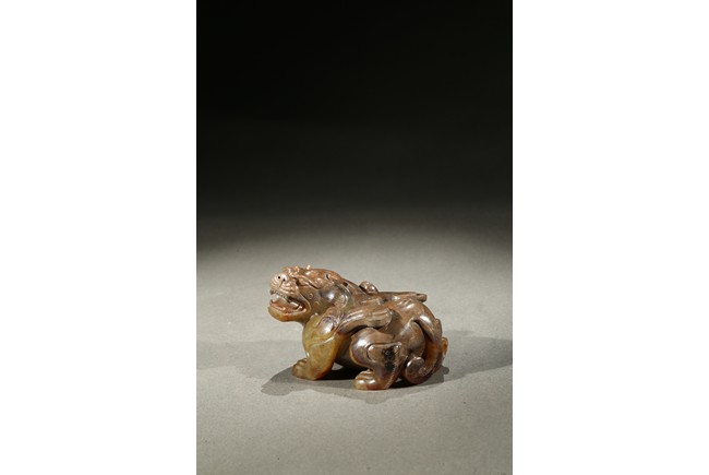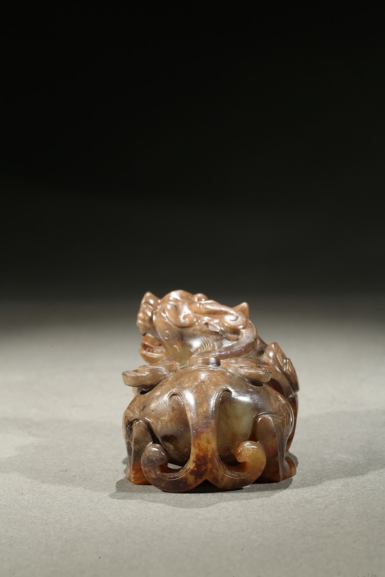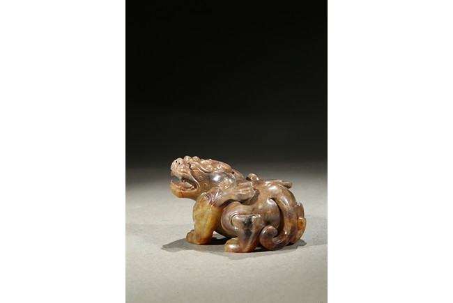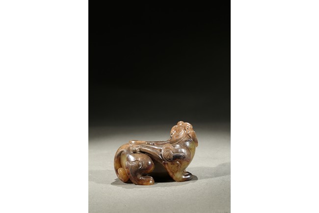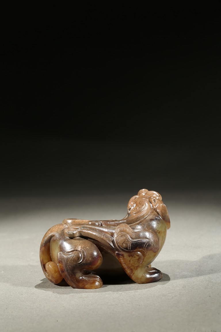 Carved in the form of a crouching bixie, the mythical beast rendered menacing with the head turned left and an open mouth baring its teeth, the curved contours repeated at the archaistic wings, haunches and tail, the stone is of yellow russet tone with brown skin.