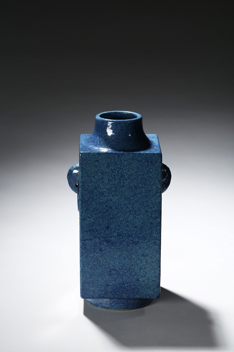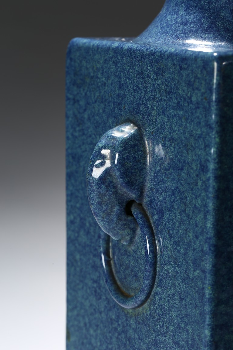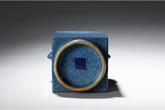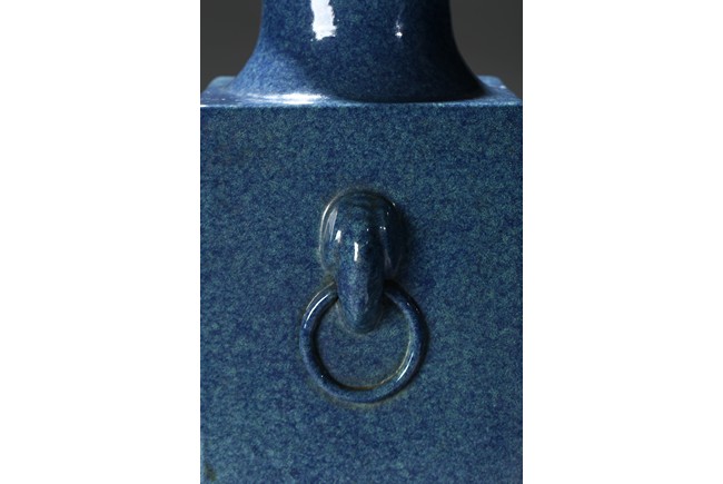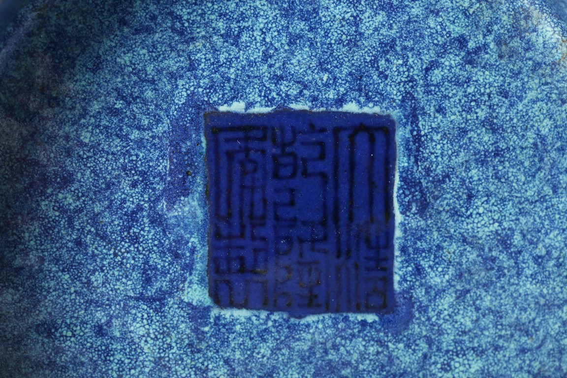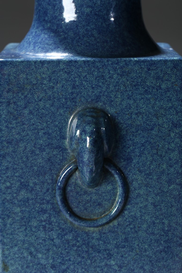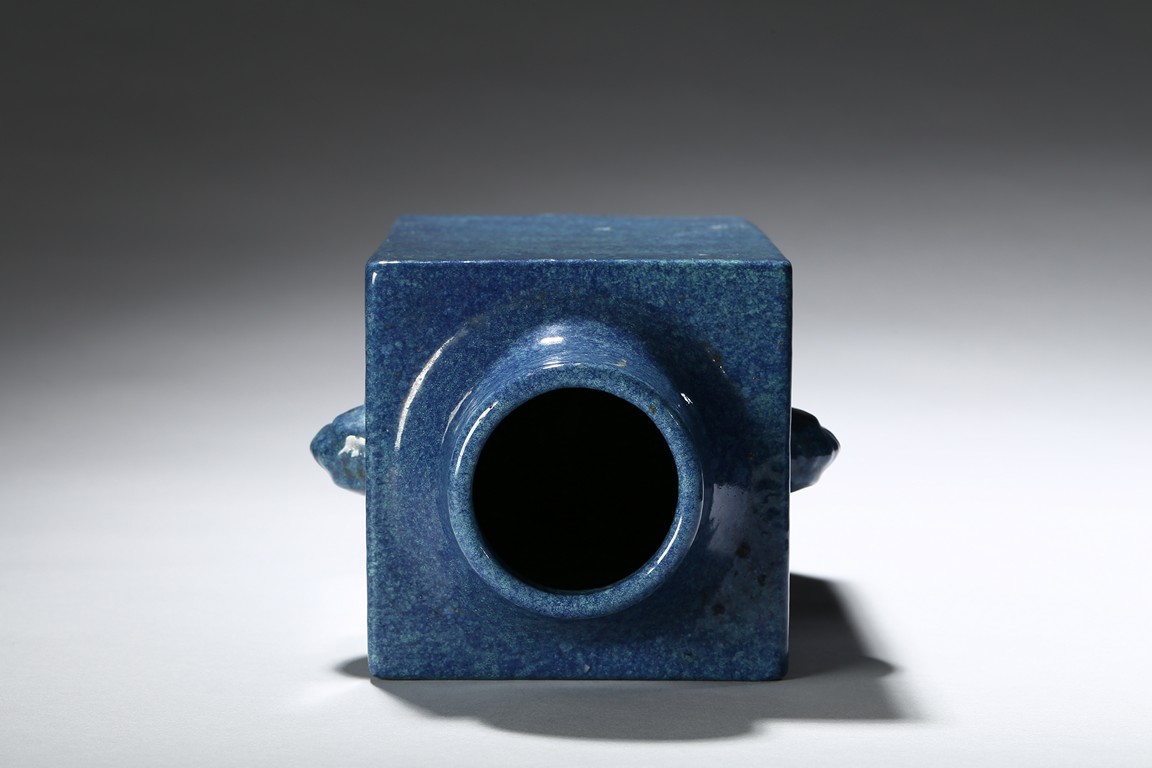 Of square section, body moulded with raised beast-form handles, covered overall with an attractive milky blue and turquoise glazed, base with mark. Qing Dynasty period.