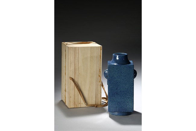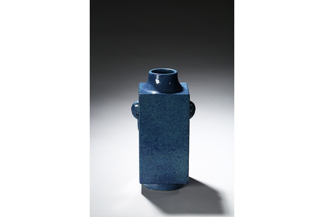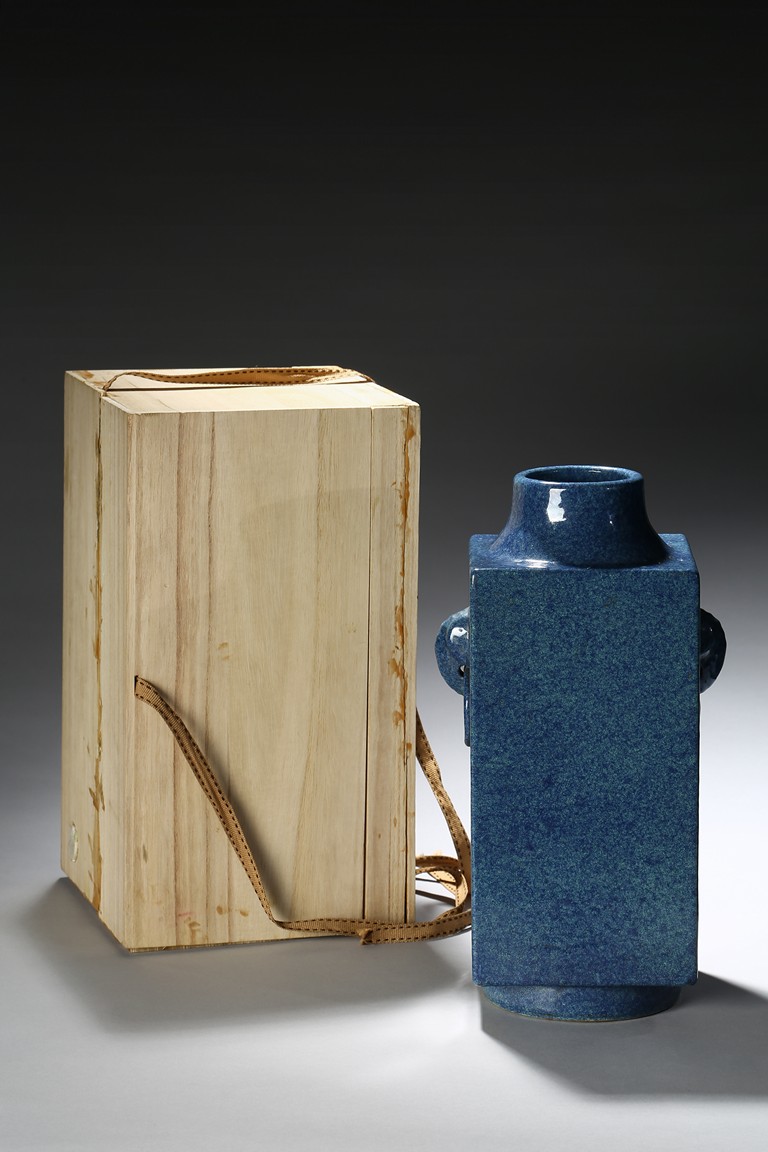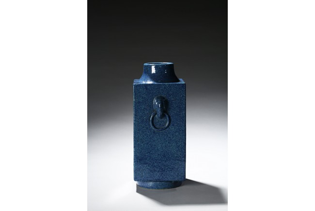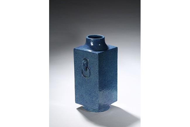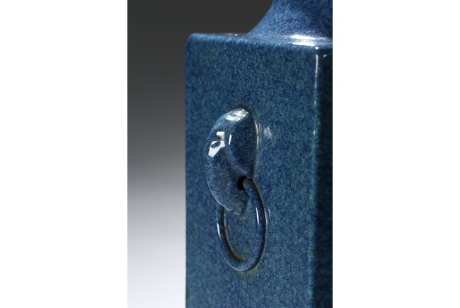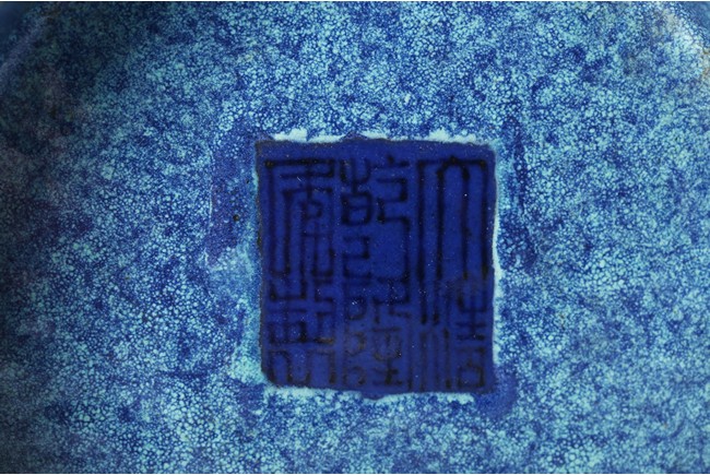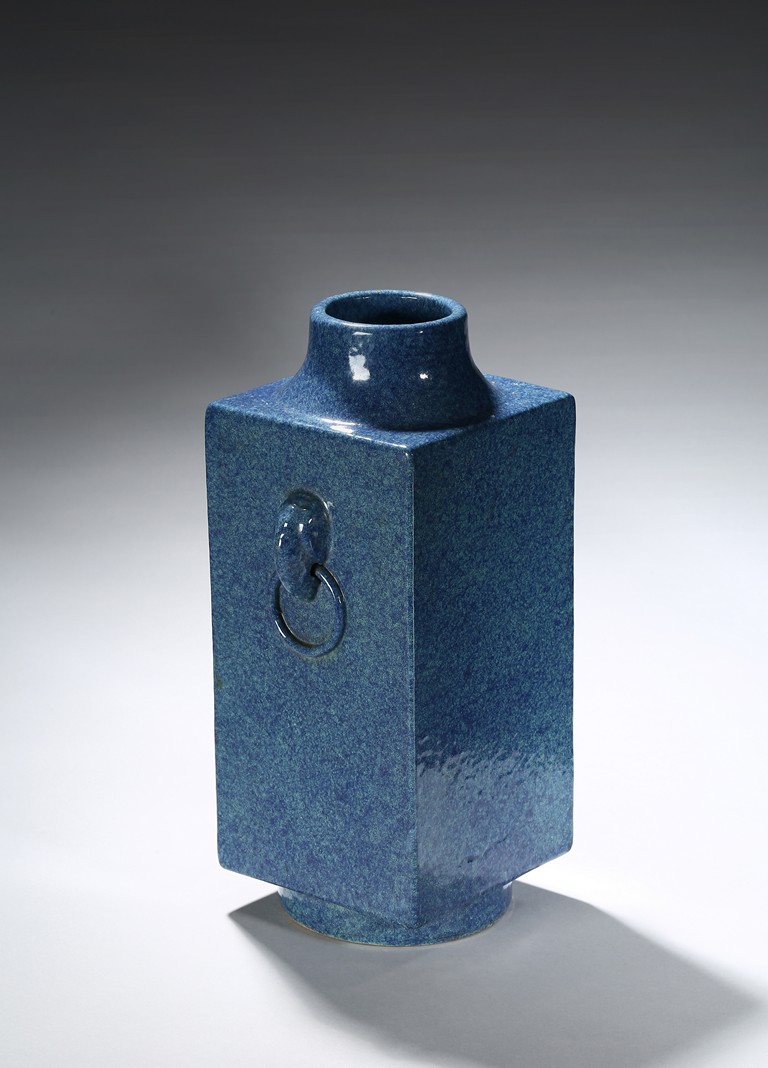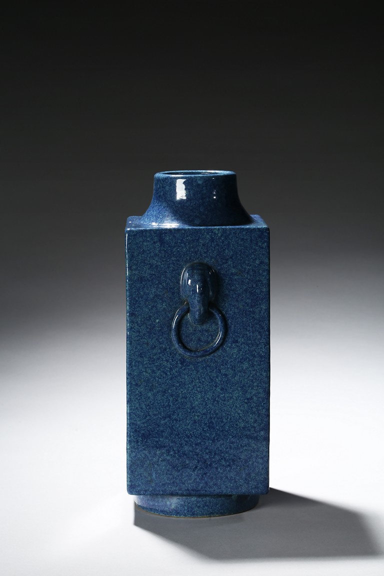 Of square section, body moulded with raised beast-form handles, covered overall with an attractive milky blue and turquoise glazed, base with mark. Qing Dynasty period.