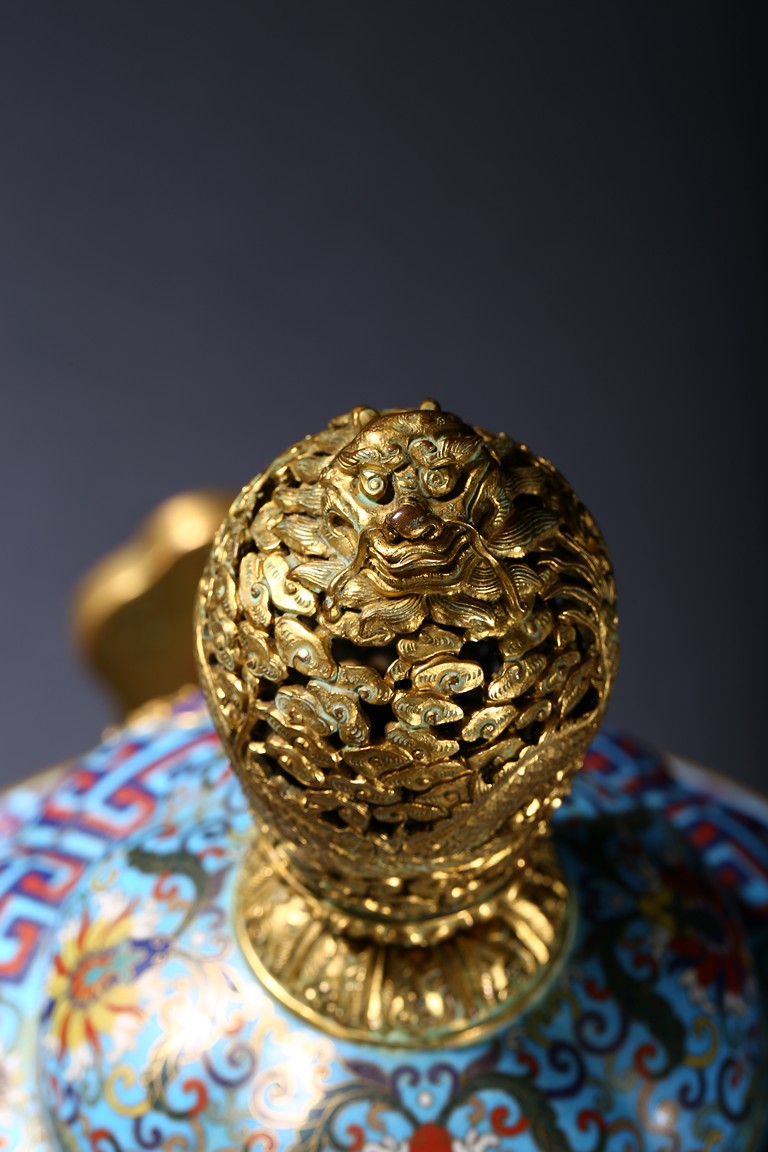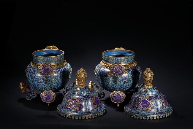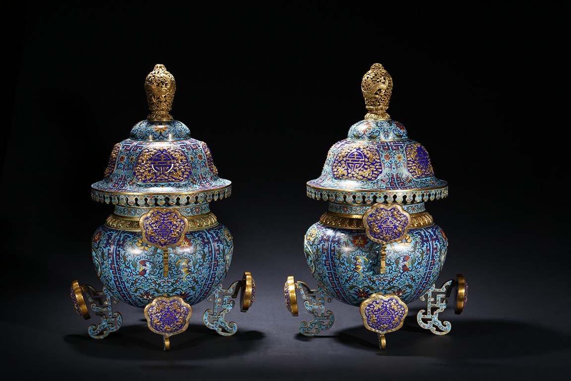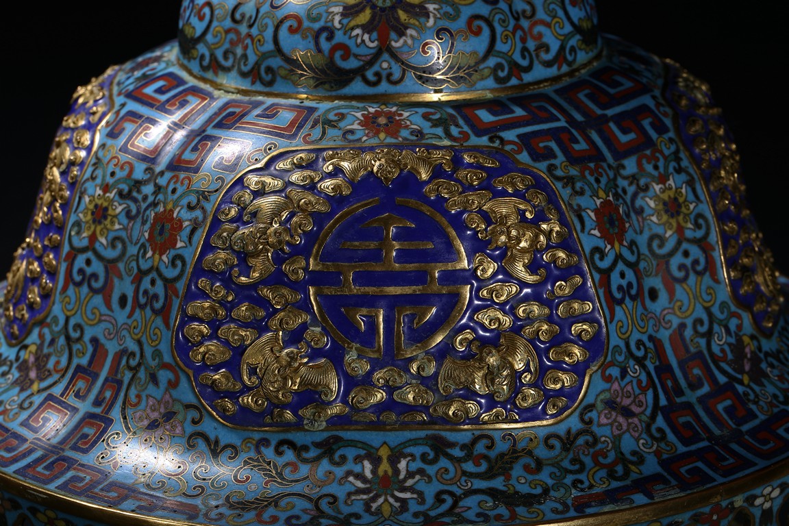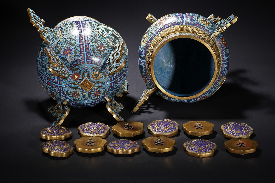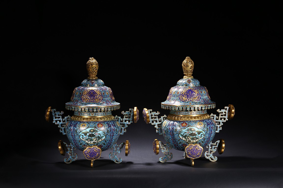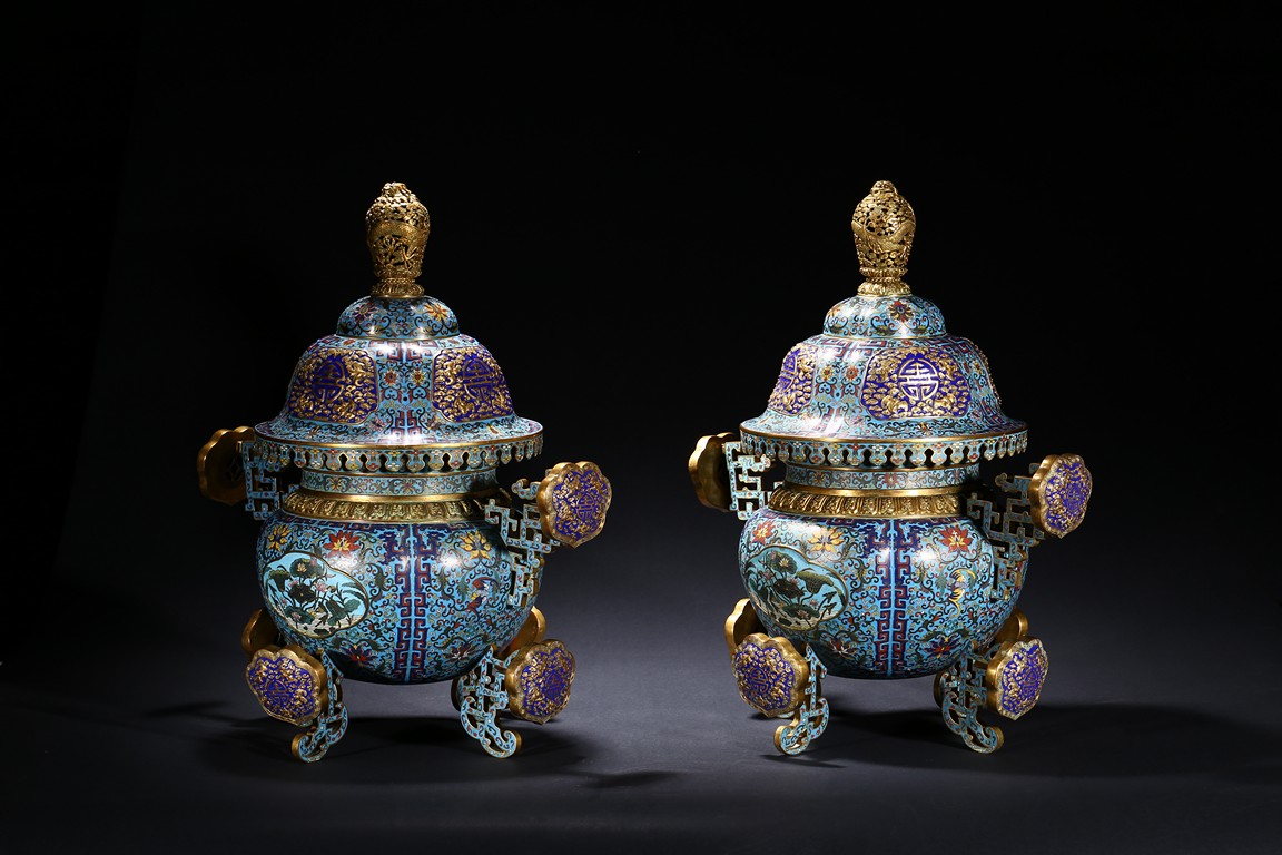 Each supported on three stylized lingzhi branch feet, the body enamelled with two shape cartouche enclosing lotus pond scene reserved on turquoise ground decorated with dense lotus scrolling, flanked by two similar lingzhi handles, the domed cover enamelled with three shape cartouche enclosing shou character and surmounted with a gilt-bronze openwork finial. Base with six character mark. Qing Dynasty period.