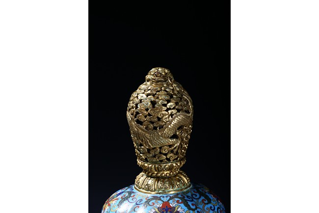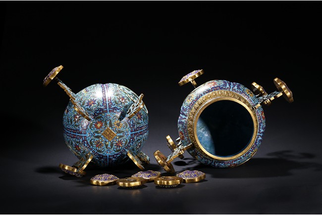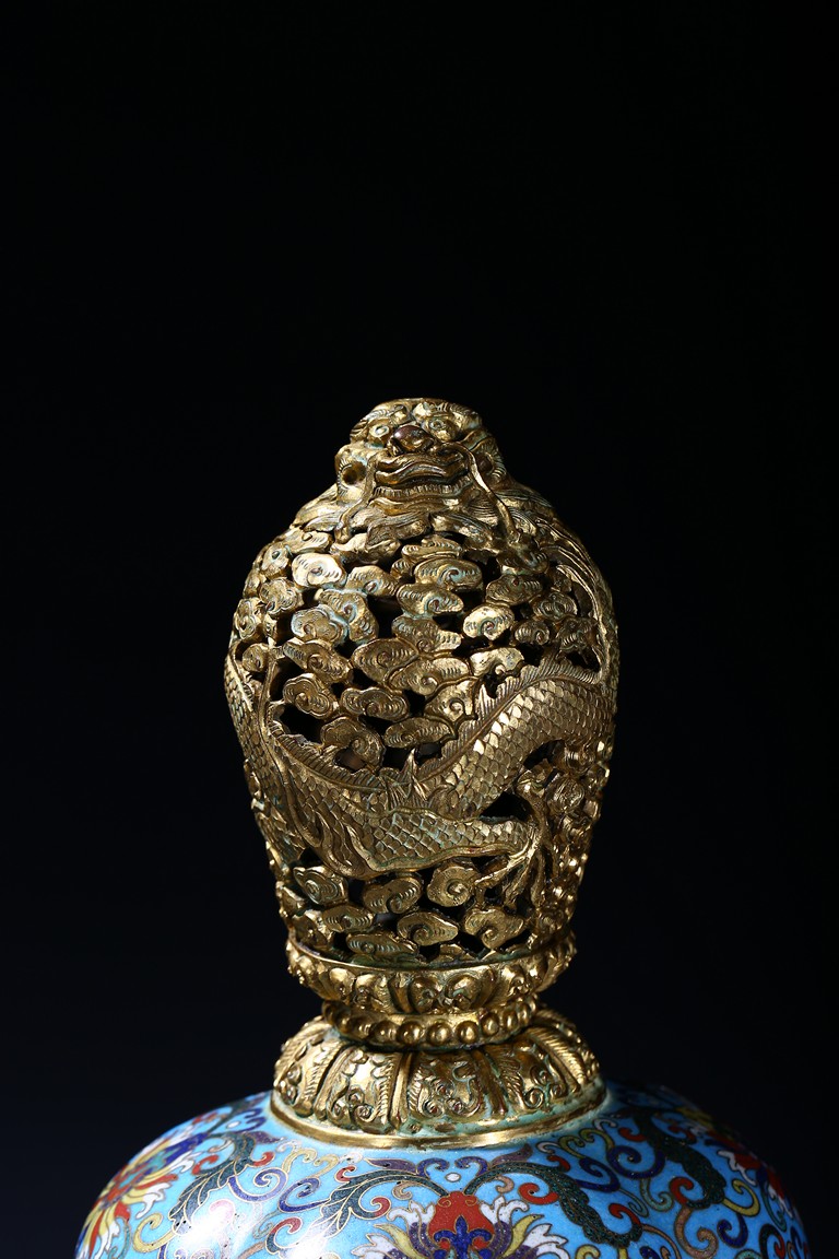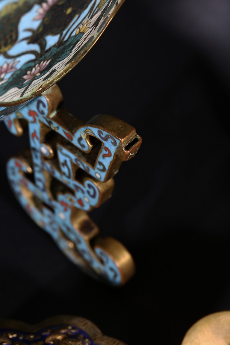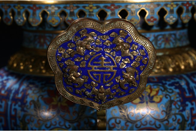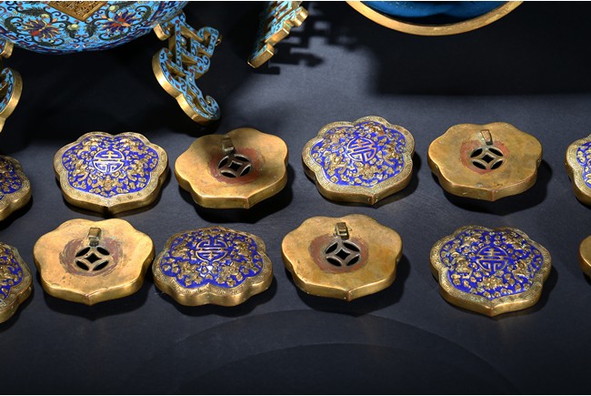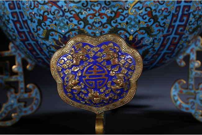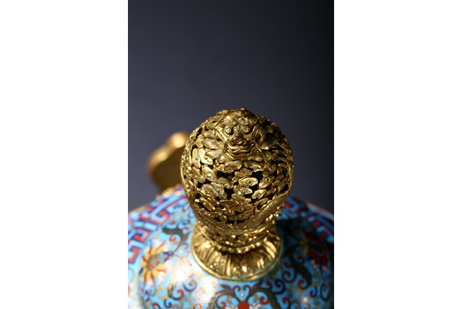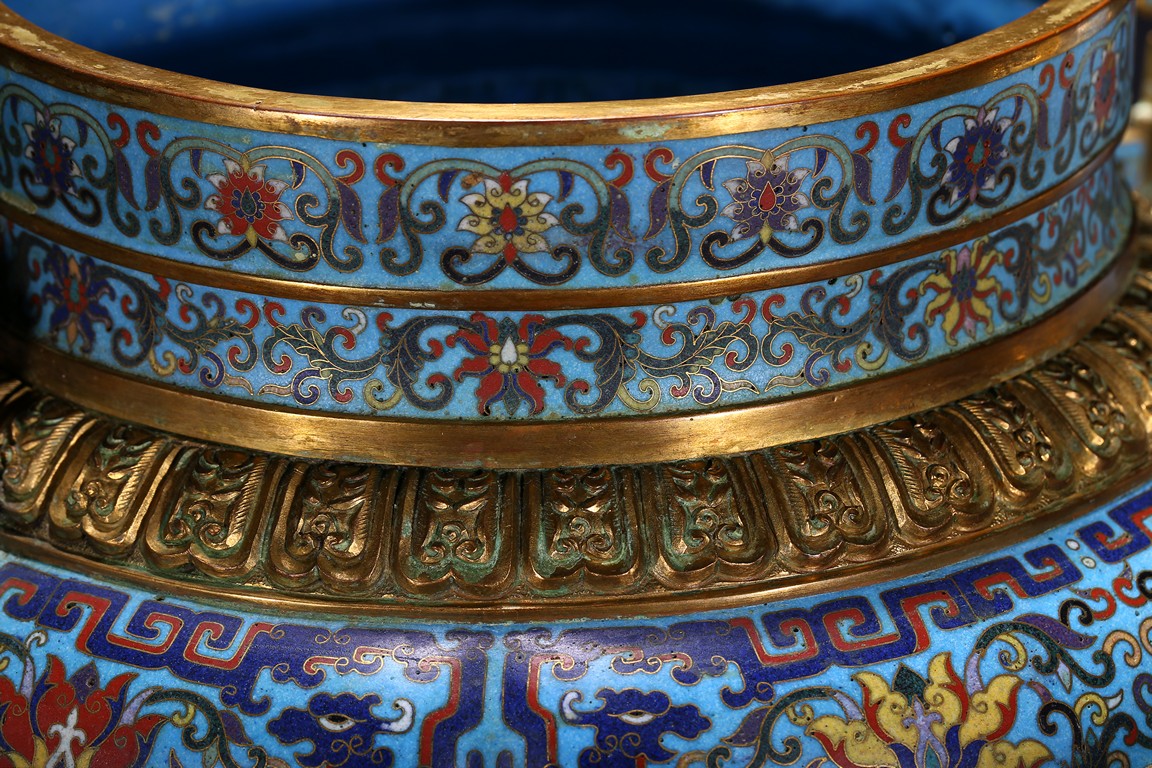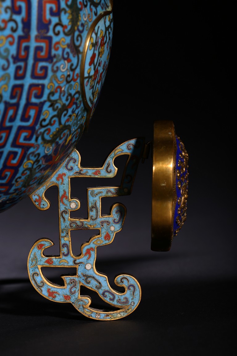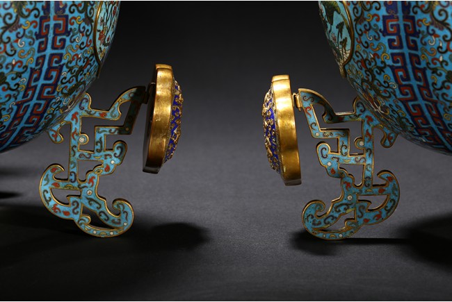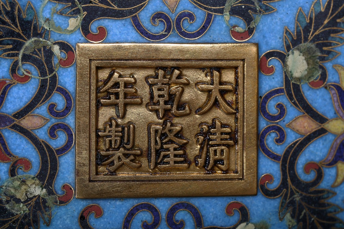 Each supported on three stylized lingzhi branch feet, the body enamelled with two shape cartouche enclosing lotus pond scene reserved on turquoise ground decorated with dense lotus scrolling, flanked by two similar lingzhi handles, the domed cover enamelled with three shape cartouche enclosing shou character and surmounted with a gilt-bronze openwork finial. Base with six character mark. Qing Dynasty period.