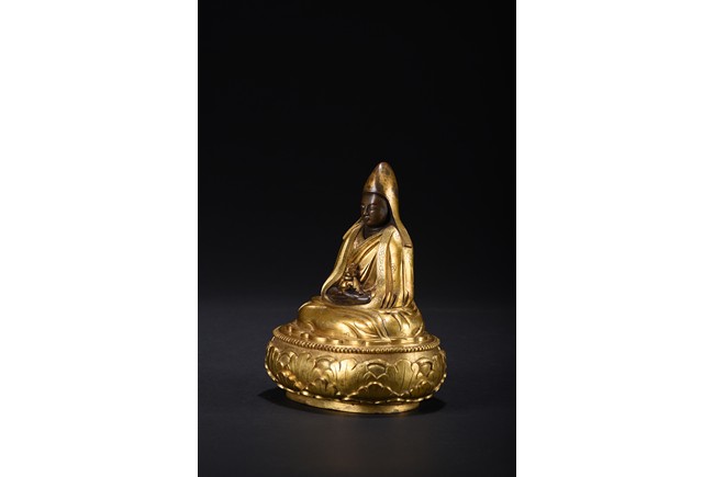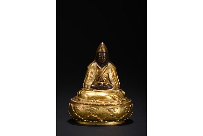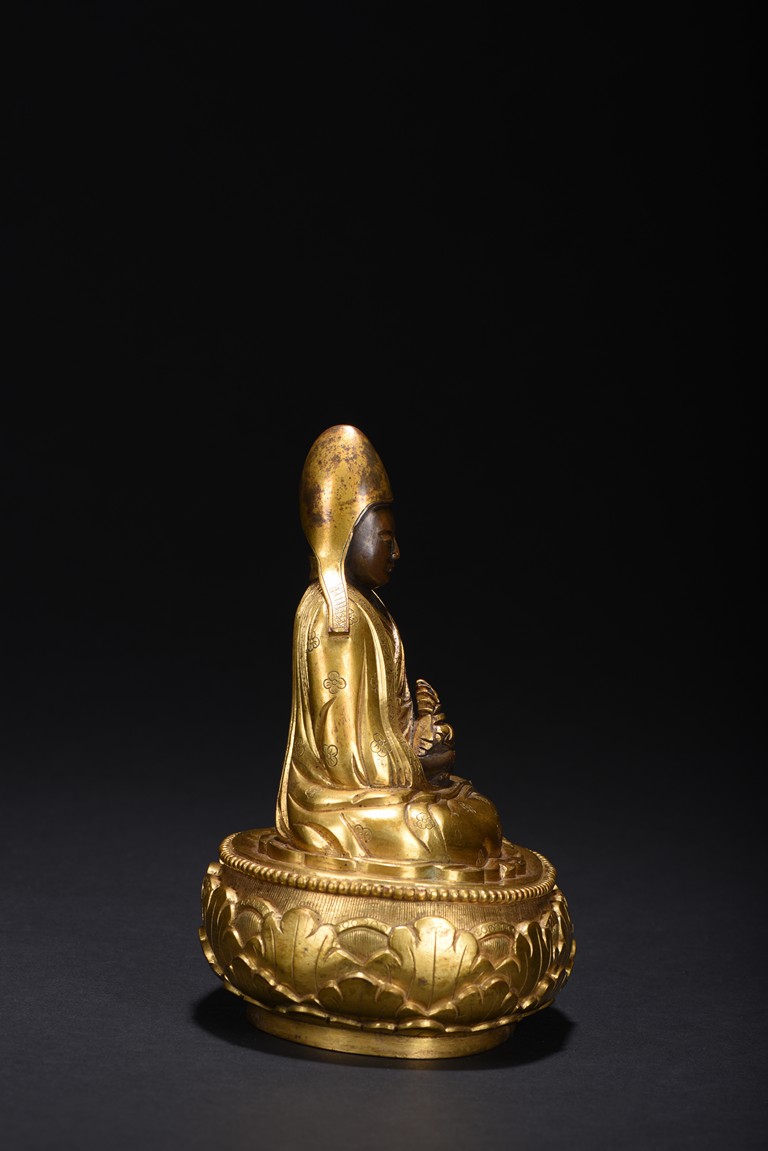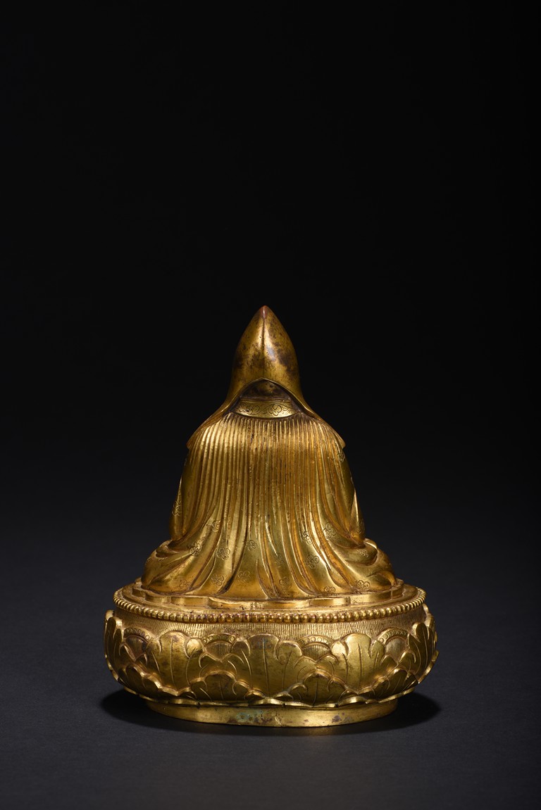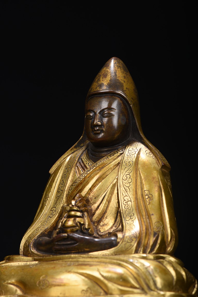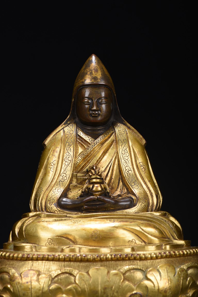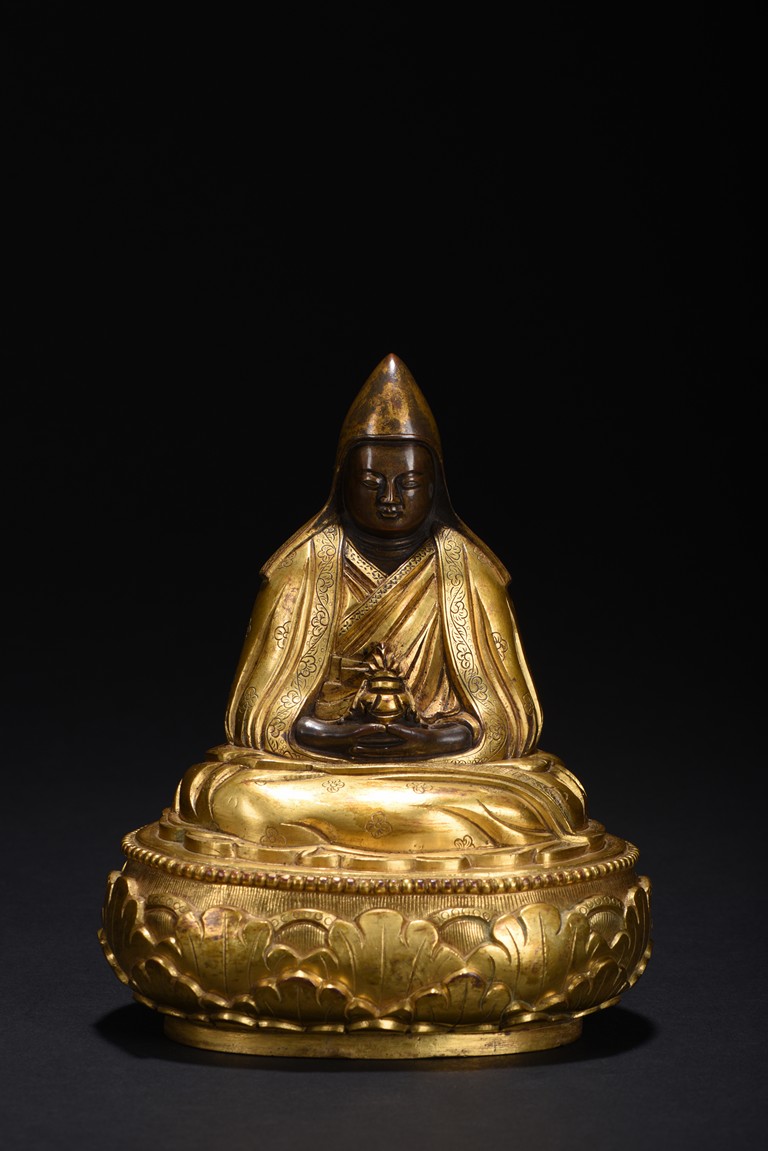 Mongolian zanzibar school. Seated on a lotus flower base, both hands resting on his lap supporting a kalasa, wearing a finely incised robe and mantle covering both shoulders and legs, his head covered with a hat of the Gelugpa school. Base sealed and incised with a double vajra. Qing Dynasty period.