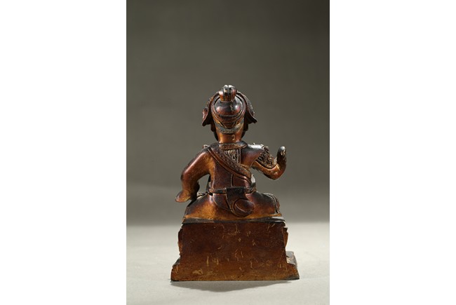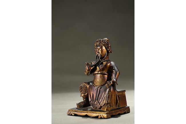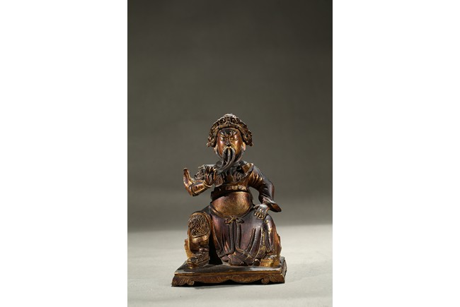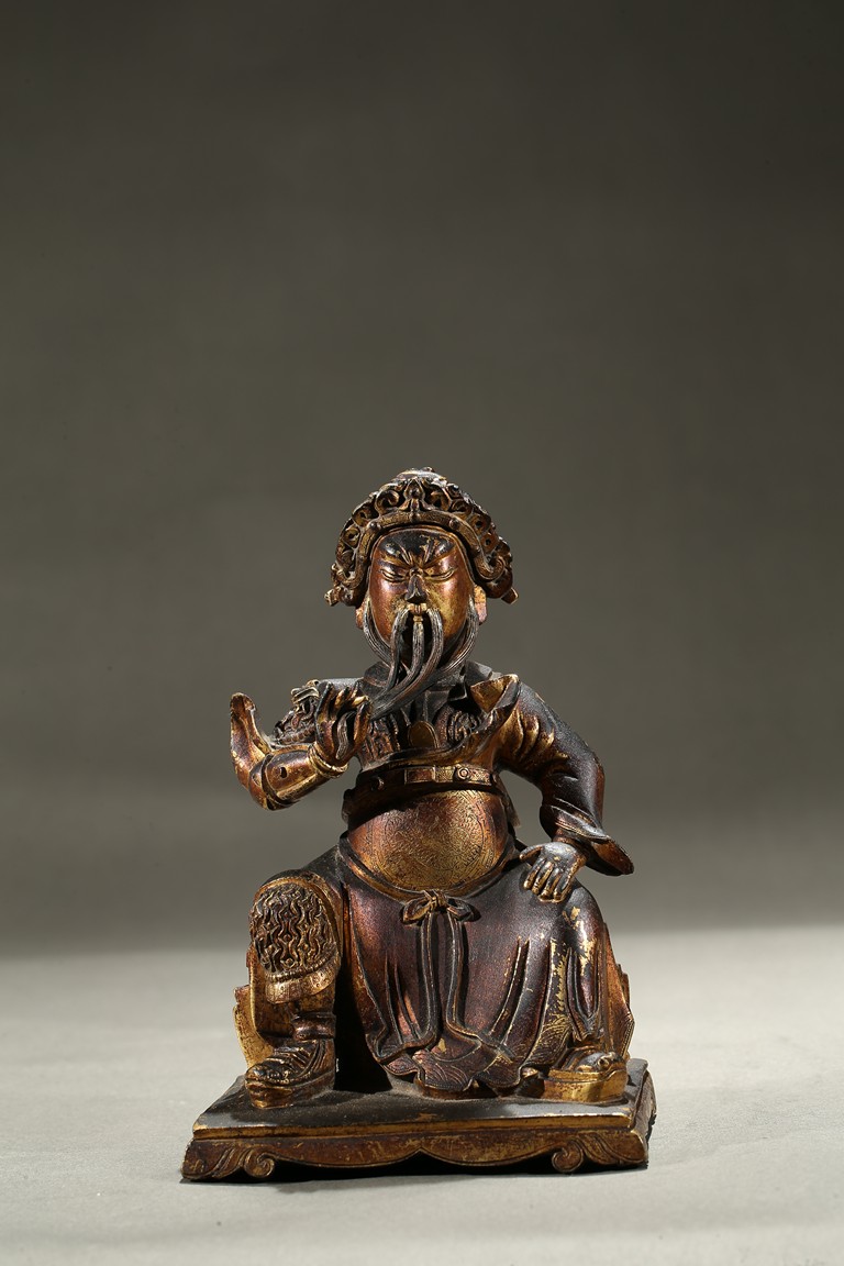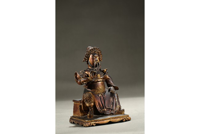 The figure seated on a bench with his right hand raised, wearing a suit of armor beneath flowing robes and an official's cap. Qing Dynasty period.