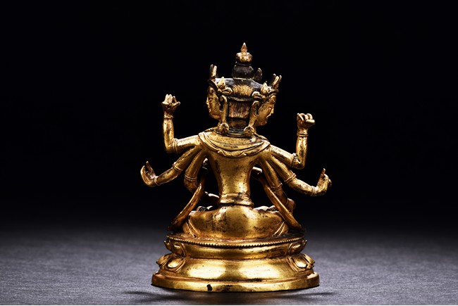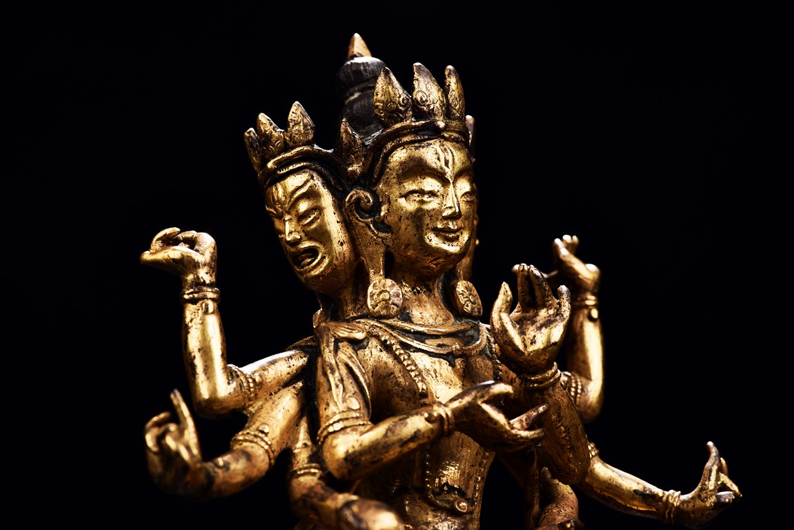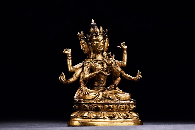 The three headed deity seated in dhyanasana on a double lotus base, the eight arms held in various mudras, dressed in a dhoti with elaborate jewellery, the hair piled up into a chignon crowned with a tiara