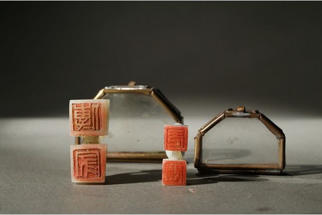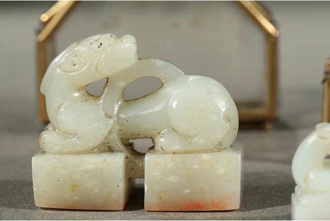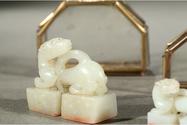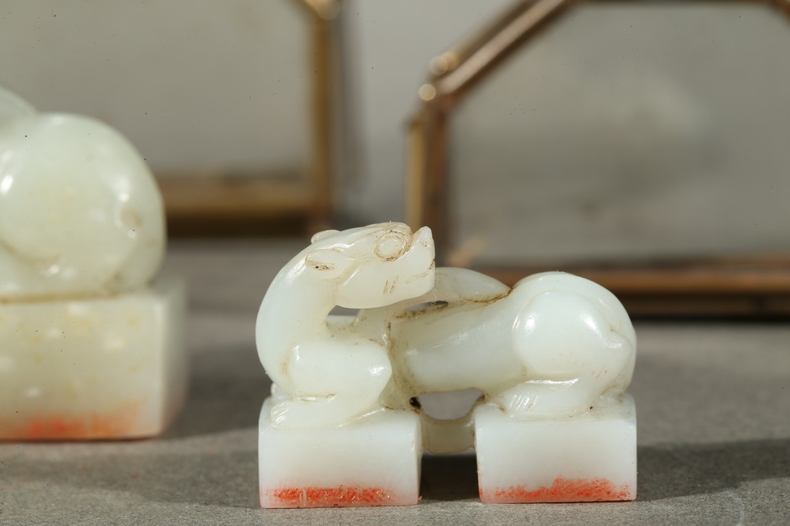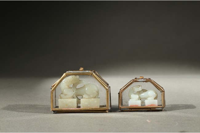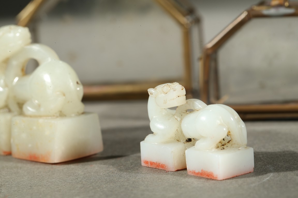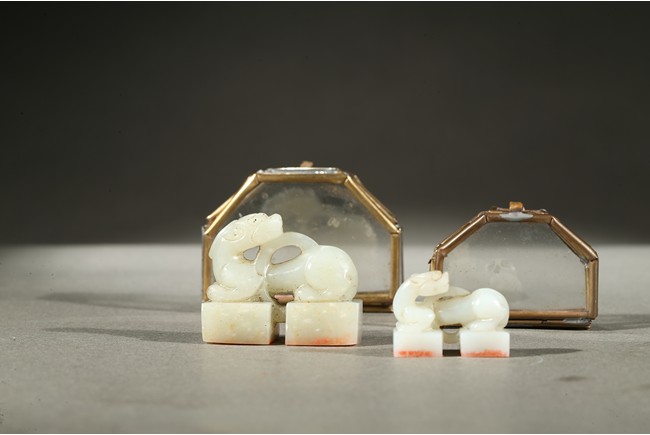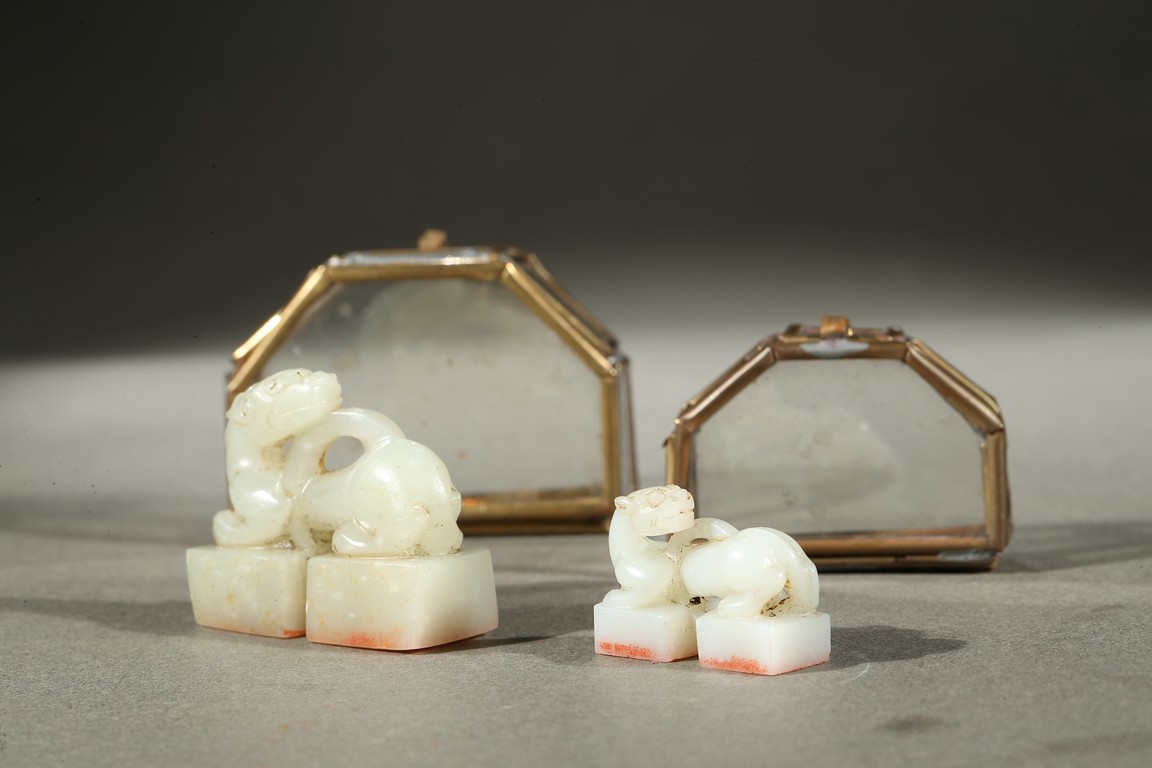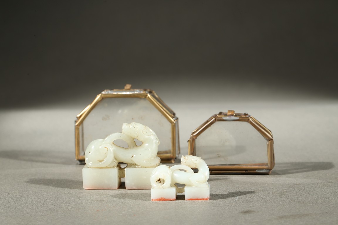 Each carved as a joined square jade seal, surmounted with a mythical beast with head turned back, seal surface with inscriptions, accompanied with an original glass box. Qing Dynasty period.