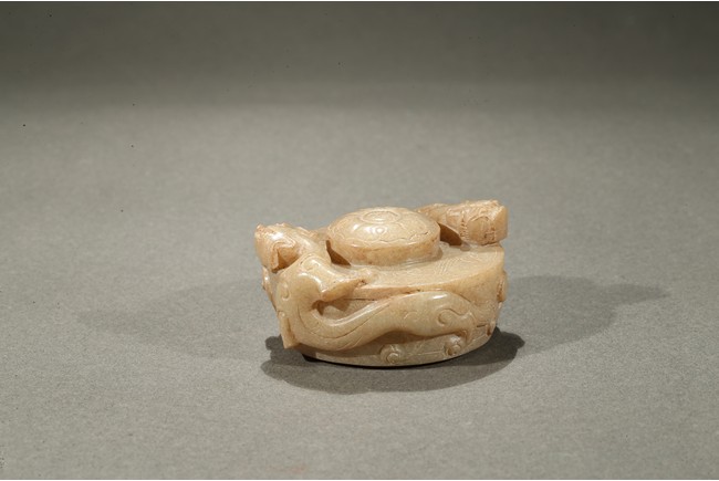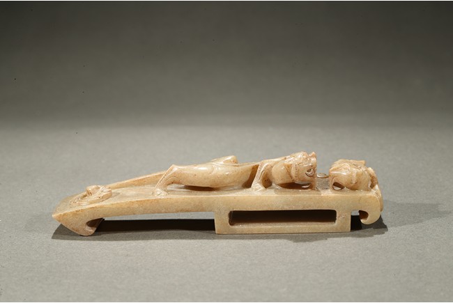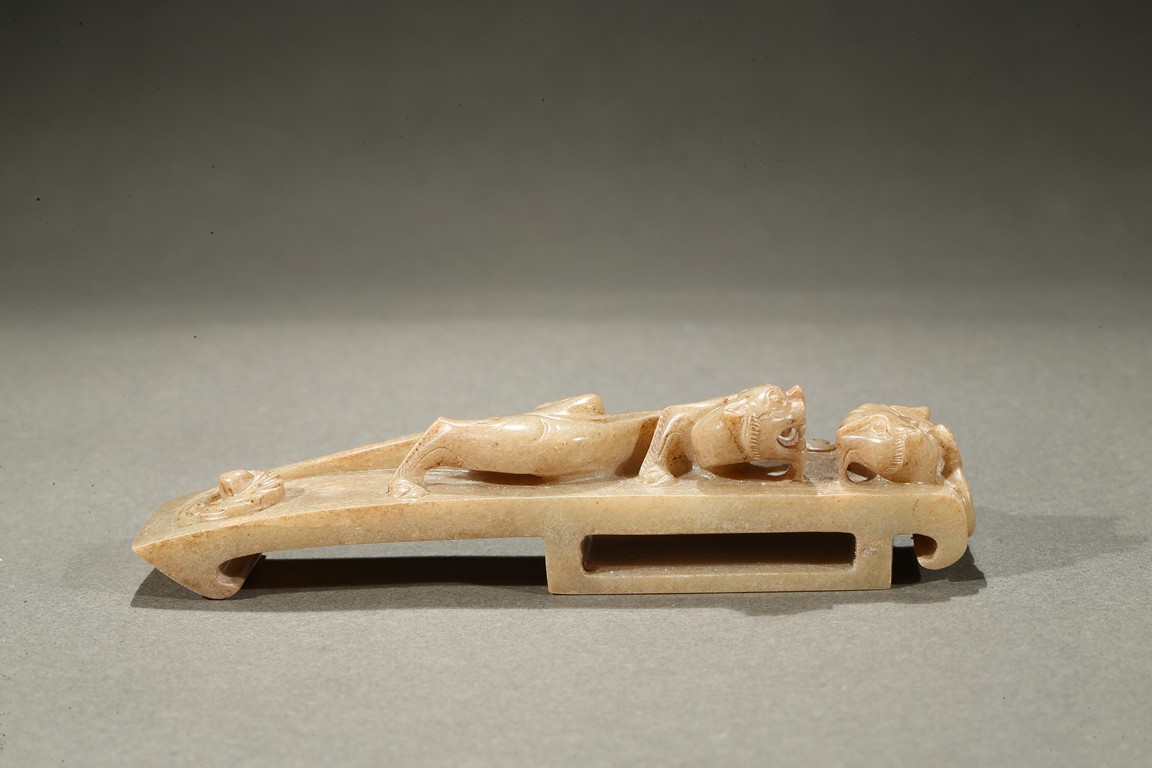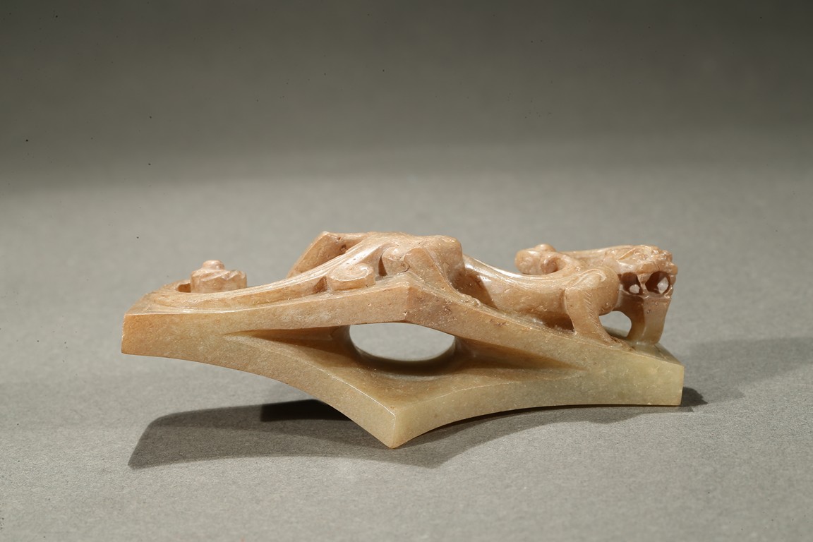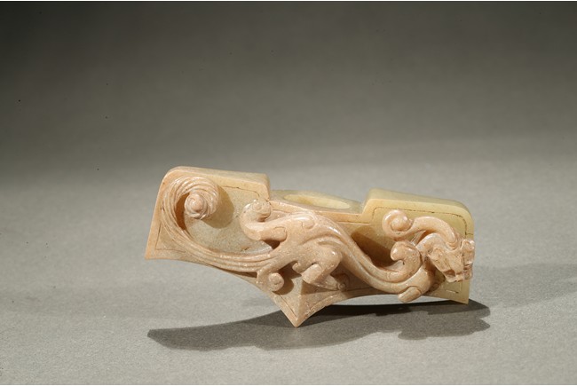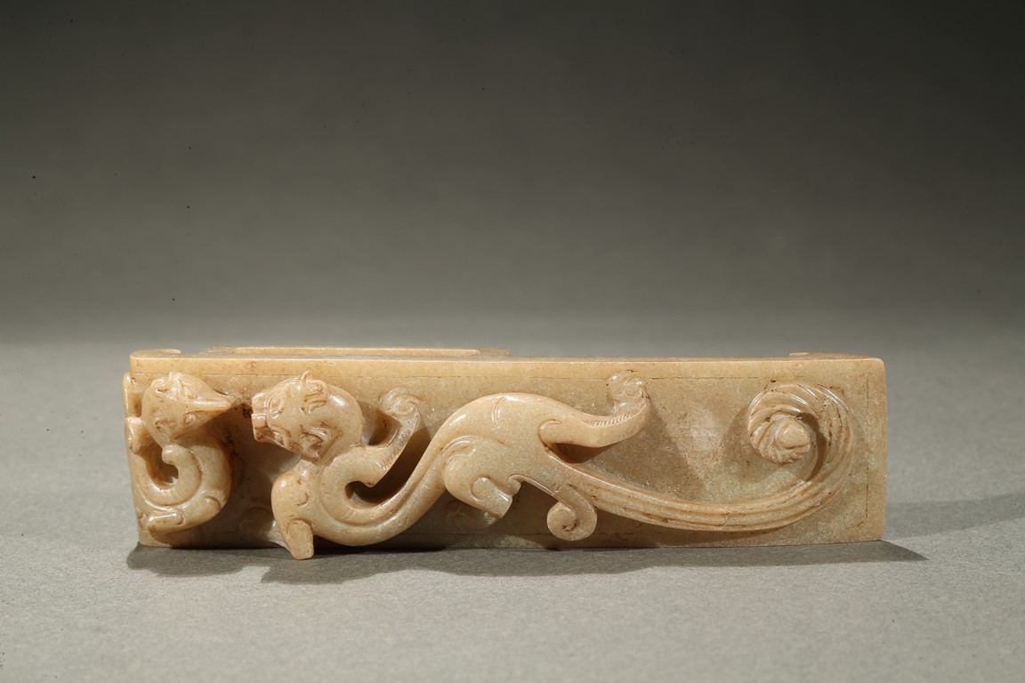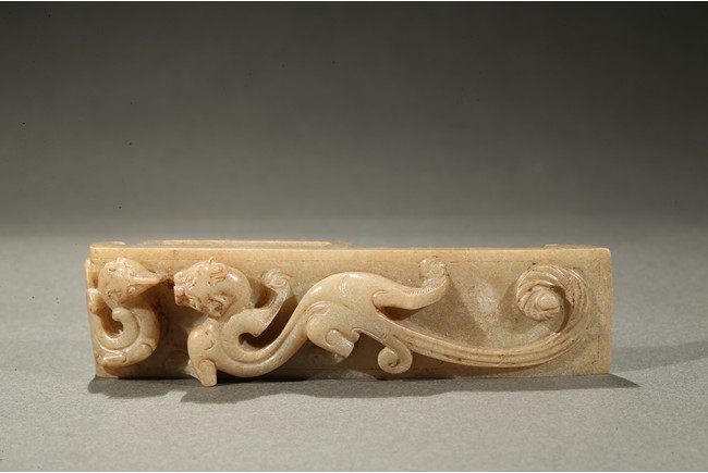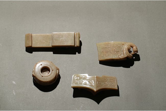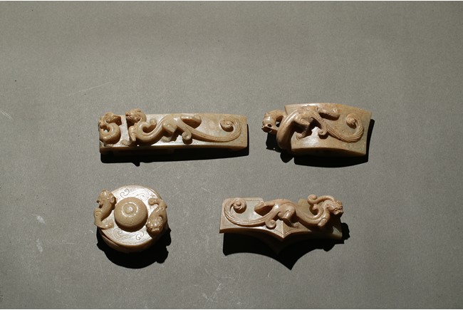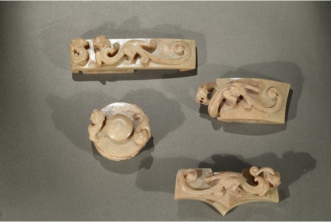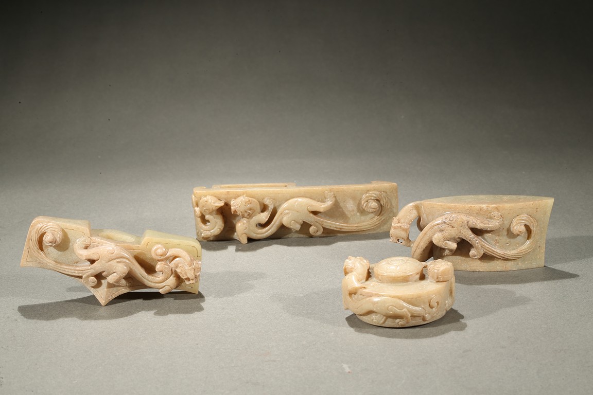 Comprising of four jade carvings including a sword slide, a sword guard, a scabbard chape, and a sword pommel, all carved in relief with chilong design.