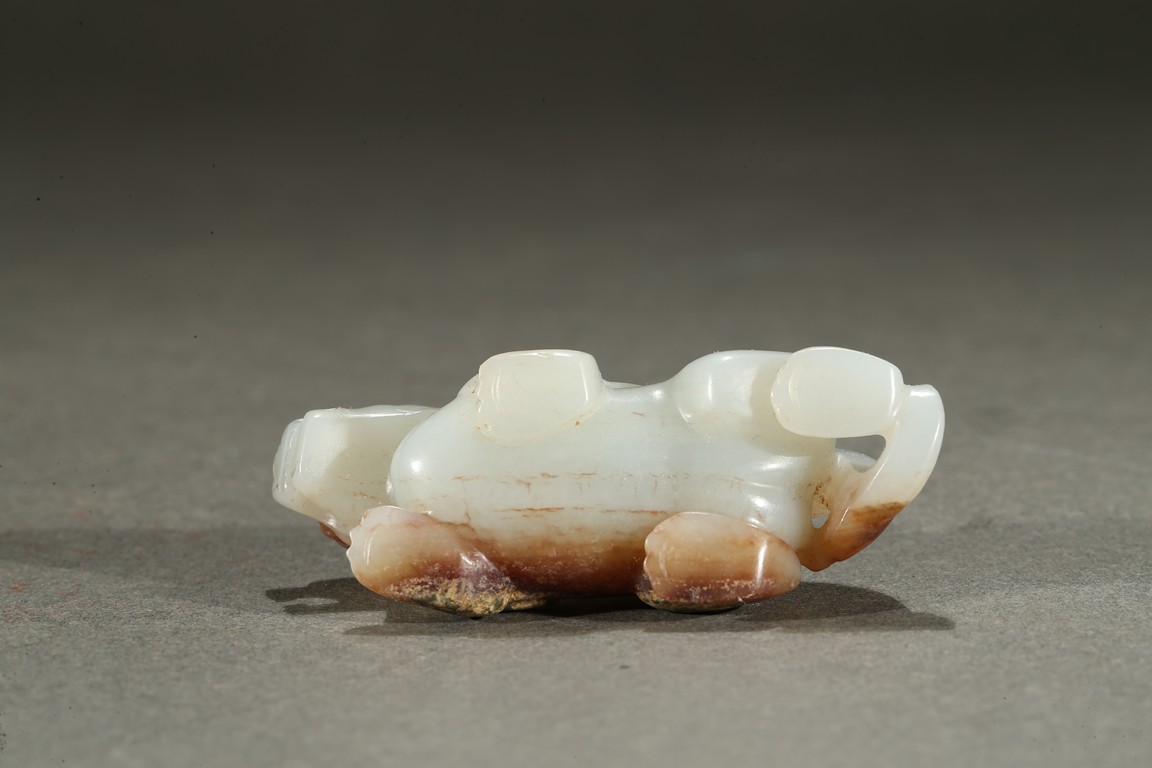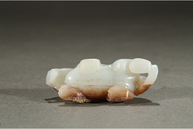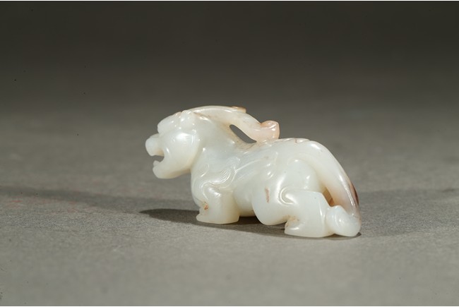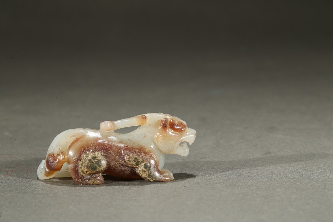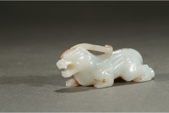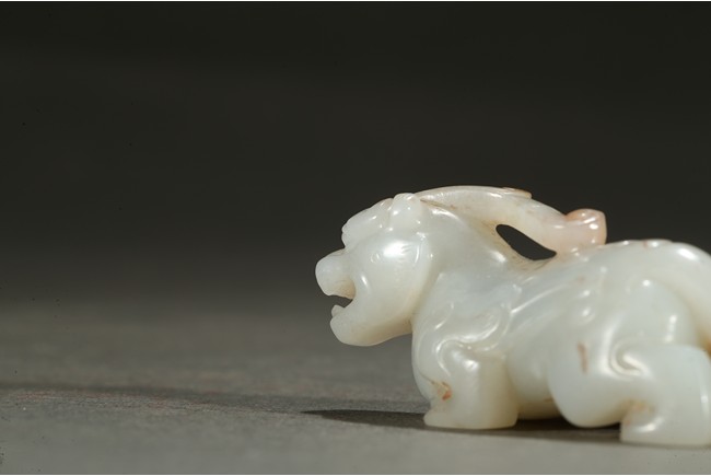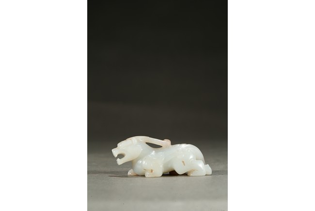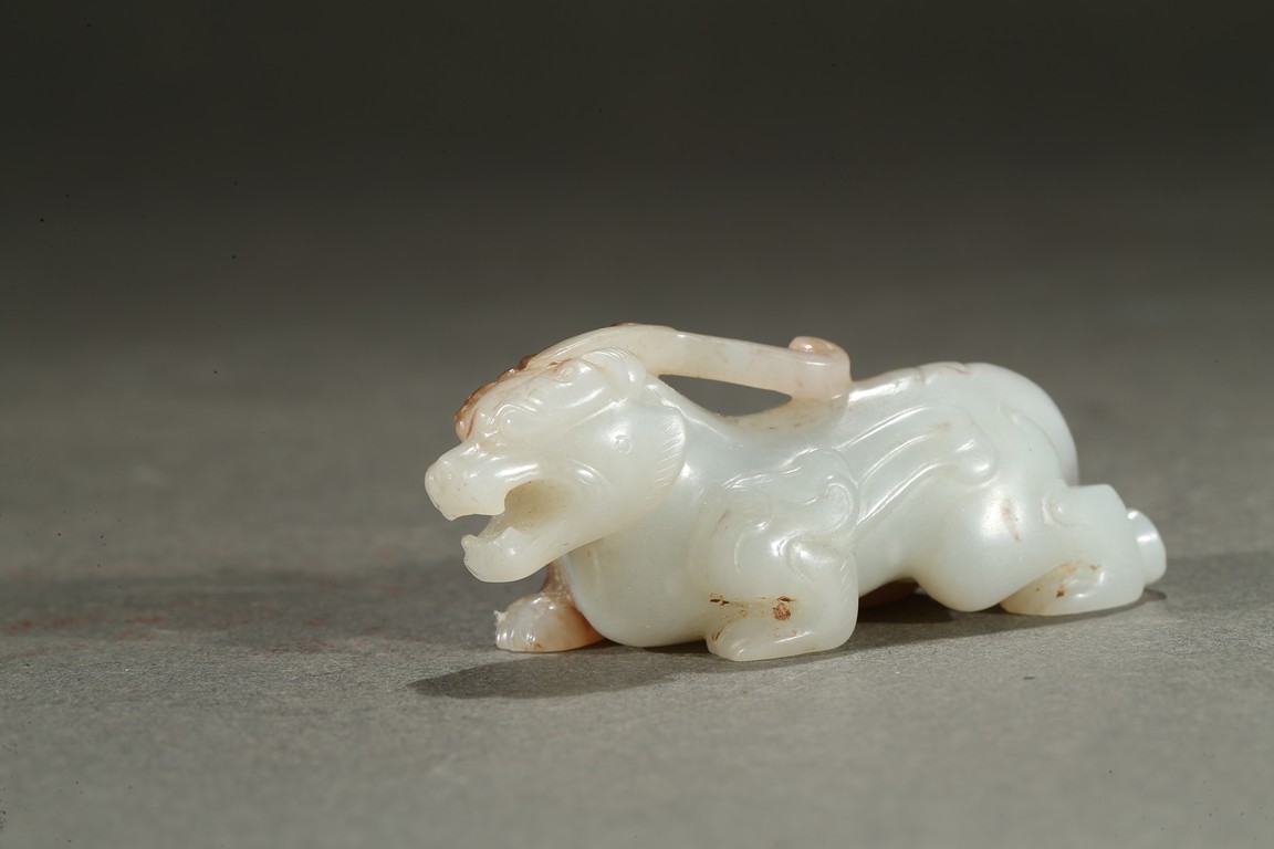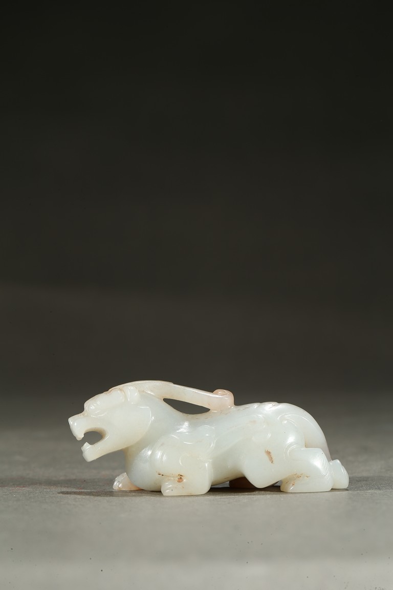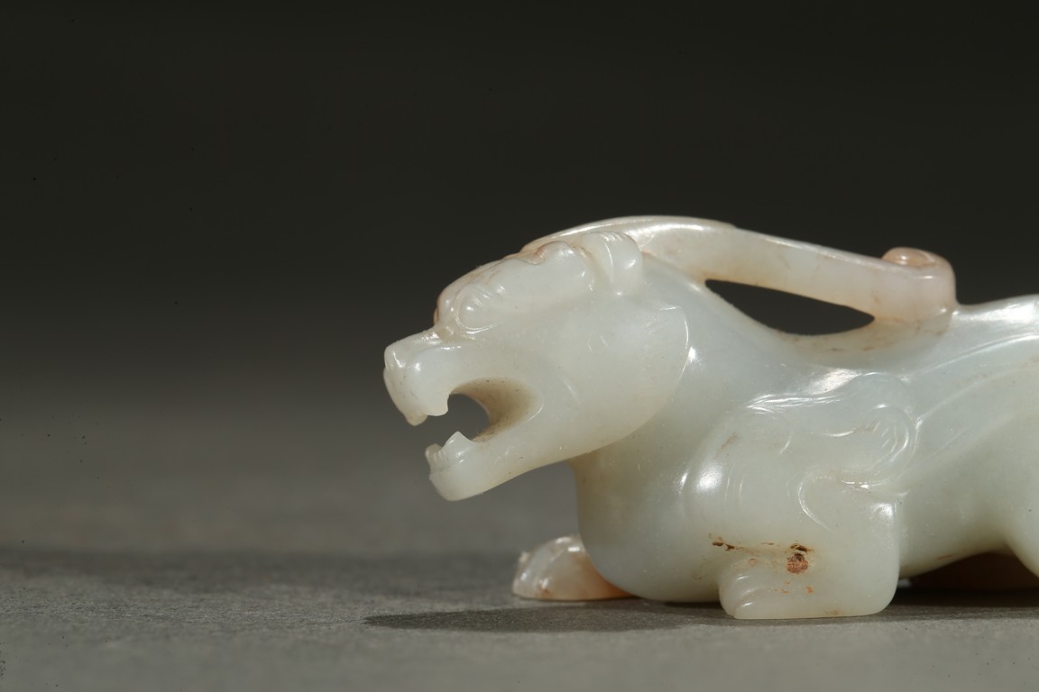 The mythical beast carved in crouching posture, shown menacing with open mouth baring its teeth and detailed with single curved horn, with curved contours repeated at wings, haunches and tail. Han Dynasty period.
