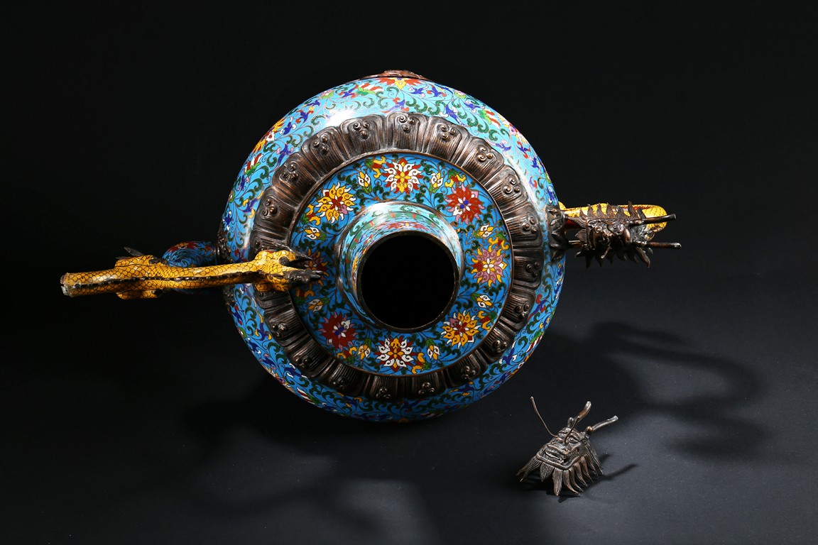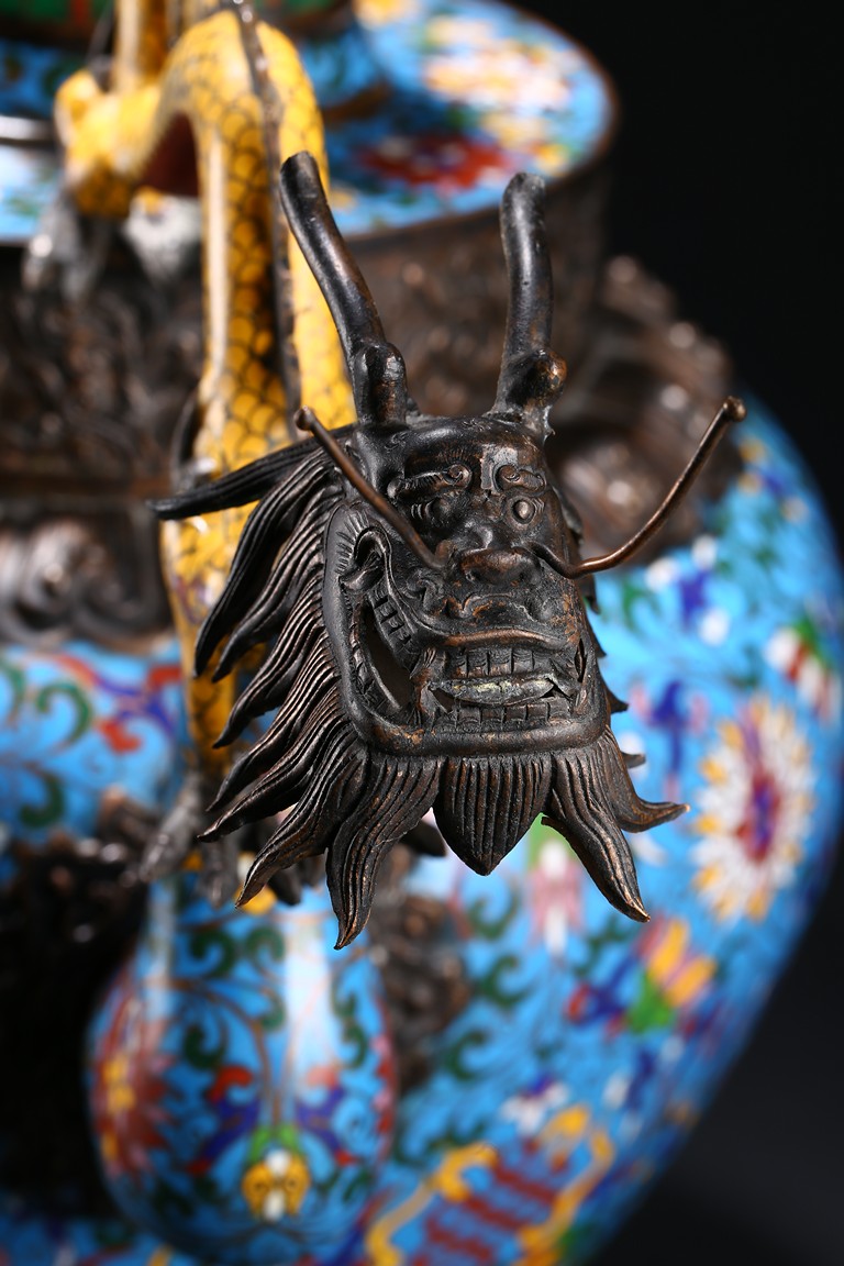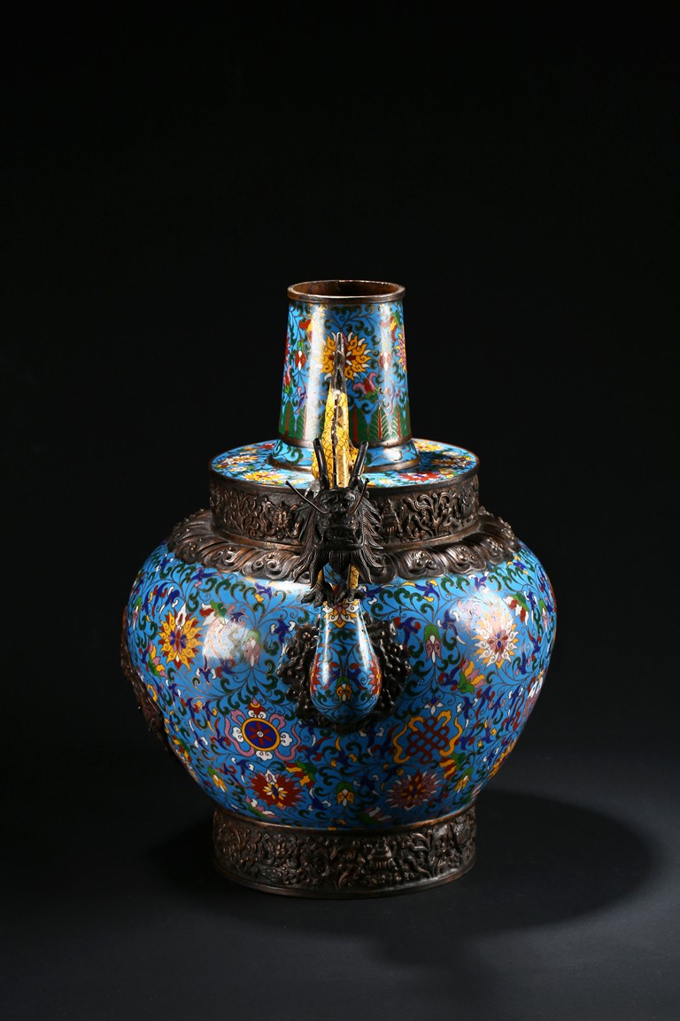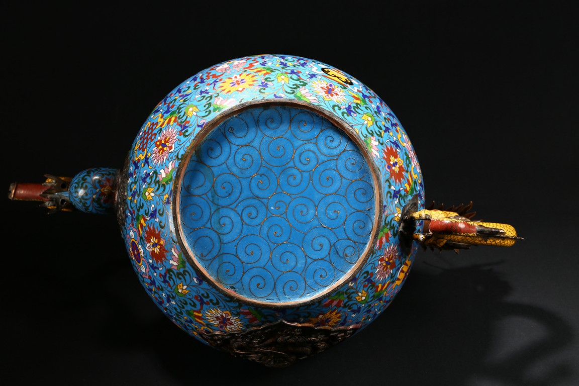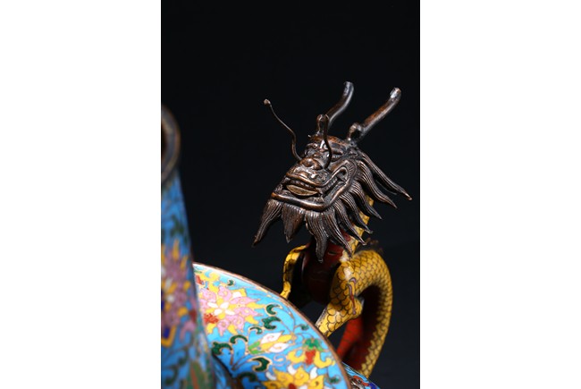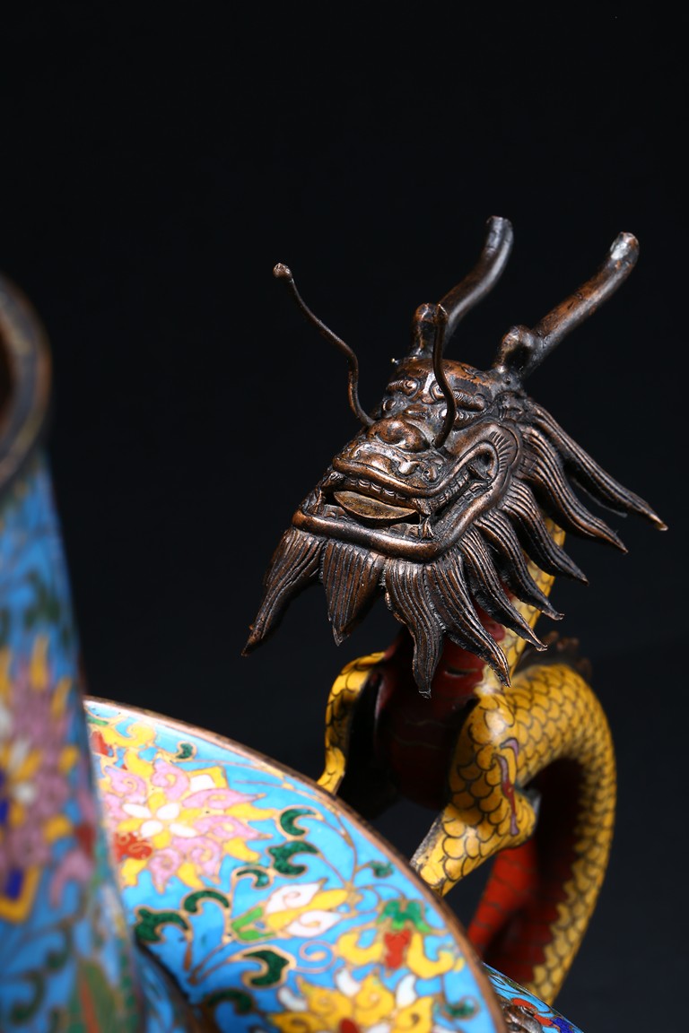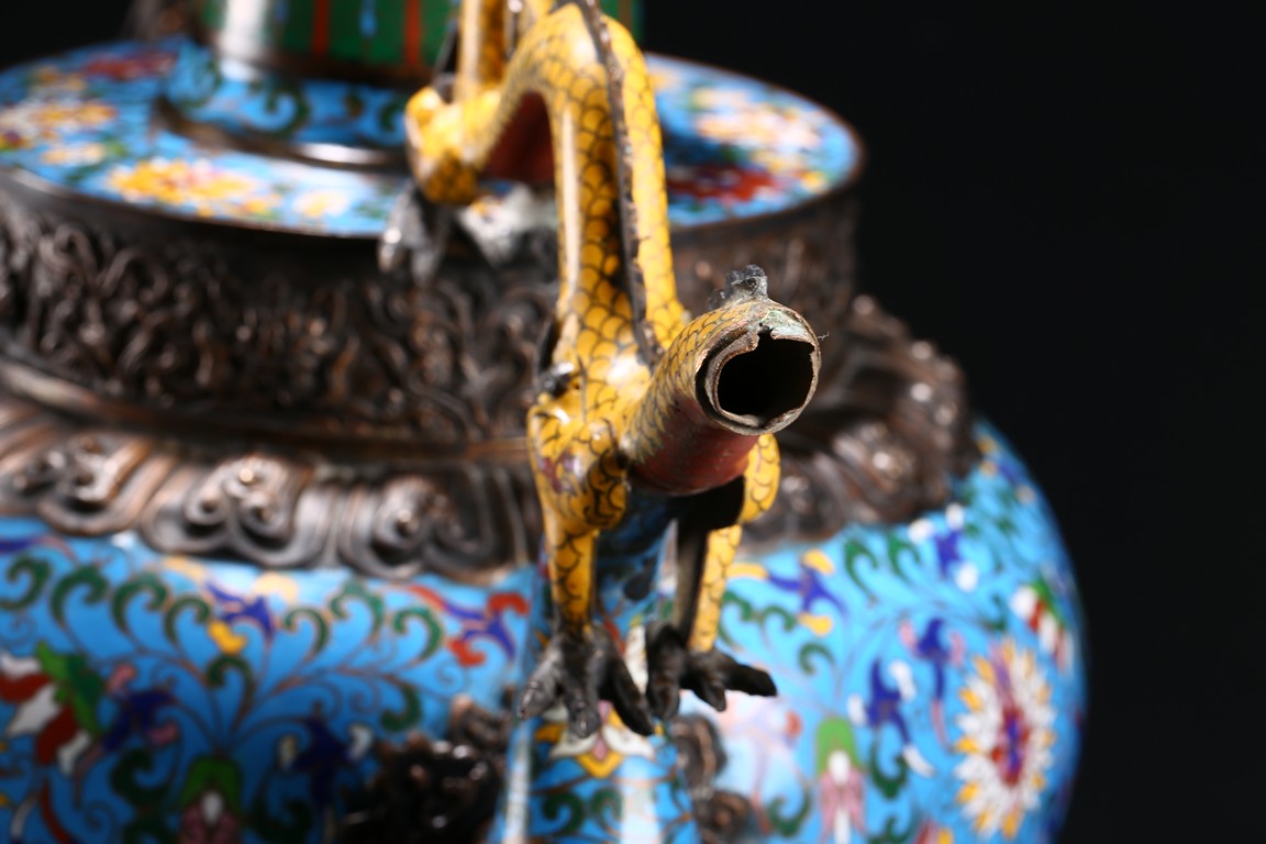 Of bulbous form, the body raises to a straight shoulder and long cylindrical neck, the body finely enamelled with lotus scrolls all against a bright turquoise ground, the front and reserve with raised dragon repousse panel, all below a raised lotus band encircling the shoulder, flanked by a pair of yellow enamelled curled dragon handle to one side, the other one covering the spout with detachable head. Late Qing Dynasty period.