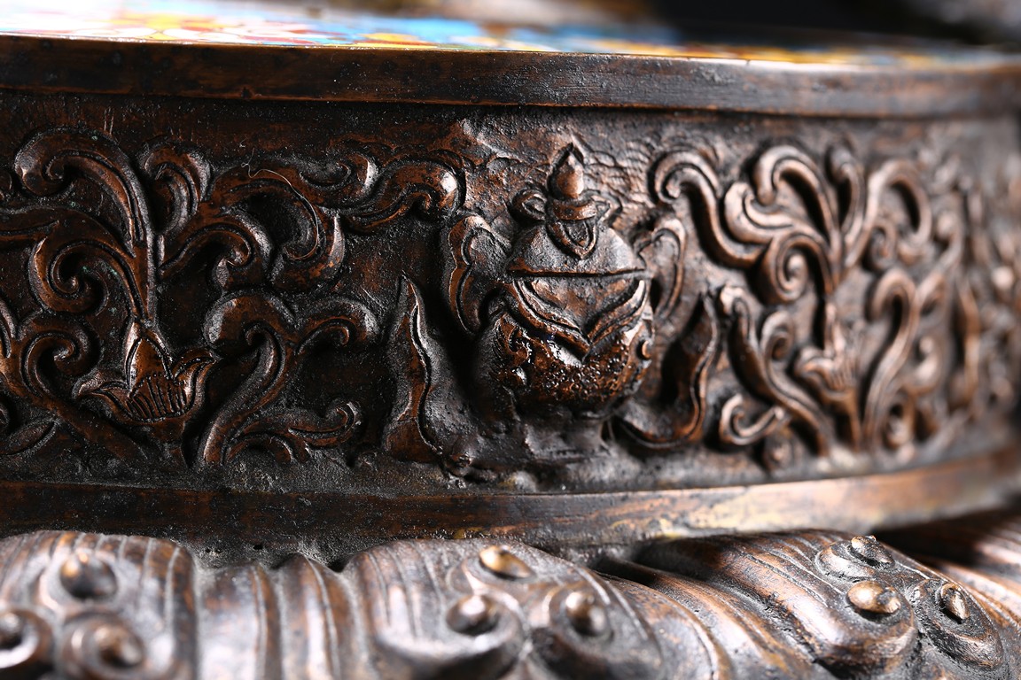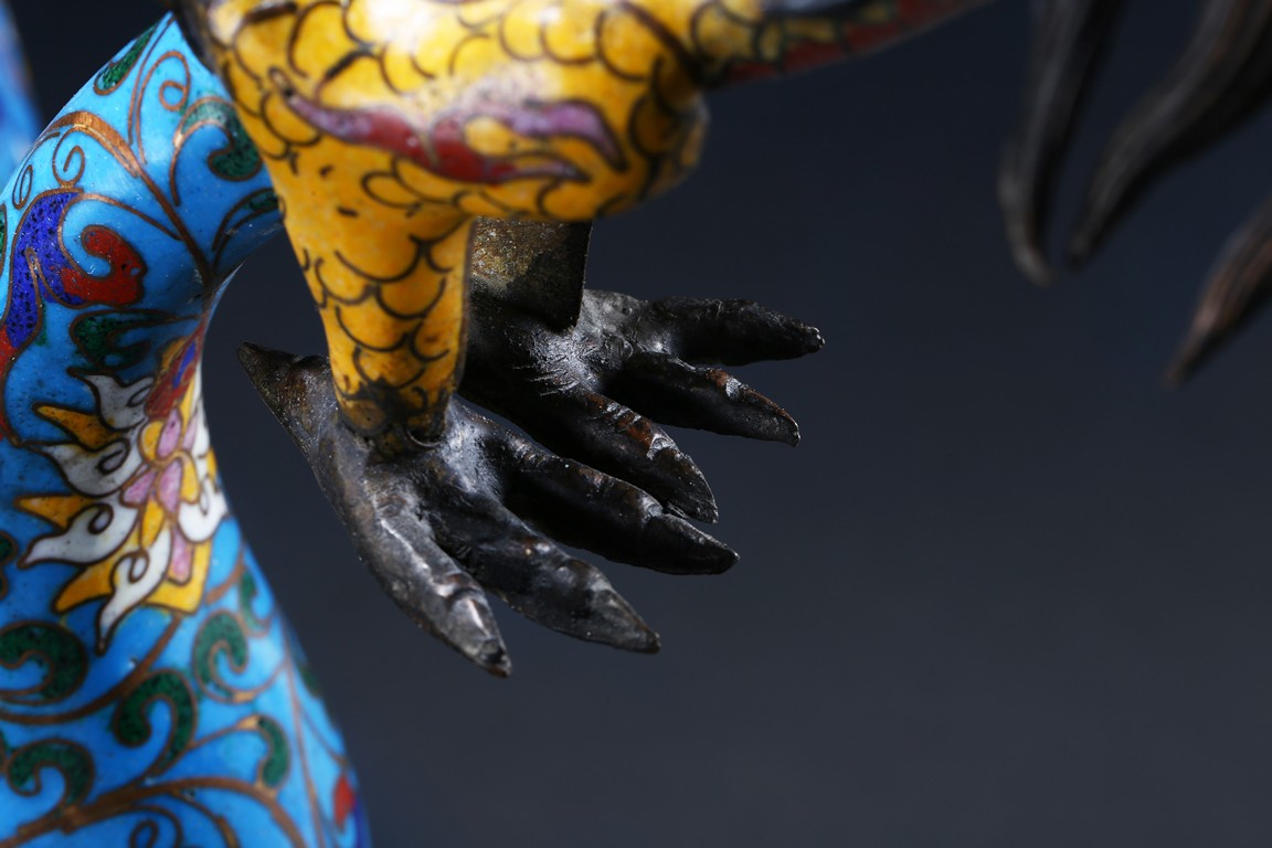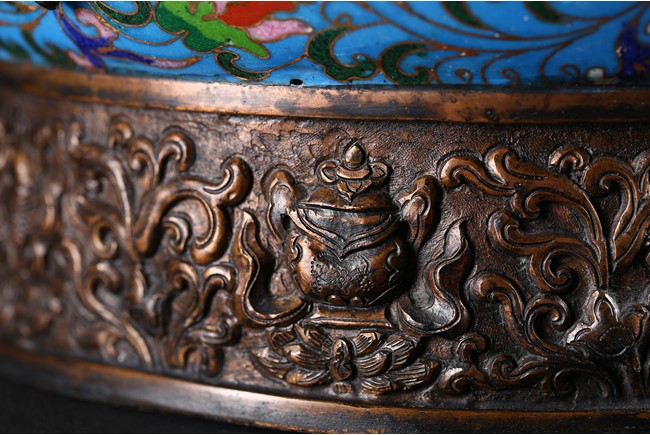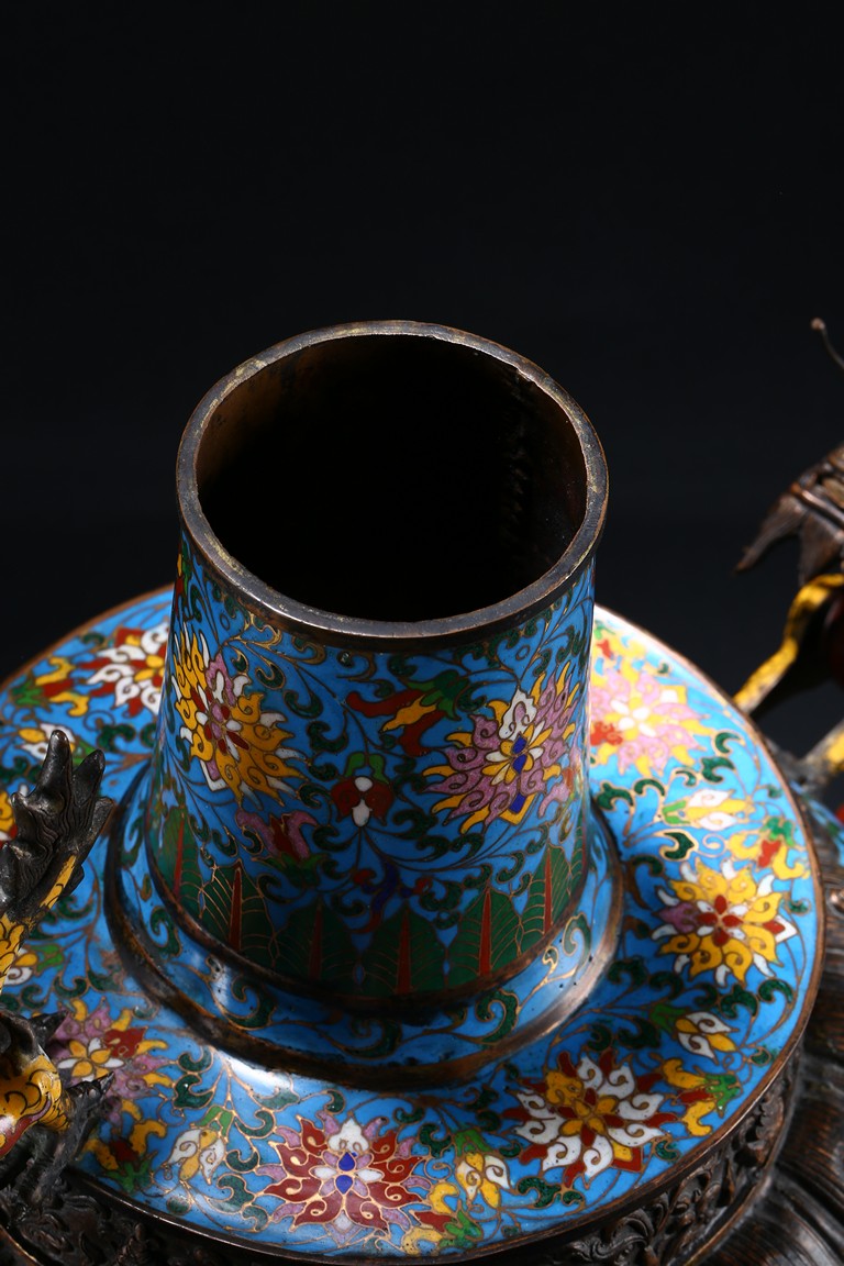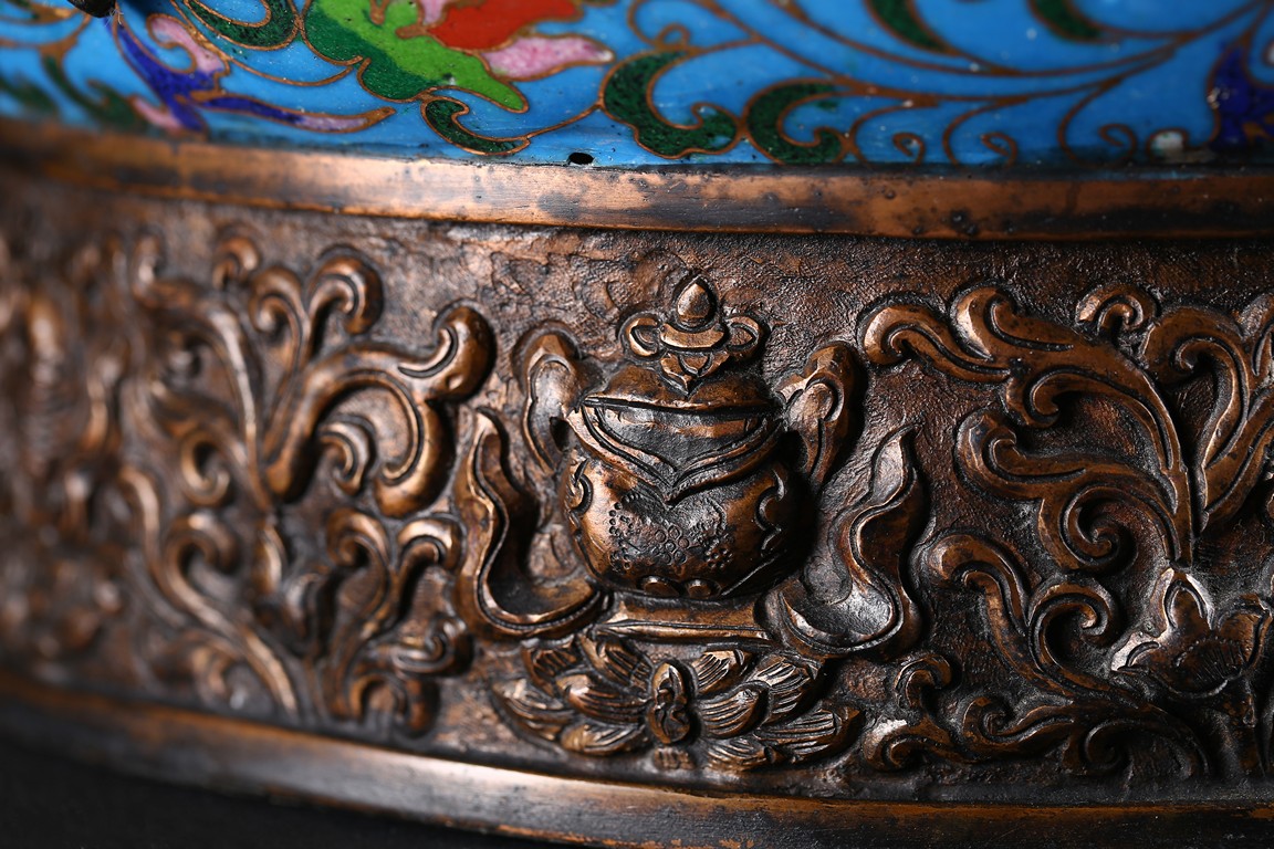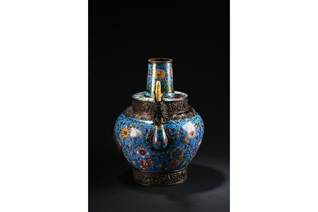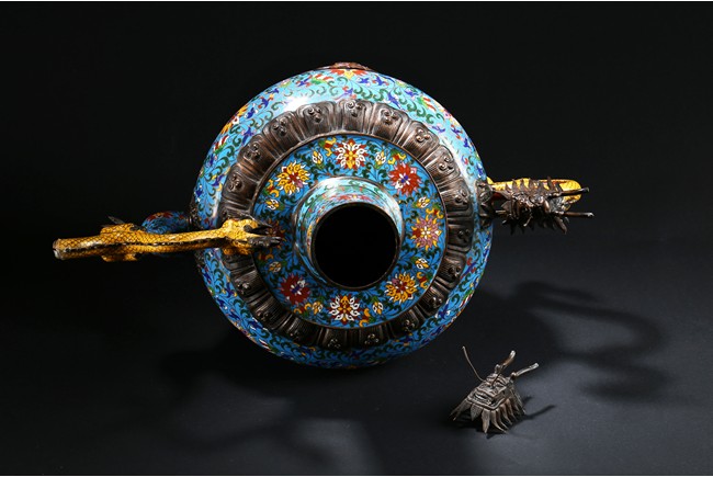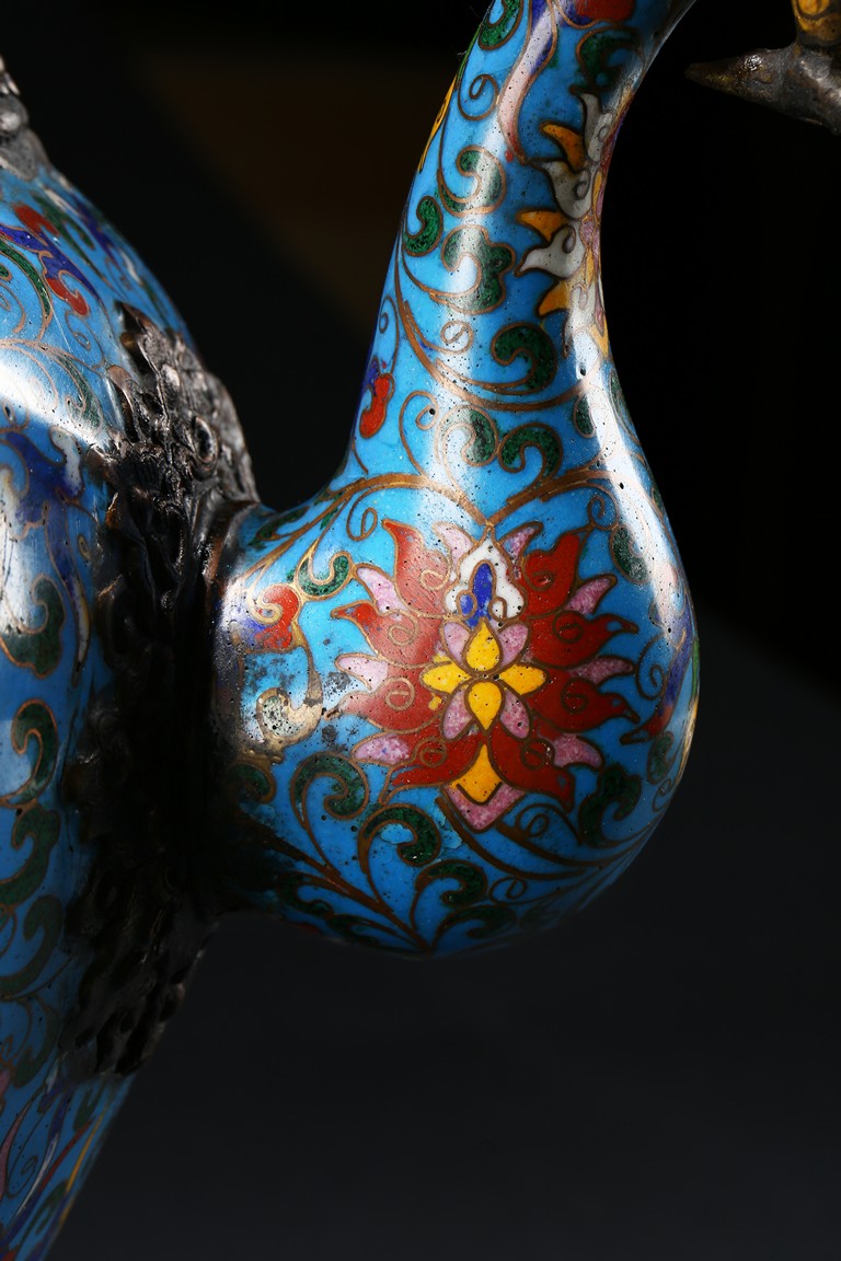 Of bulbous form, the body raises to a straight shoulder and long cylindrical neck, the body finely enamelled with lotus scrolls all against a bright turquoise ground, the front and reserve with raised dragon repousse panel, all below a raised lotus band encircling the shoulder, flanked by a pair of yellow enamelled curled dragon handle to one side, the other one covering the spout with detachable head. Late Qing Dynasty period.