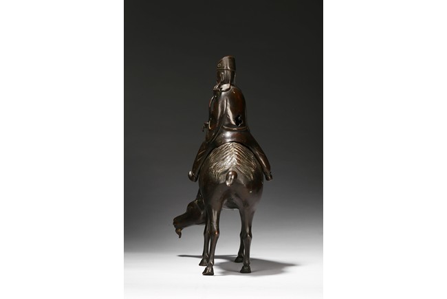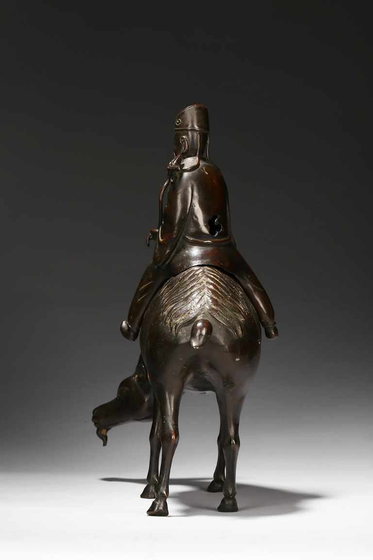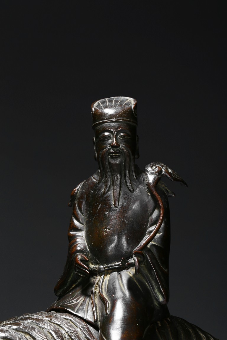 The cast figure with a detachable cover, cast in the form of the immortal elderly figure, dressed in long loose robes and wearing official's hat, with left hand holding a long ruyi scepter, fitted to the back of the hollow ram standing foursquare. Ming Dynasty period.