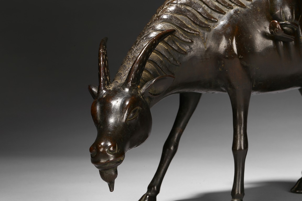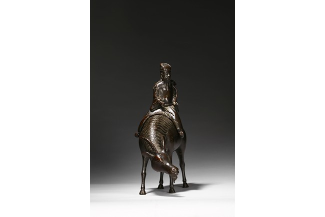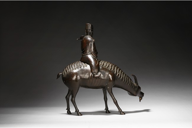 此仙人與羊分開鑄造,羊形態逼真自然,頸朝下伸作停歇狀。羊背上騎一仙人為香熏頂蓋,仙人眉眼,鼻唇,處處匠心所具,工藝細膩精巧,人物造型生動而不誇張,神態把握極其準確。香熏包漿古樸、品相完好,銅質細膩,神韻四溢,頗為難覓。