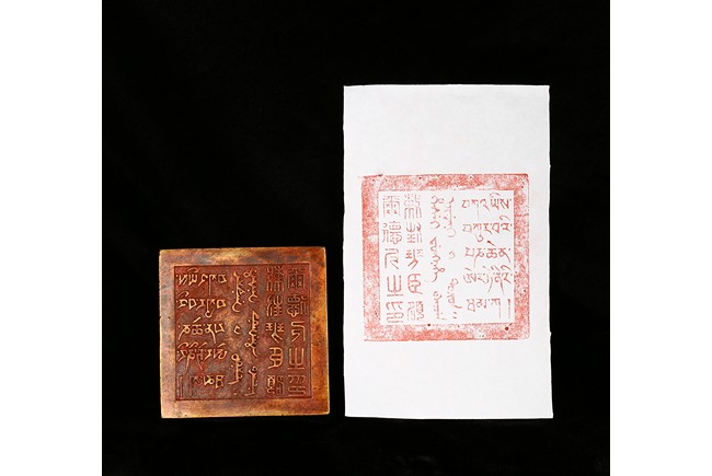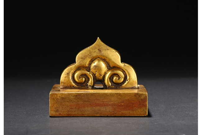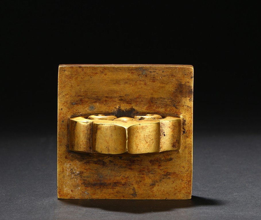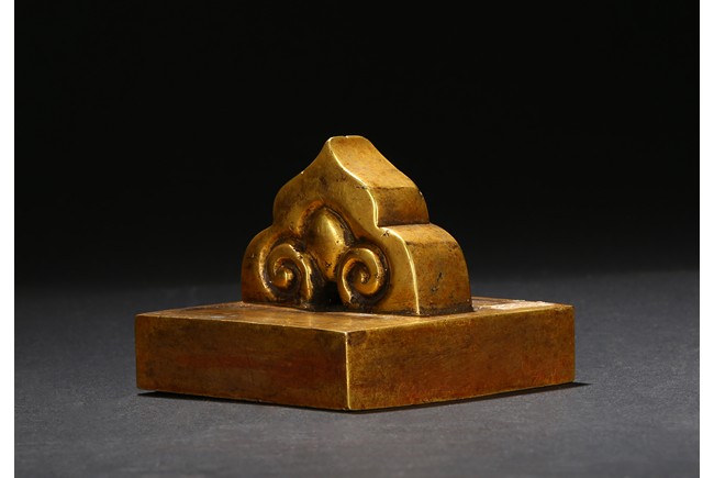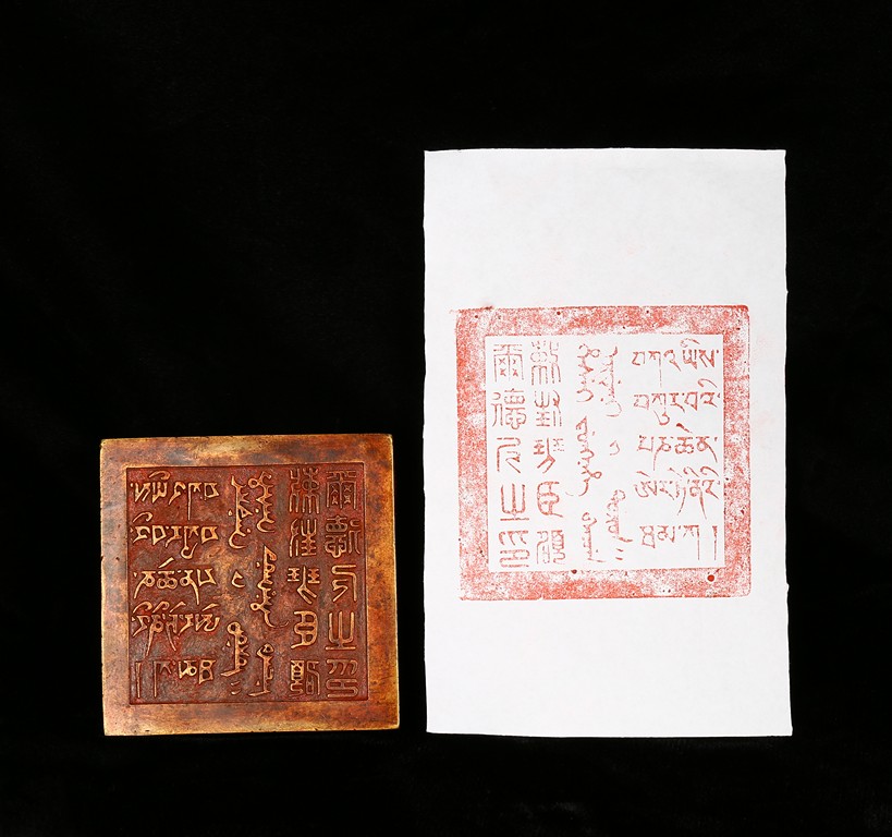 The seal of square section, the top surmounted with a ruyi-shape finial, the seal face cast in relief with Chinese, Manchurian, and Tibetan inscription.