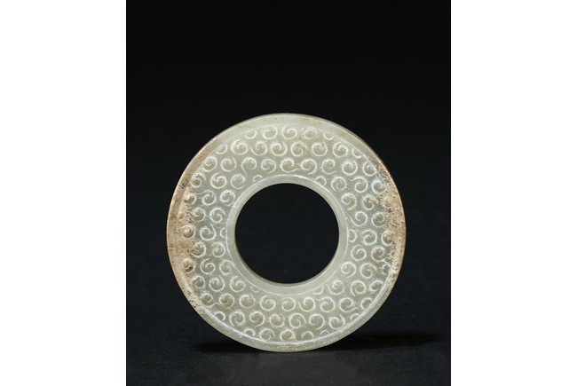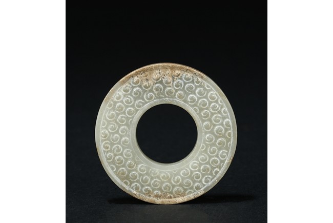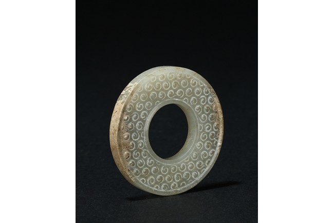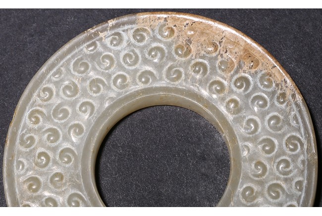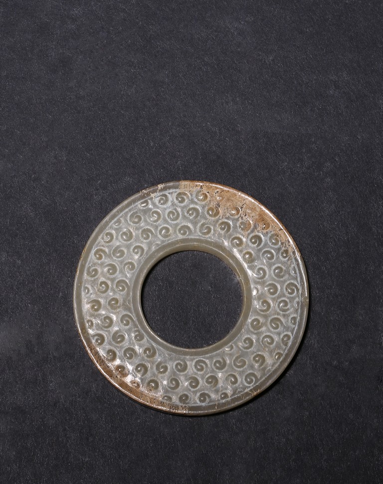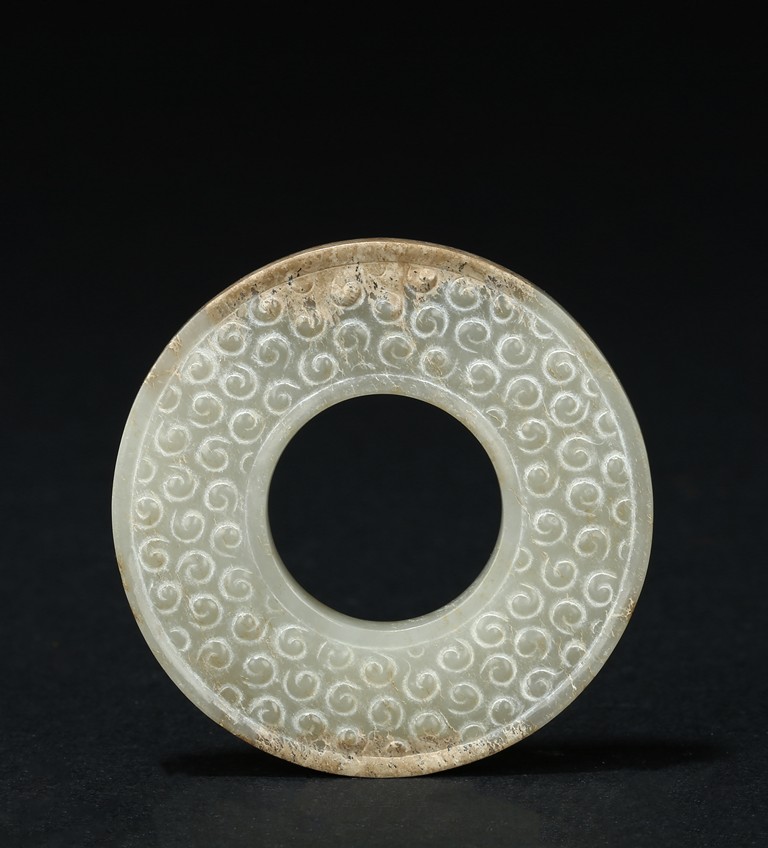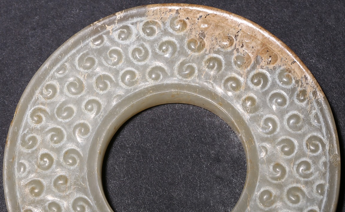 Carved to both sides with the 'grain' pattern, the stone of a pale green tone with minor calcification. Warring State period.