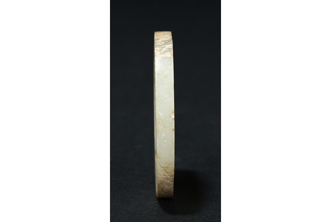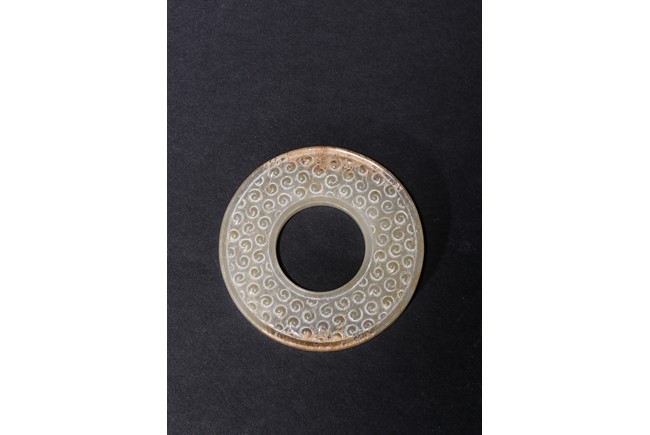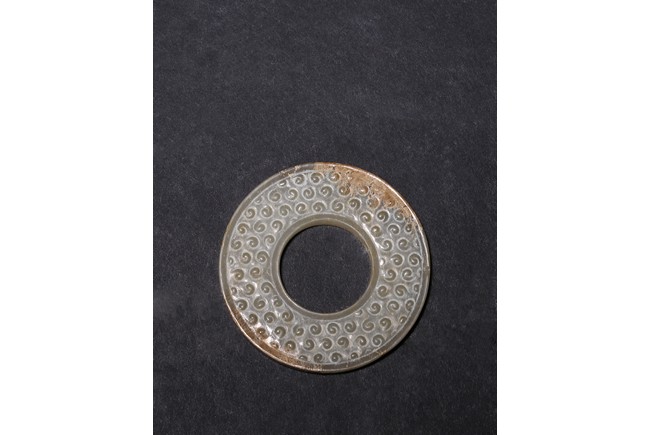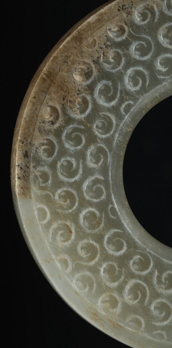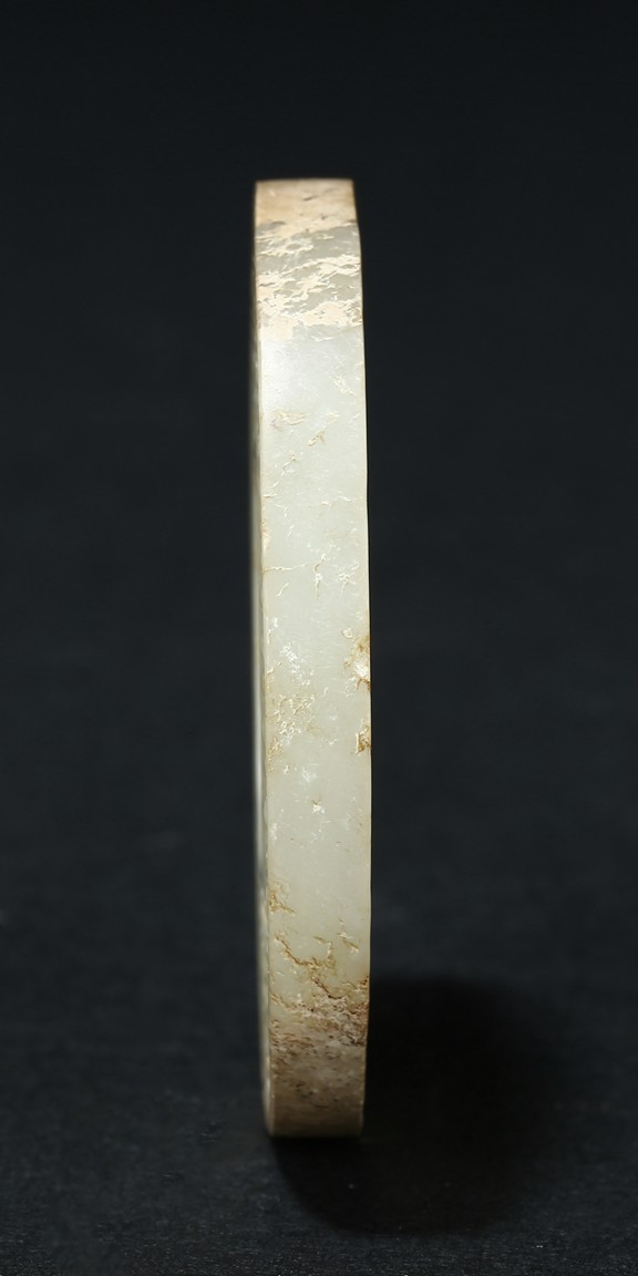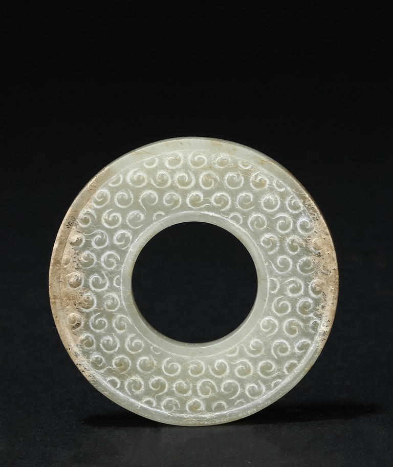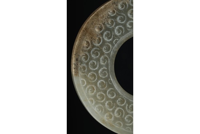 Carved to both sides with the 'grain' pattern, the stone of a pale green tone with minor calcification. Warring State period.