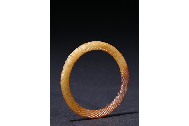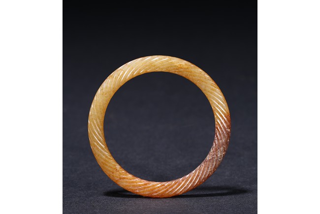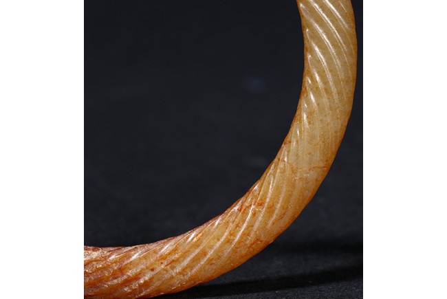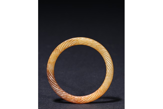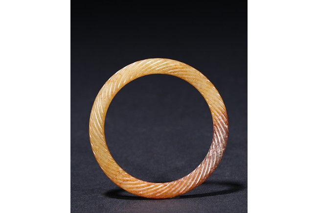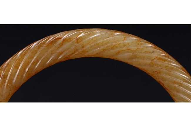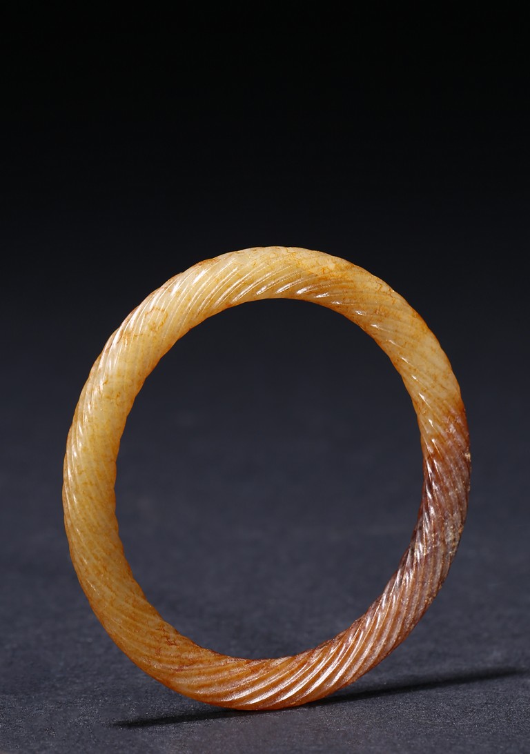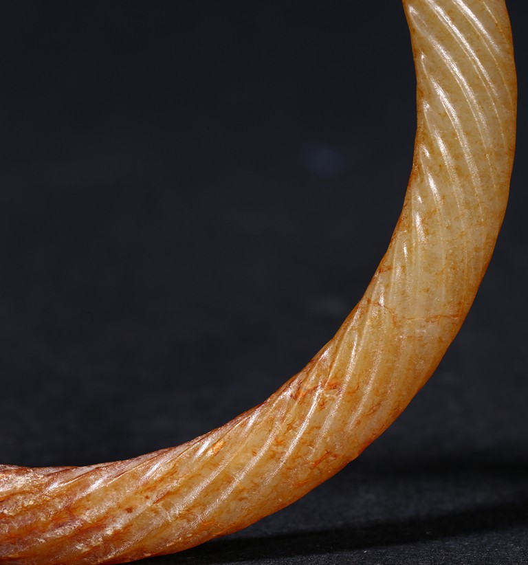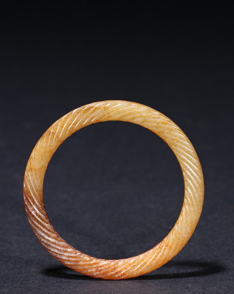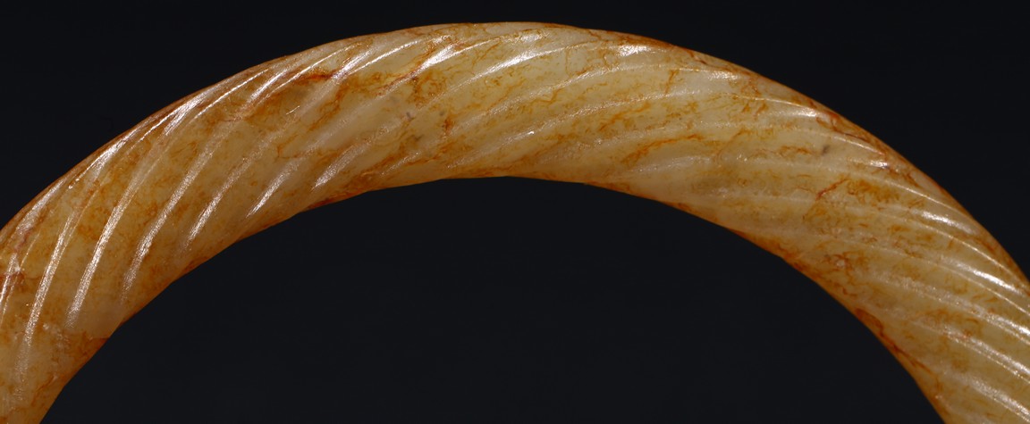 Of circular form, exquisitely carved with twisted rope design, the stone displaying a translucent russet-celadon tone. Warring State period.