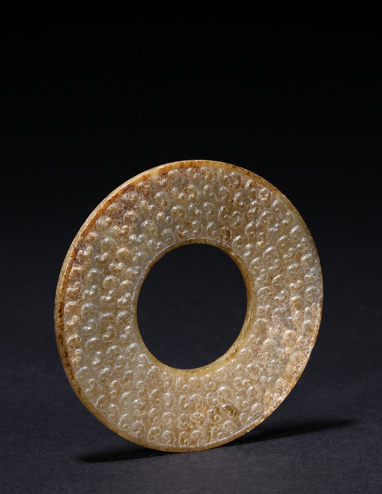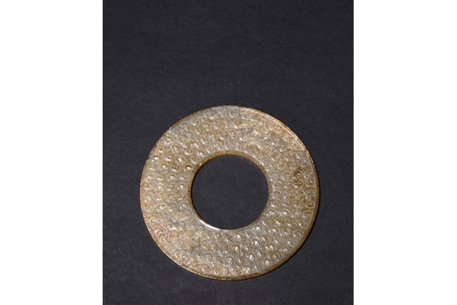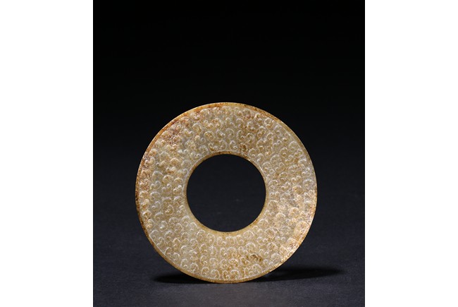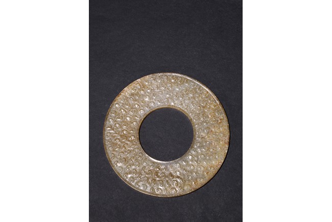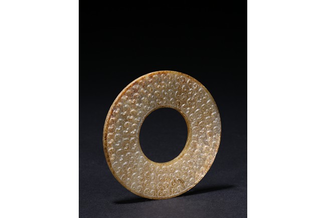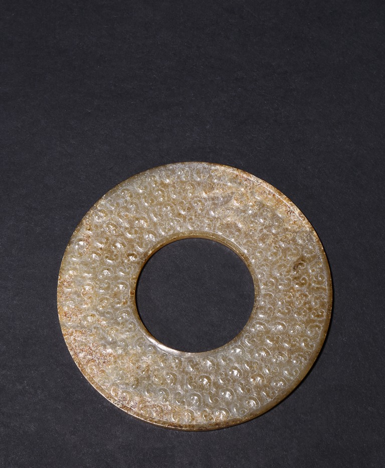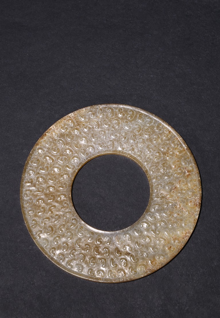 The translucent celadon stone carved in the form of a circular disc with beaded edges around the interior and exterior circle, the surface carved with dense rows of raised 'ingot' pattern, with minor signs of calcifications. Han Dynasty period.