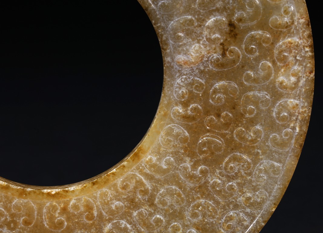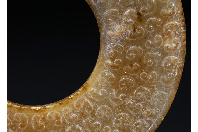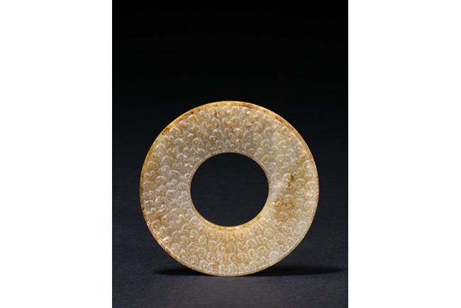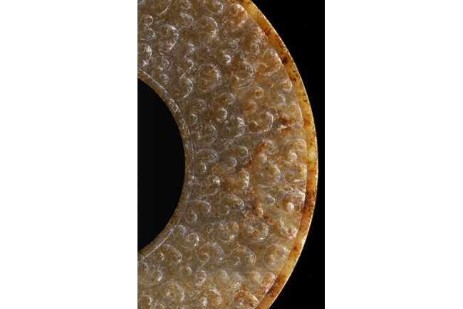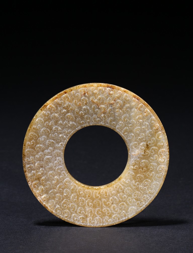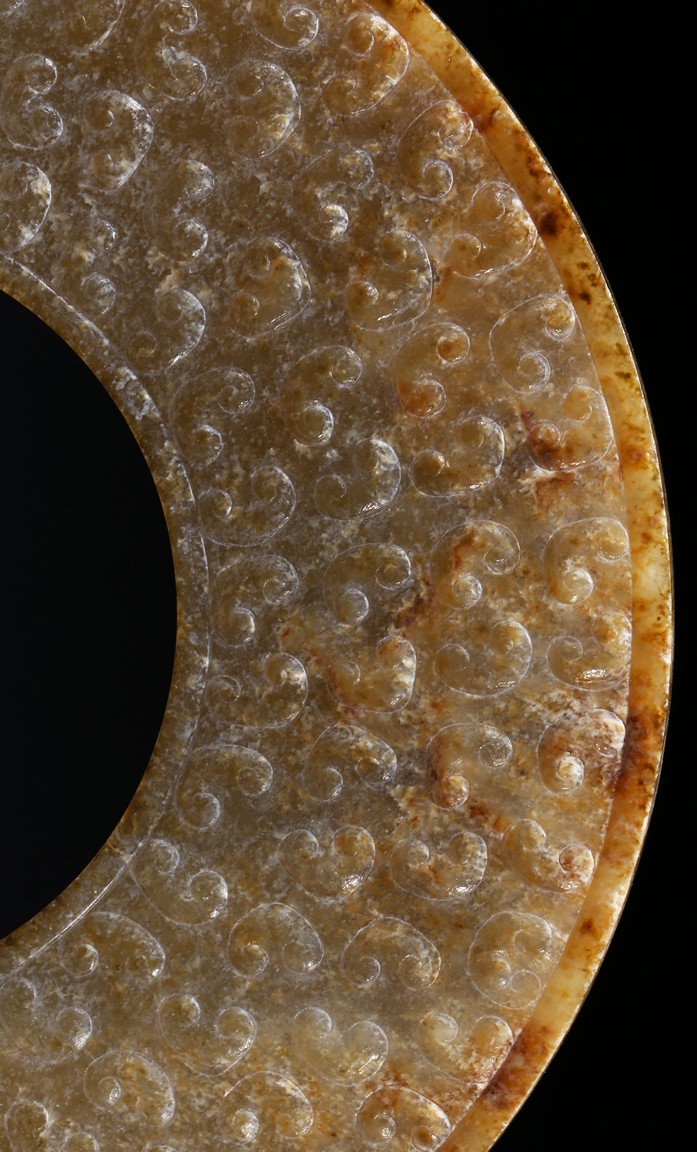 The translucent celadon stone carved in the form of a circular disc with beaded edges around the interior and exterior circle, the surface carved with dense rows of raised 'ingot' pattern, with minor signs of calcifications. Han Dynasty period.