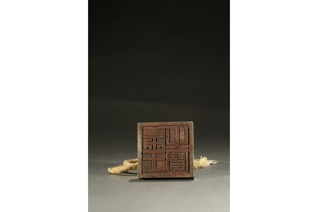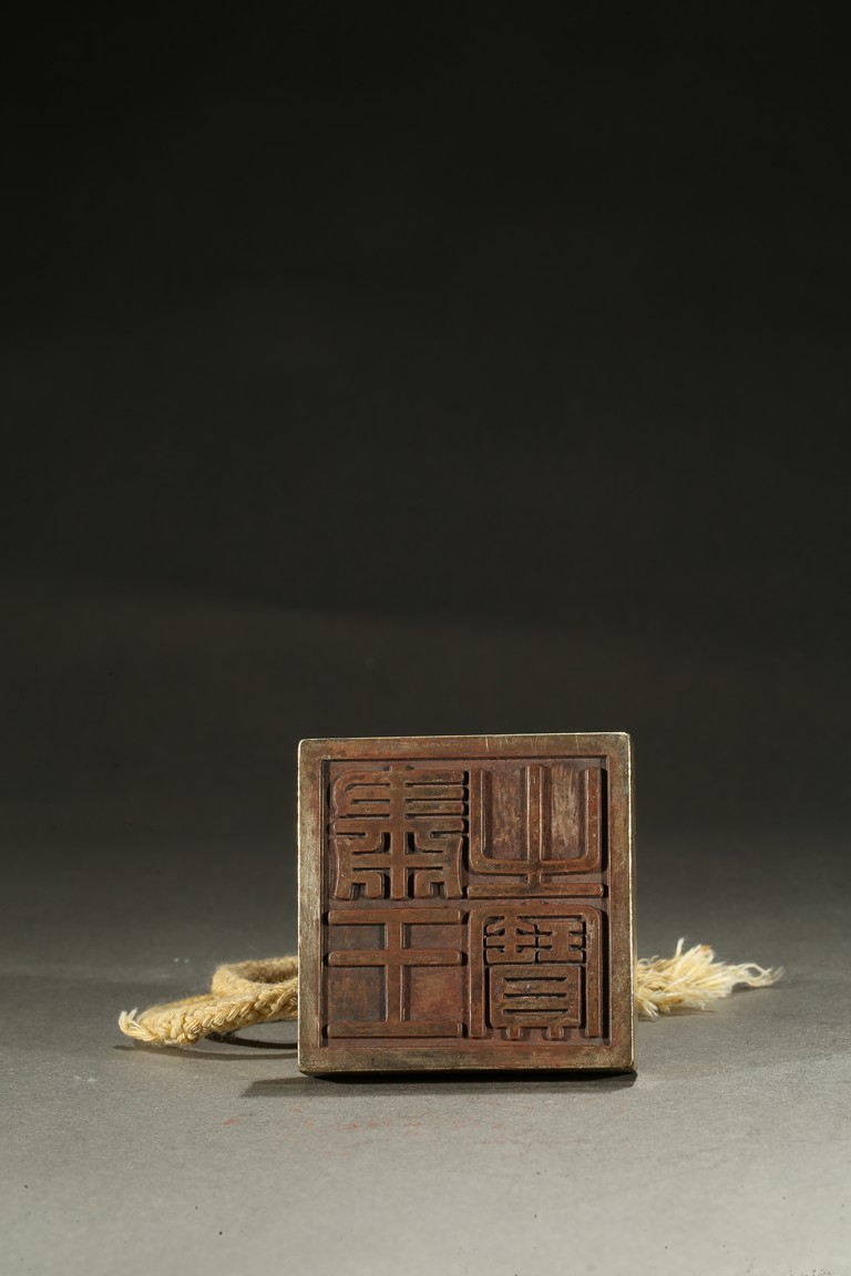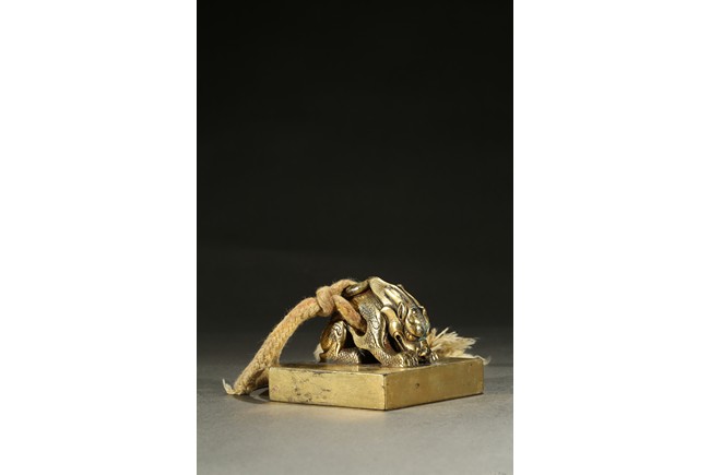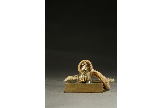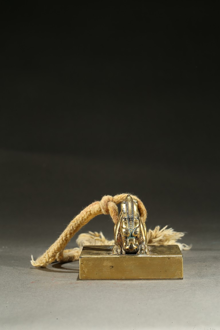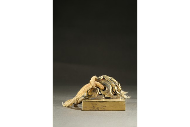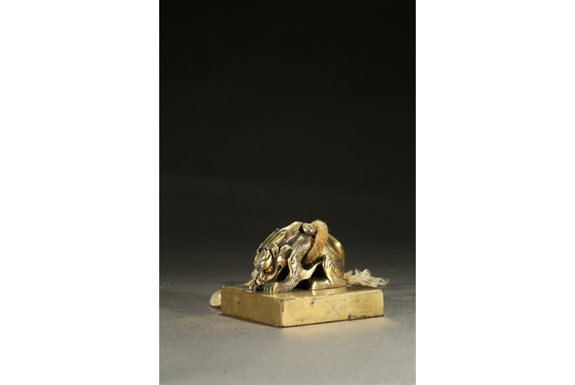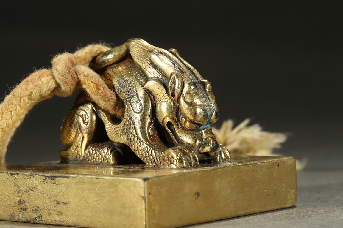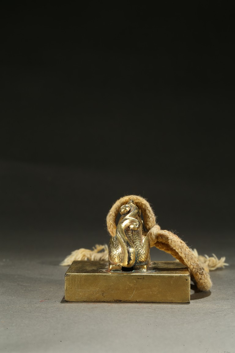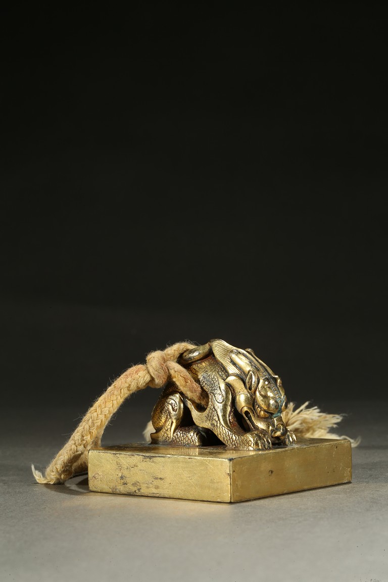 Of square section, the seal surmounted with a recumbent mythical beast seated on its rear haunches, its scaly body emitting flame scrolls around the limb, its powerful head resting on front paws with mouth slightly open, the mane further detailed with incised lines, tail bifurcated, the seal surface with four character inscription. Qing Dynasty period.