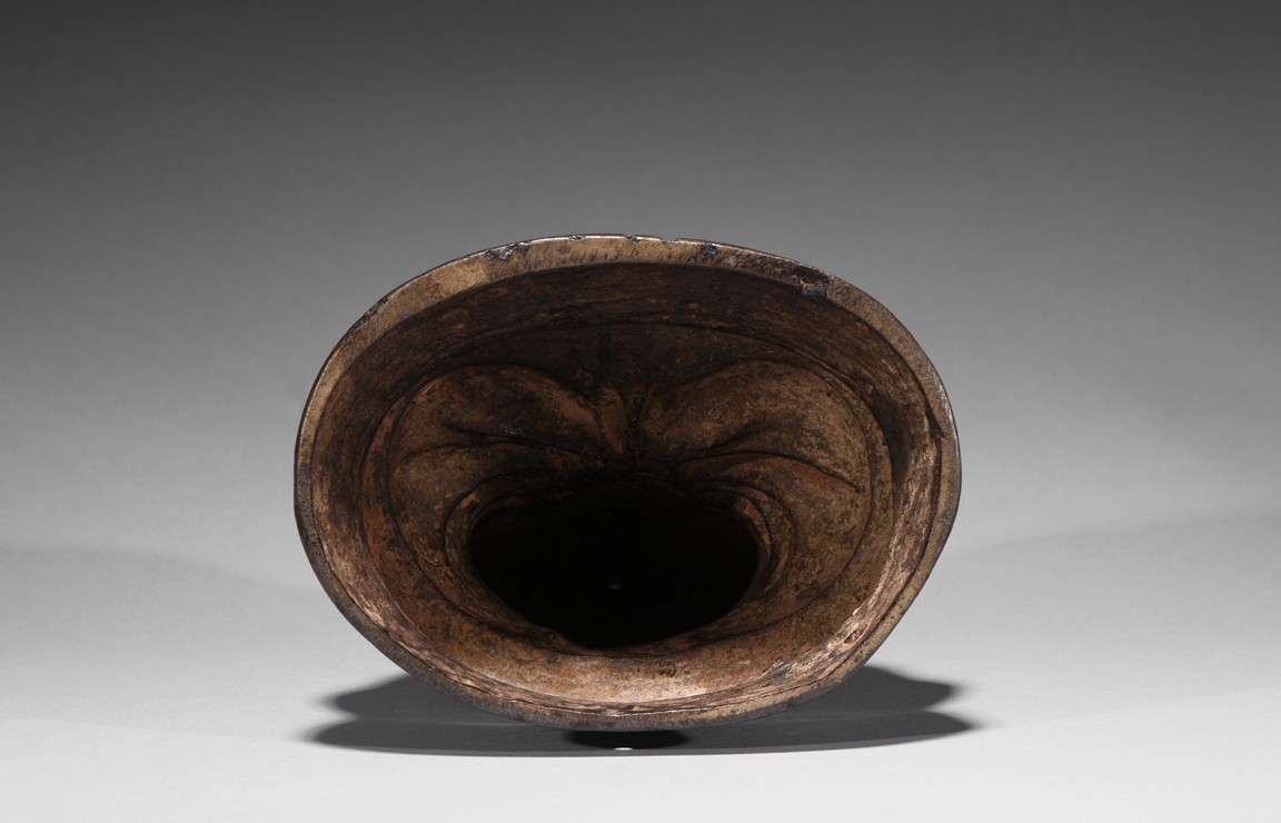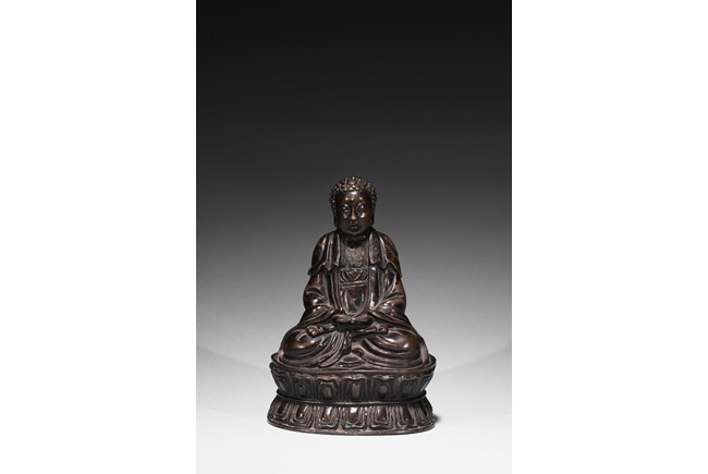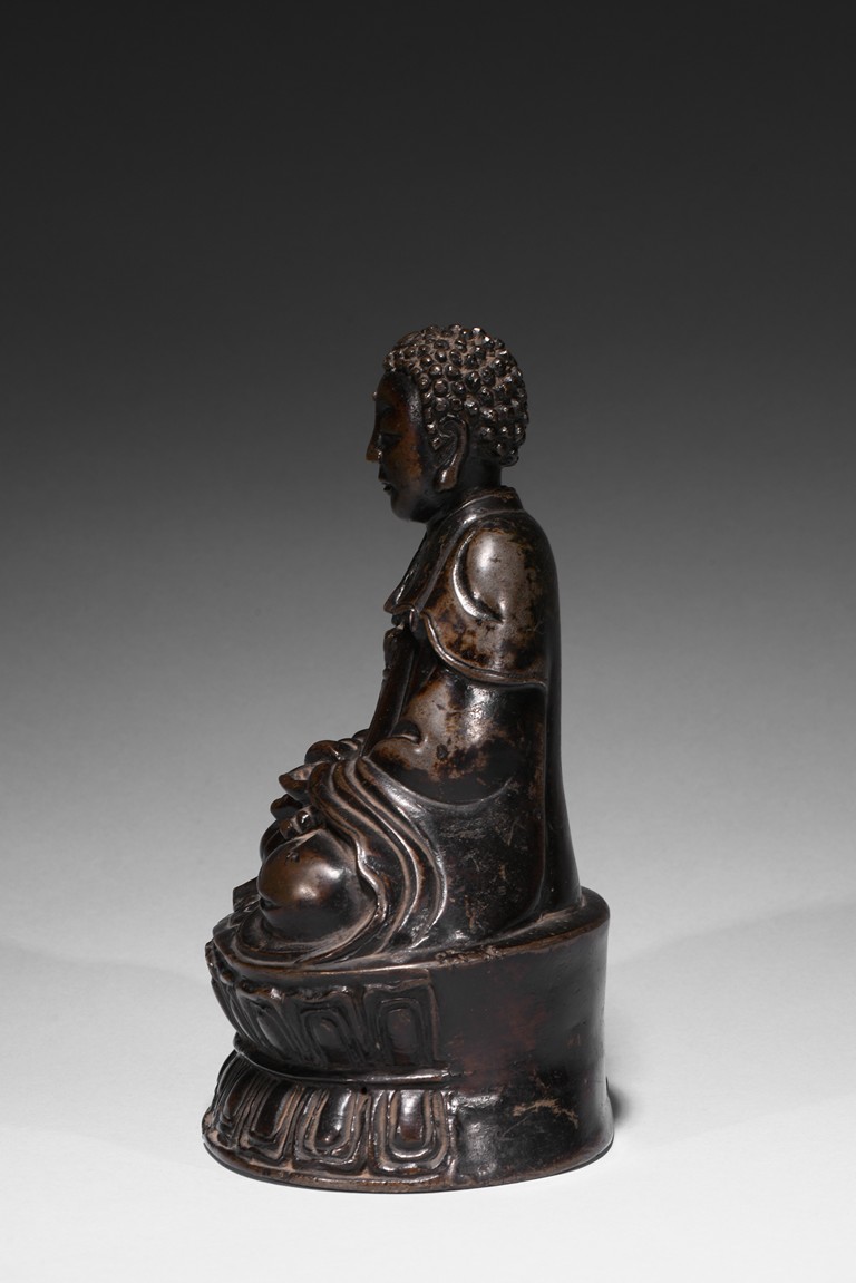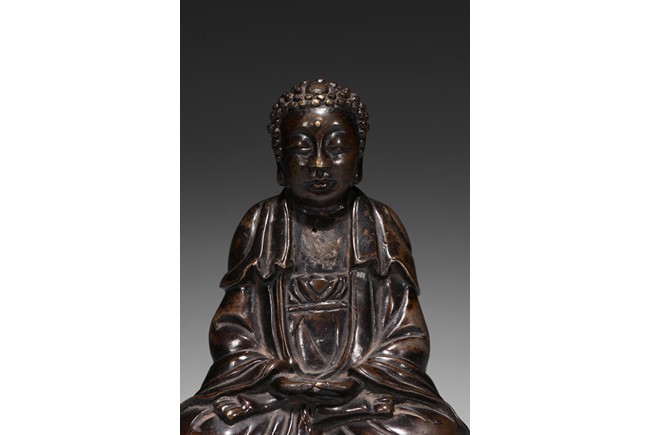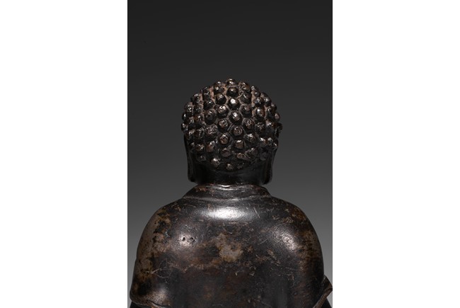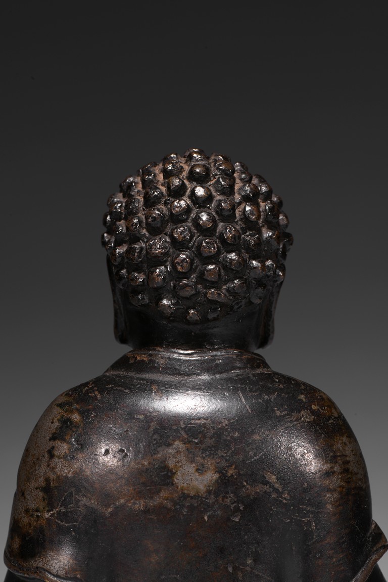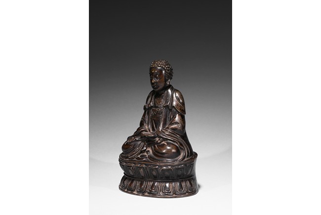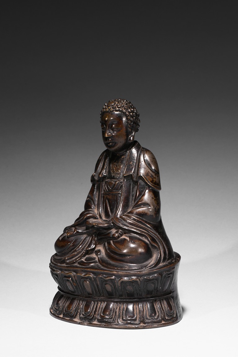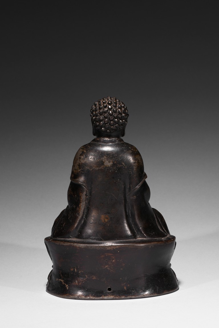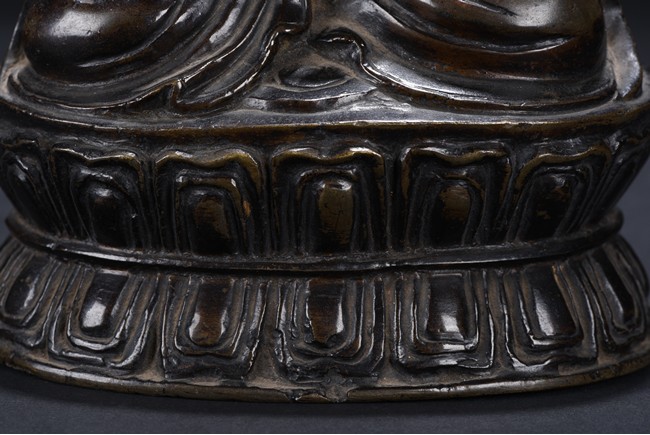 Seated in dhyanasana on a double-lotus base with incised edge, the hands in dhyana mudra, clad in a flowing sanghati with beaded and incised hems draped over both shoulders, face with serene expression.