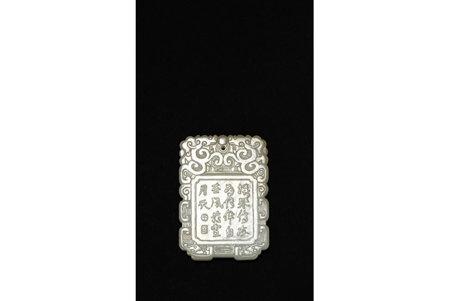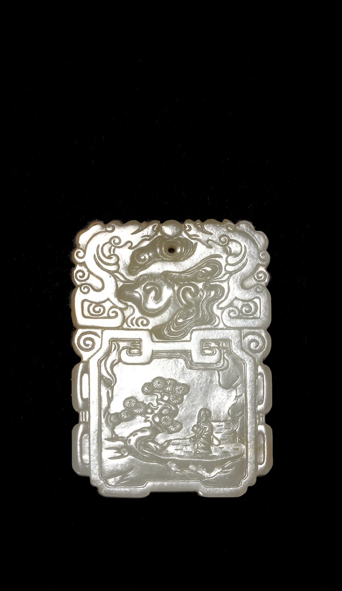 此白玉子岡牌雕雙螭龍紋飾,下方刻深山中高士與童子攜琴訪友之景,反面刻行書詩文,雕工雄渾有力,紋飾造型獨特,立體感強,爲清中期蘇作子岡牌之極品,罕見非常。可比較一相同尺寸白玉子岡牌,售于紐約佳士得,2013年9月,成交價 USD 56,250 來源:洛杉磯資深藏家提供 Provenance: Important private collection, Los Angeles