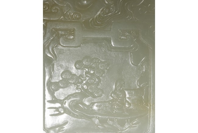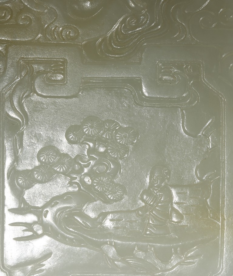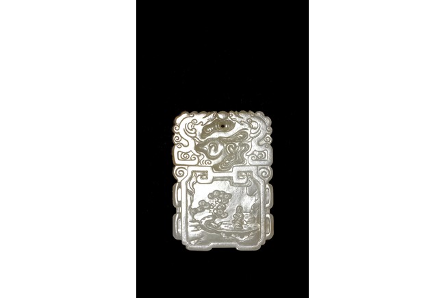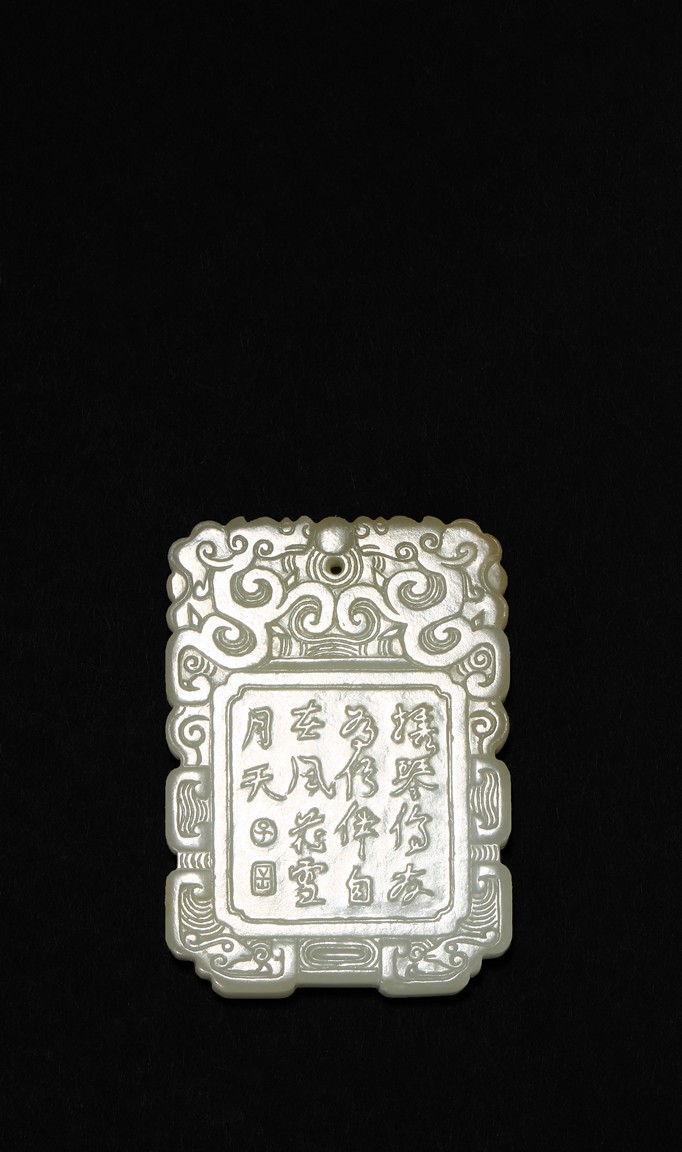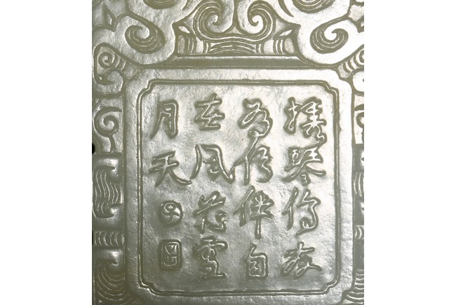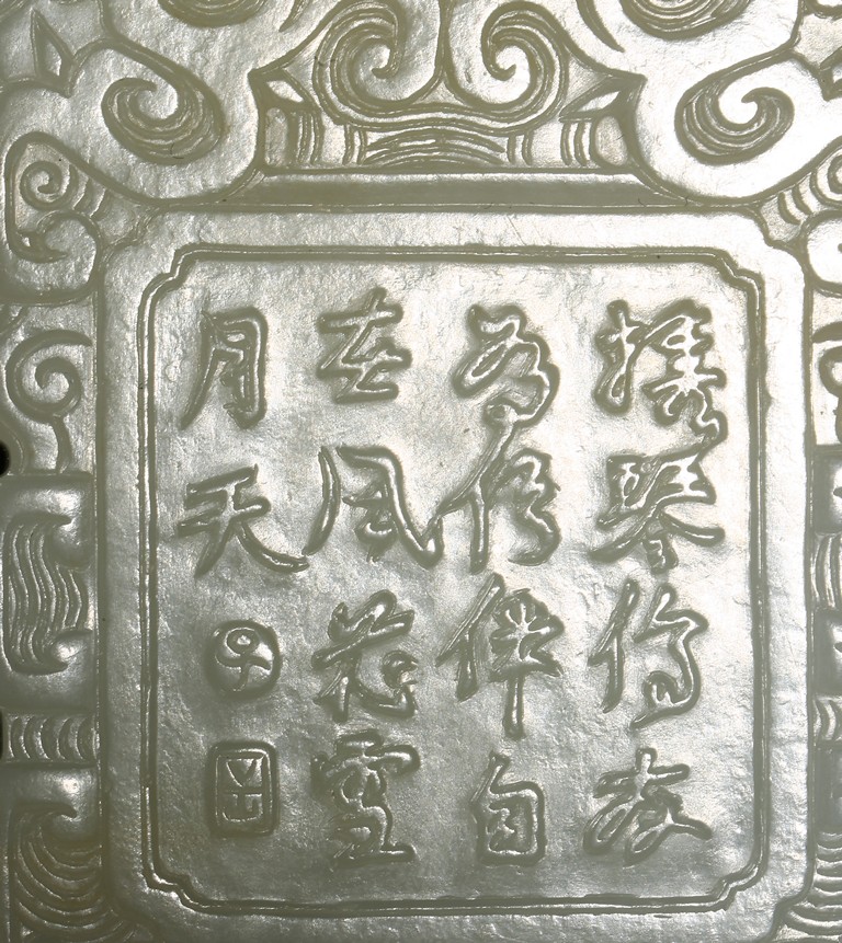 Of rectangular form, worked on one side with a panel enclosing the scene of literati carrying a Guqin on his arm next to a large pine tree within a rocky mountain setting, below two delicately carved confronting dragons emerging from clouds; the reverse with a panel enclosing a inscribed poem in running script followed by two seal marks Zi and Gang, below two stylized dragons, the stone is of even white tone with very slight russet tone. Mid-Qing Dynasty period.