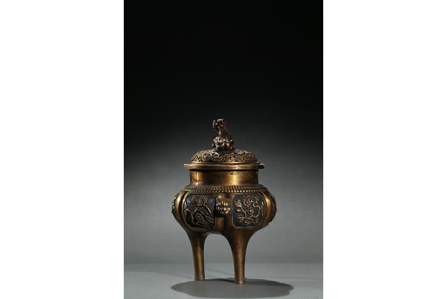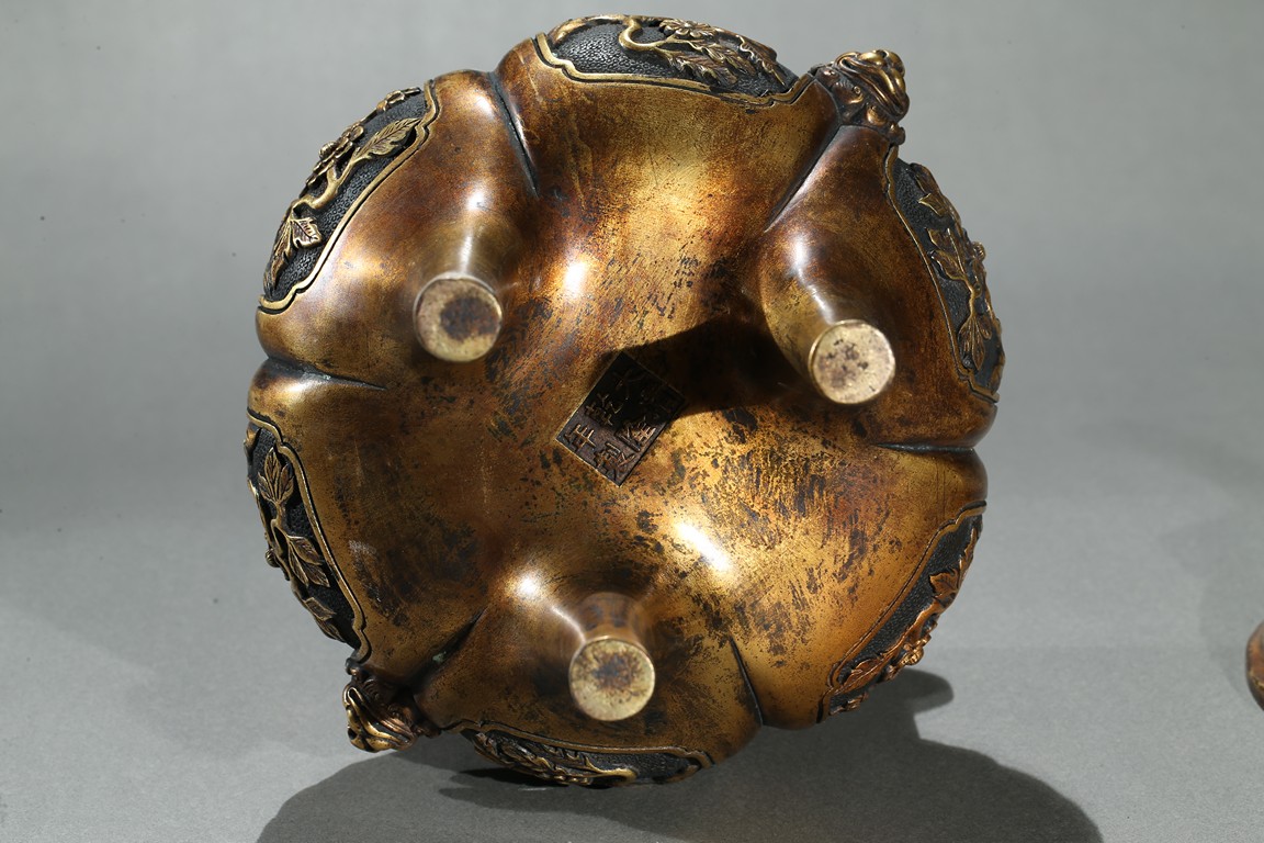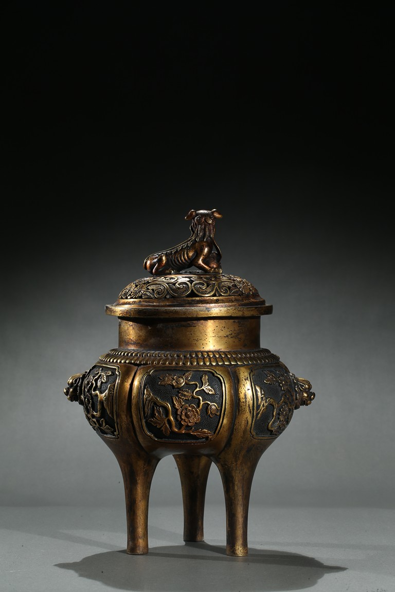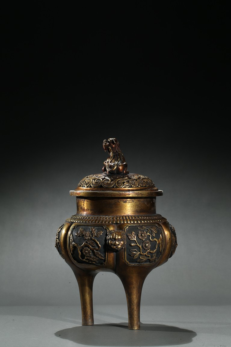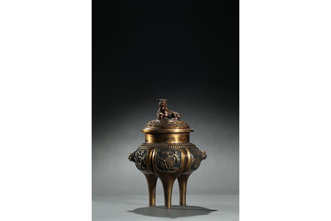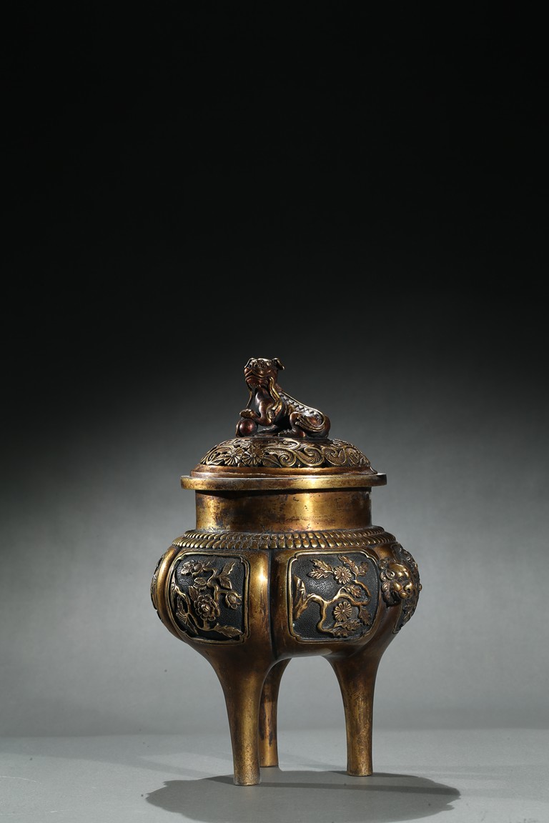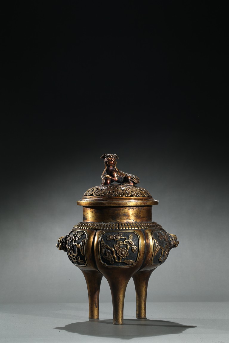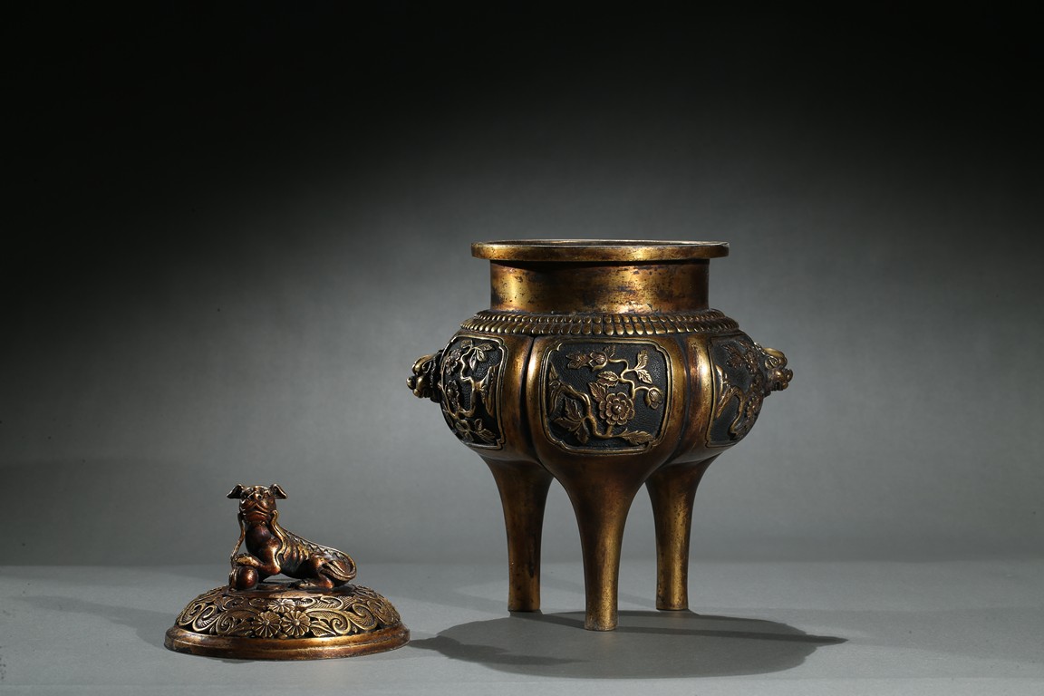 The body of lobed globular form flanked by two raised Buddhist lion mask, each section decorated with a shape panel enclosing flower branch in high relief, the pierced cover with a Buddhist lion finial, the base with six character QIANLONG mark. Qing Dynasty period.