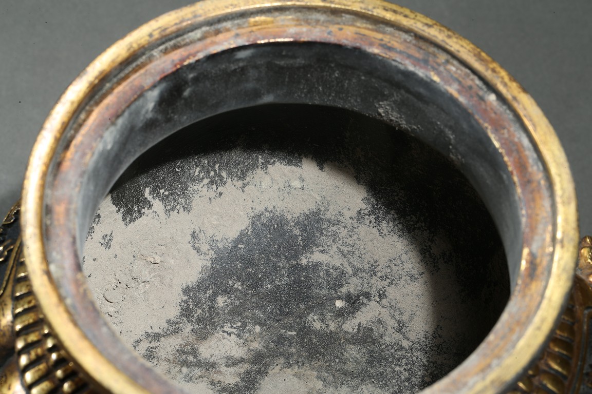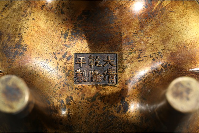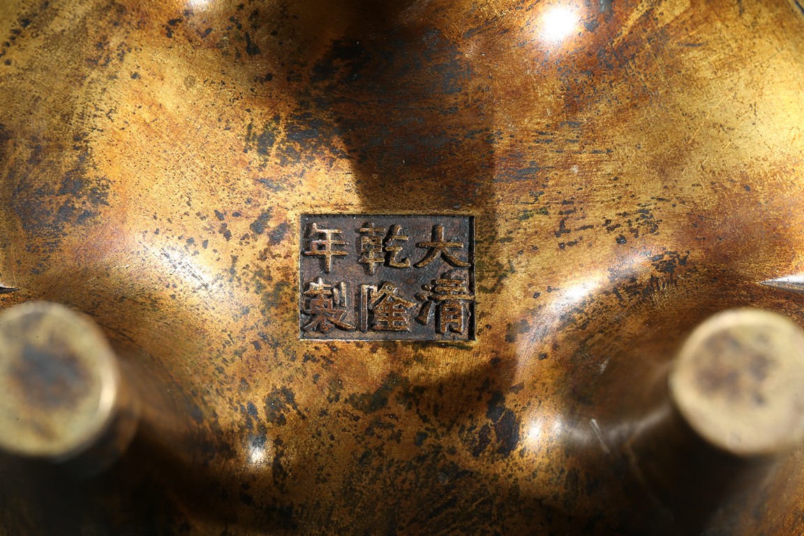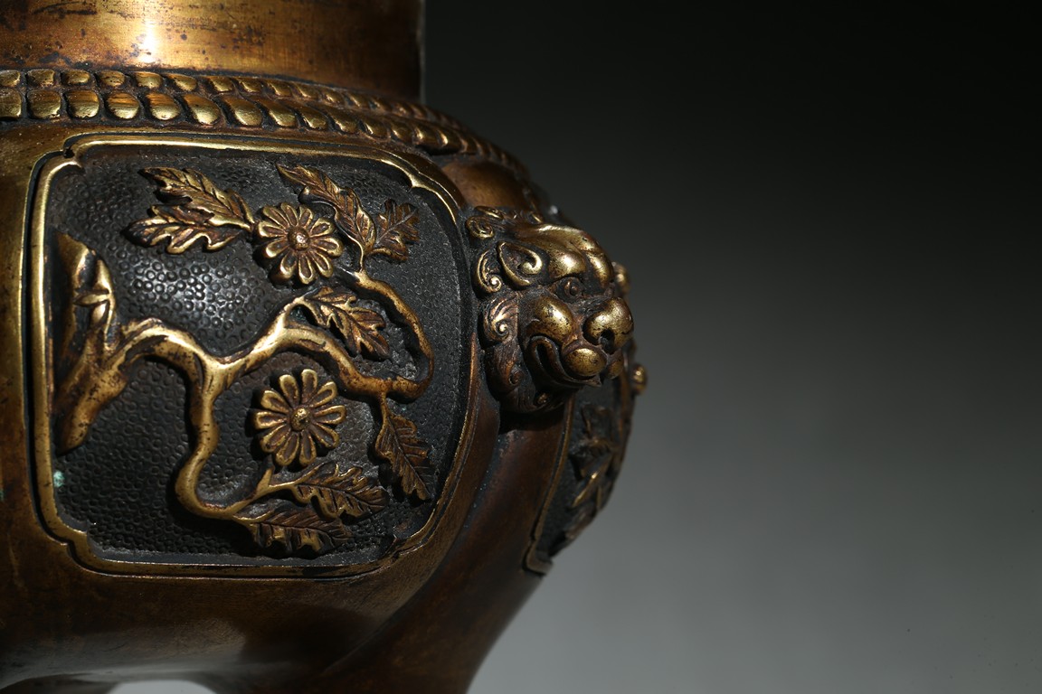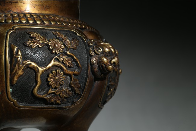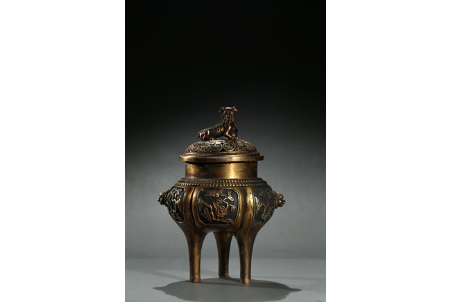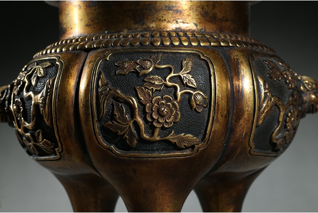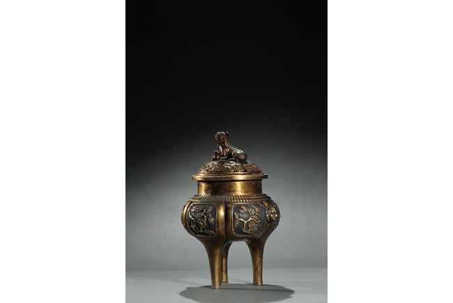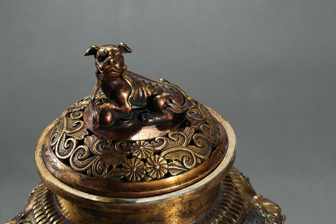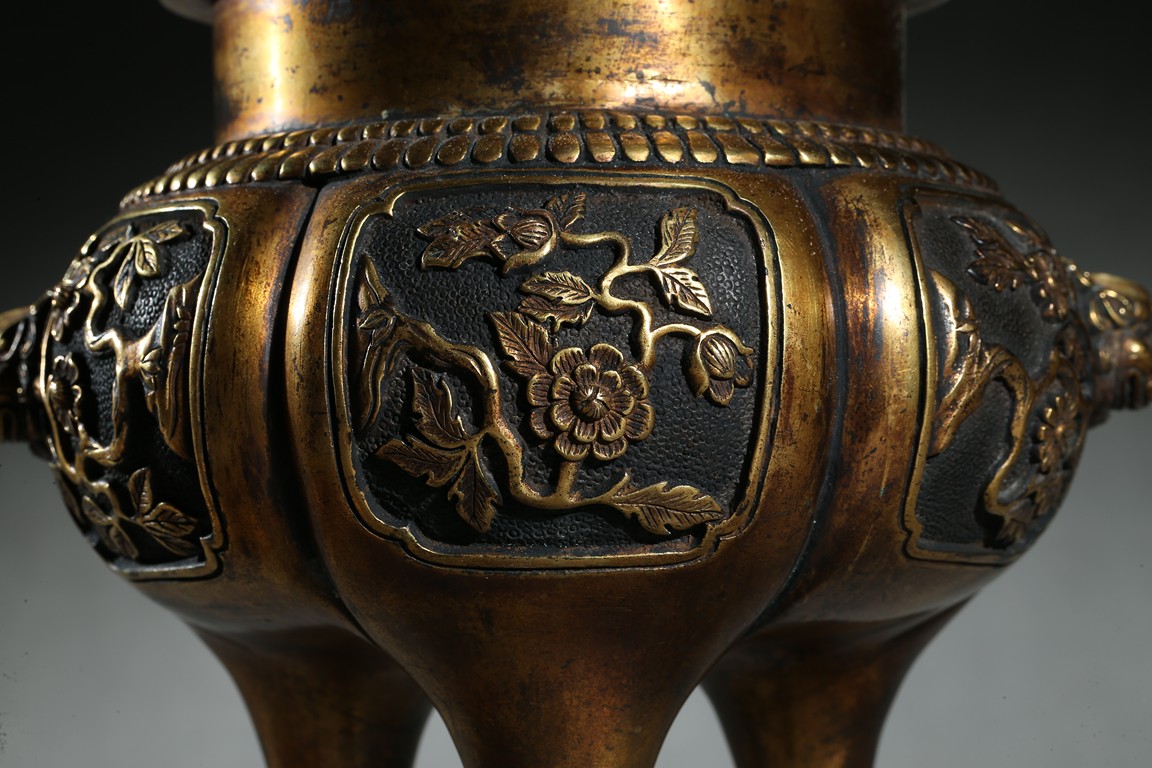 The body of lobed globular form flanked by two raised Buddhist lion mask, each section decorated with a shape panel enclosing flower branch in high relief, the pierced cover with a Buddhist lion finial, the base with six character QIANLONG mark. Qing Dynasty period.