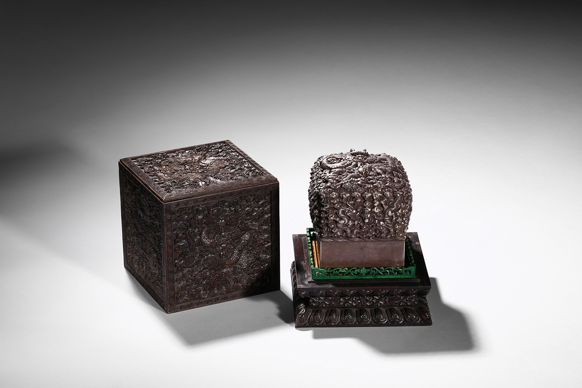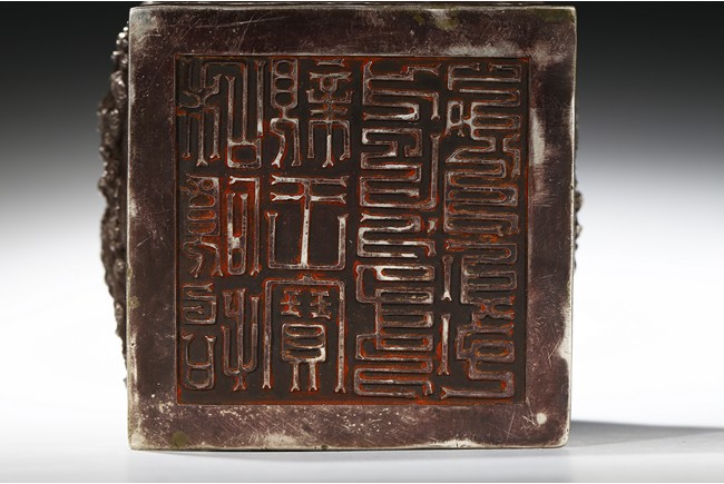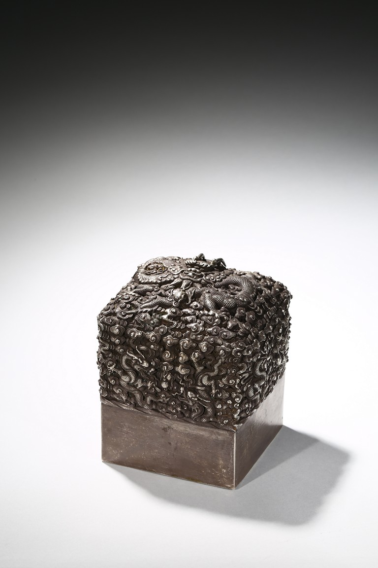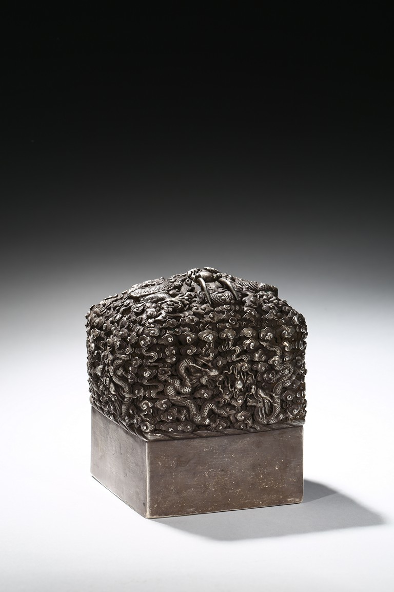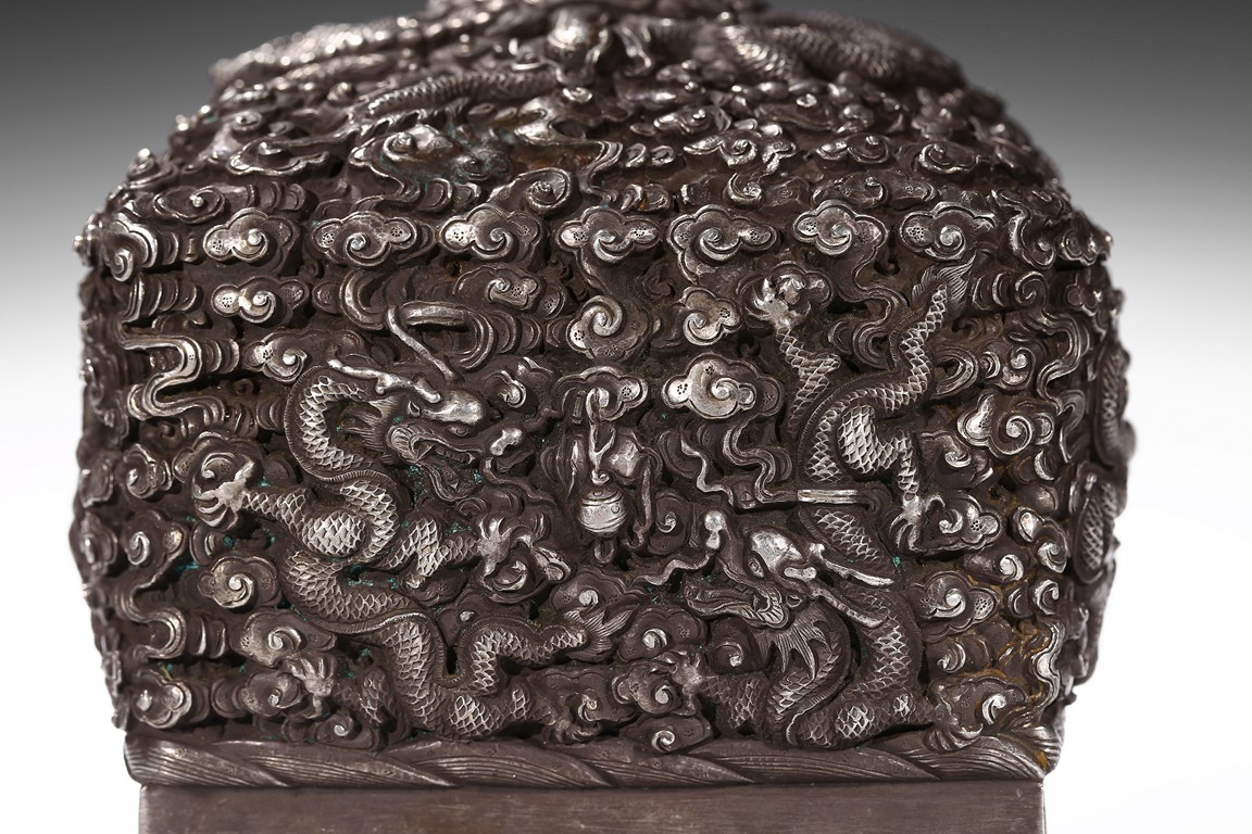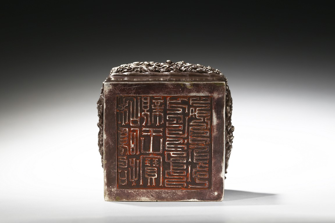Of square section, the upper seal cast with sinuous dragons chasing flaming pearl within auspicious clouds, the base carved with inscriptions. Qing Dynasty period.