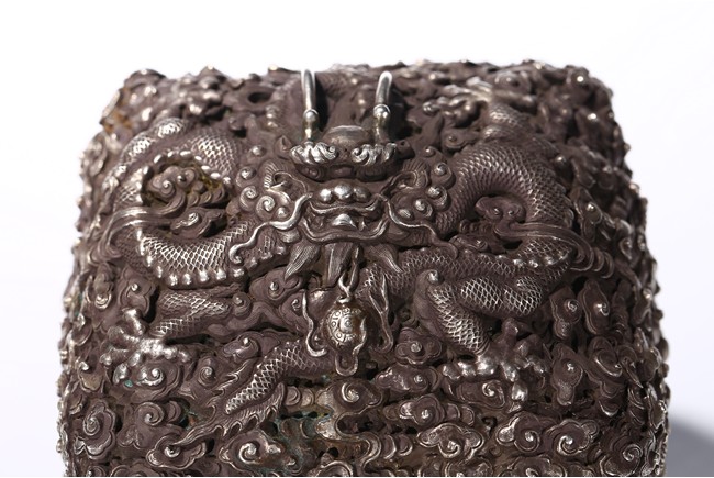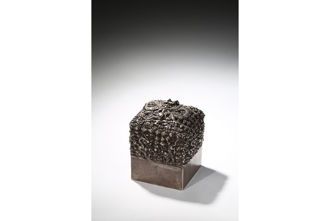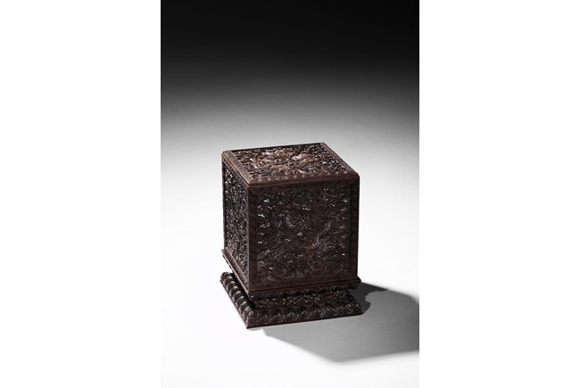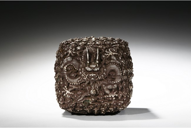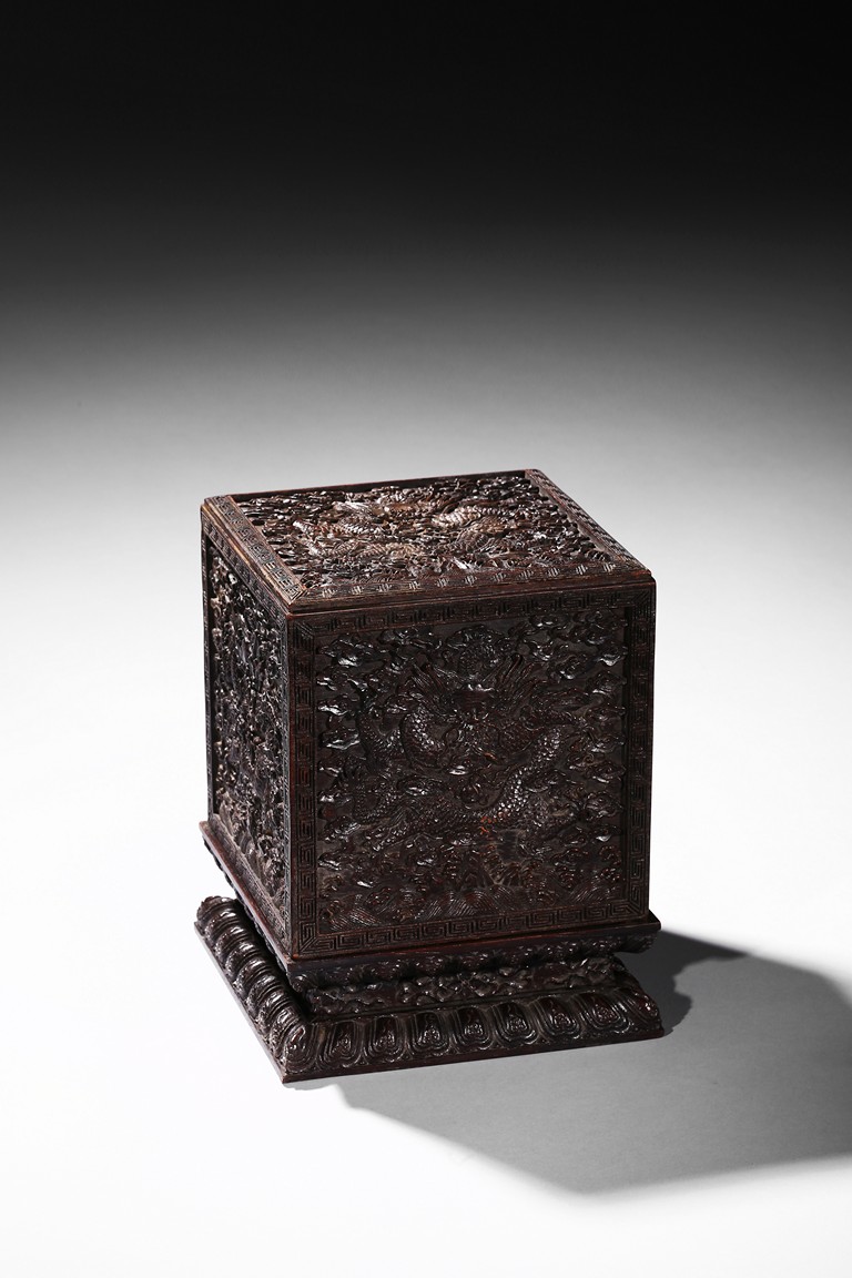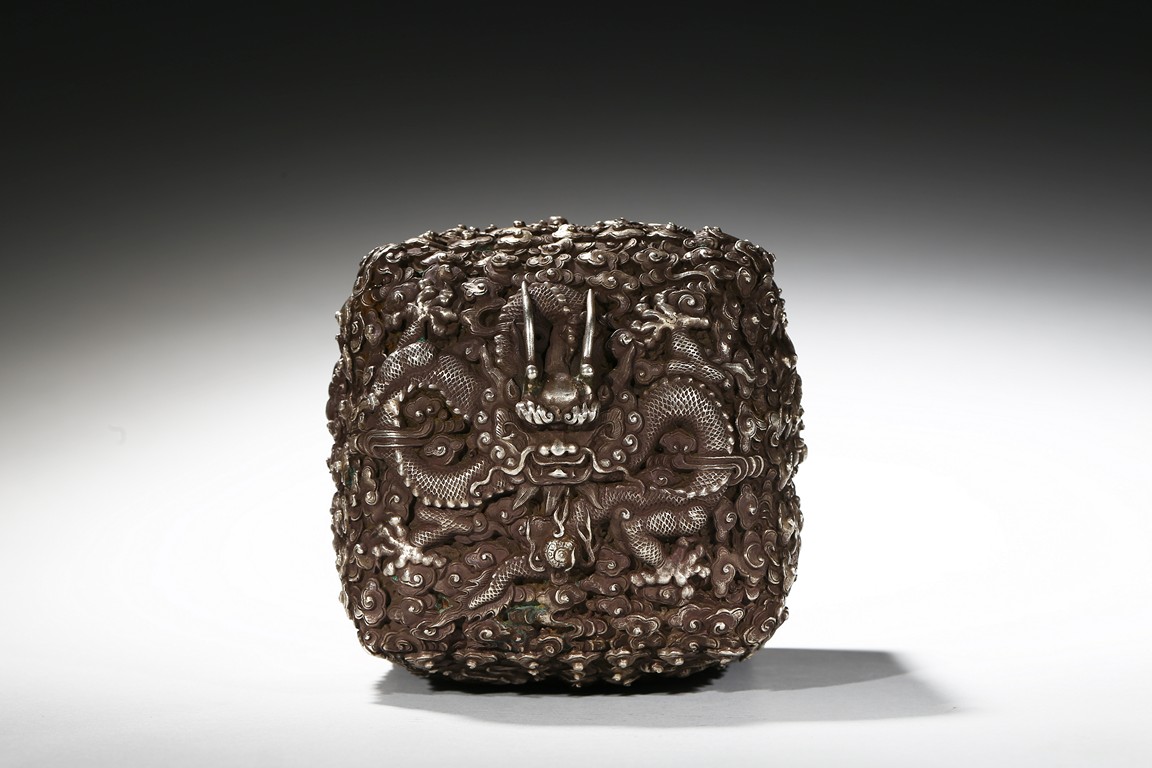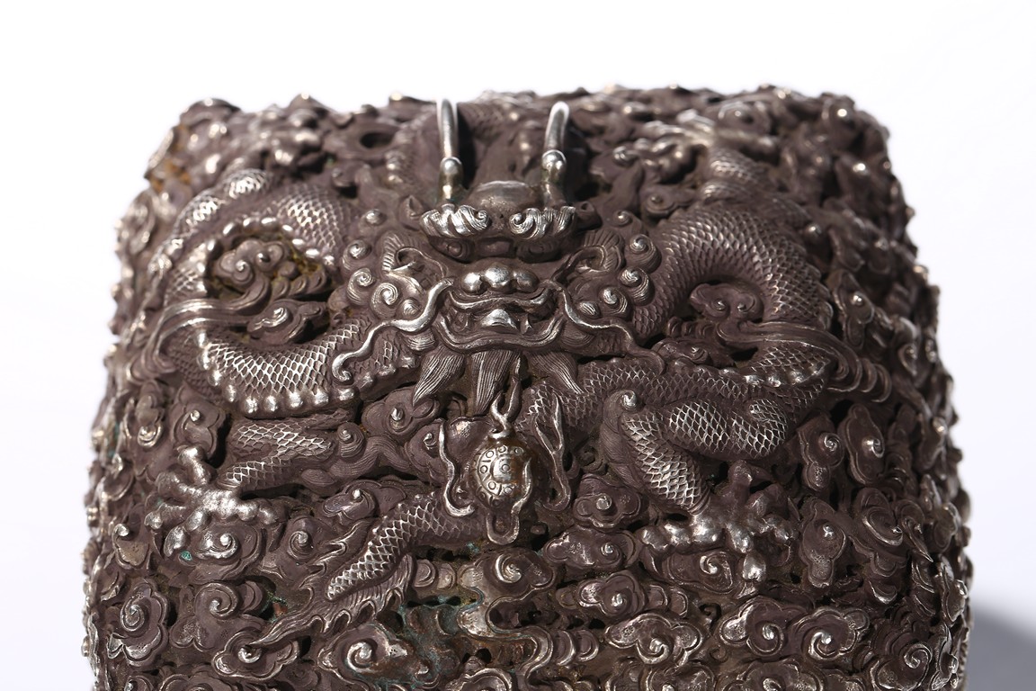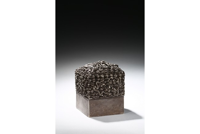Of square section, the upper seal cast with sinuous dragons chasing flaming pearl within auspicious clouds, the base carved with inscriptions. Qing Dynasty period.