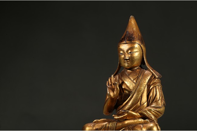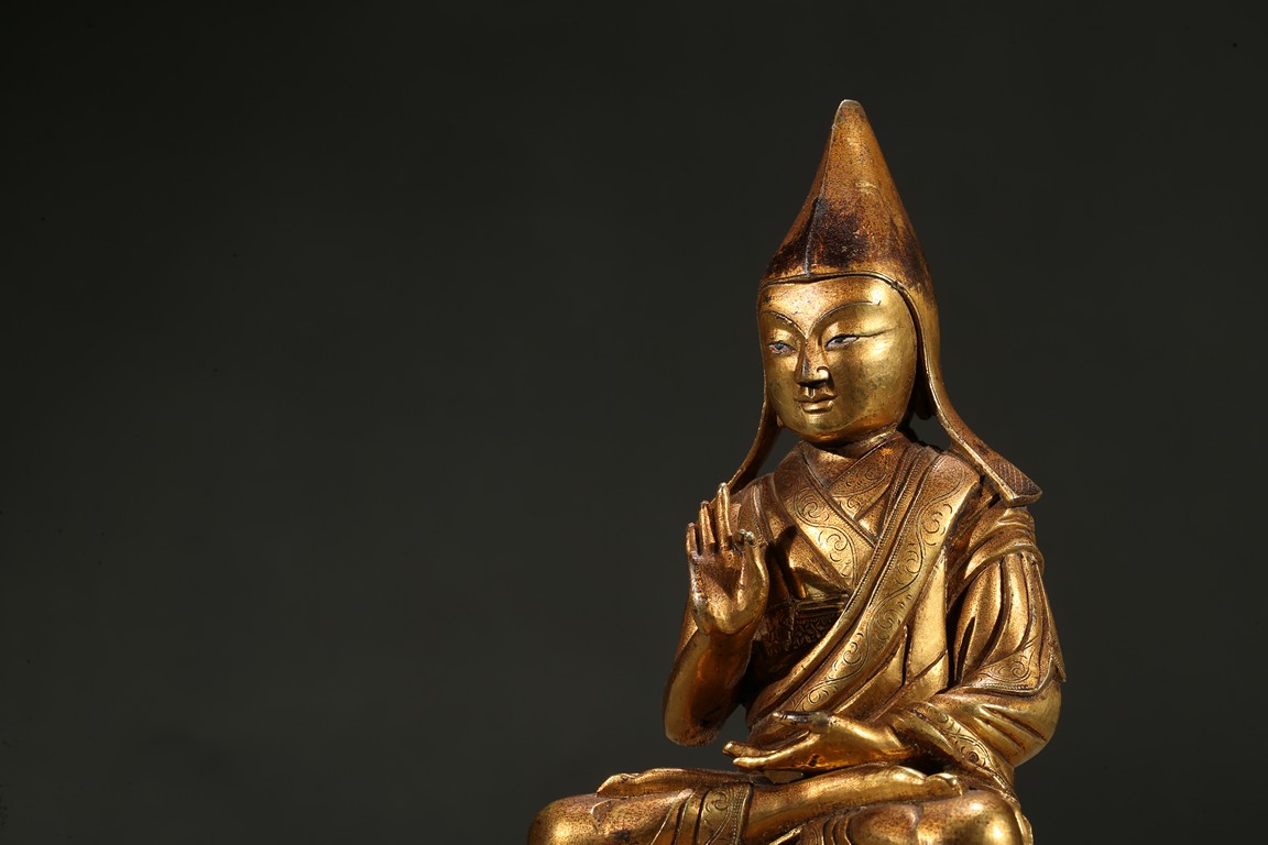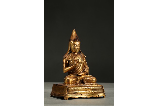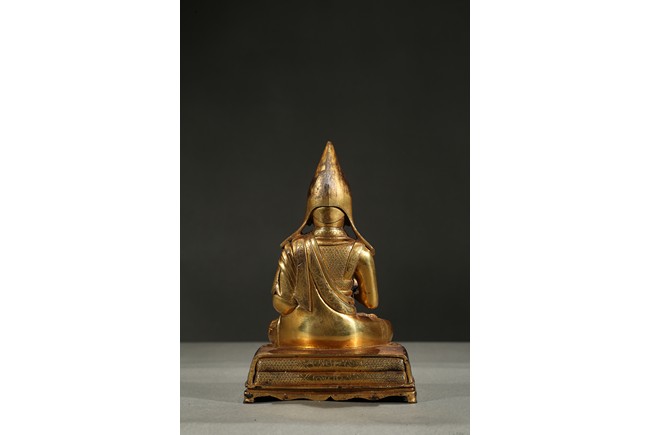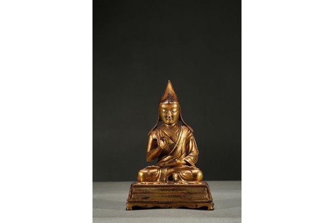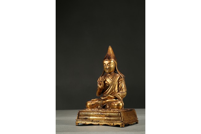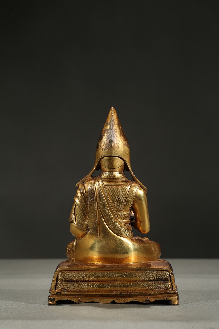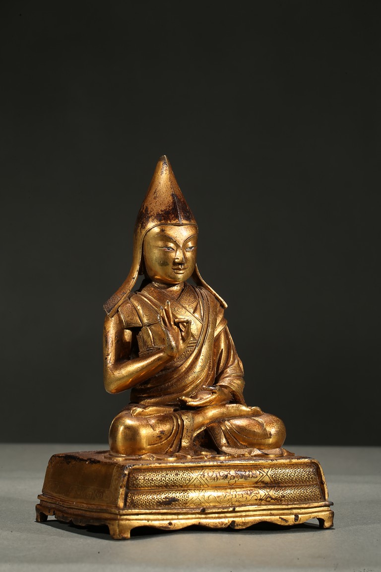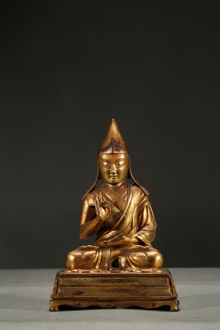 The figure is seated on a stepped base wearing long flowing robes and tall peaked hood, his right hand is raised in vitarka mudra, and his left lowered to rest on his lap. Qing Dynasty period.