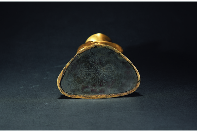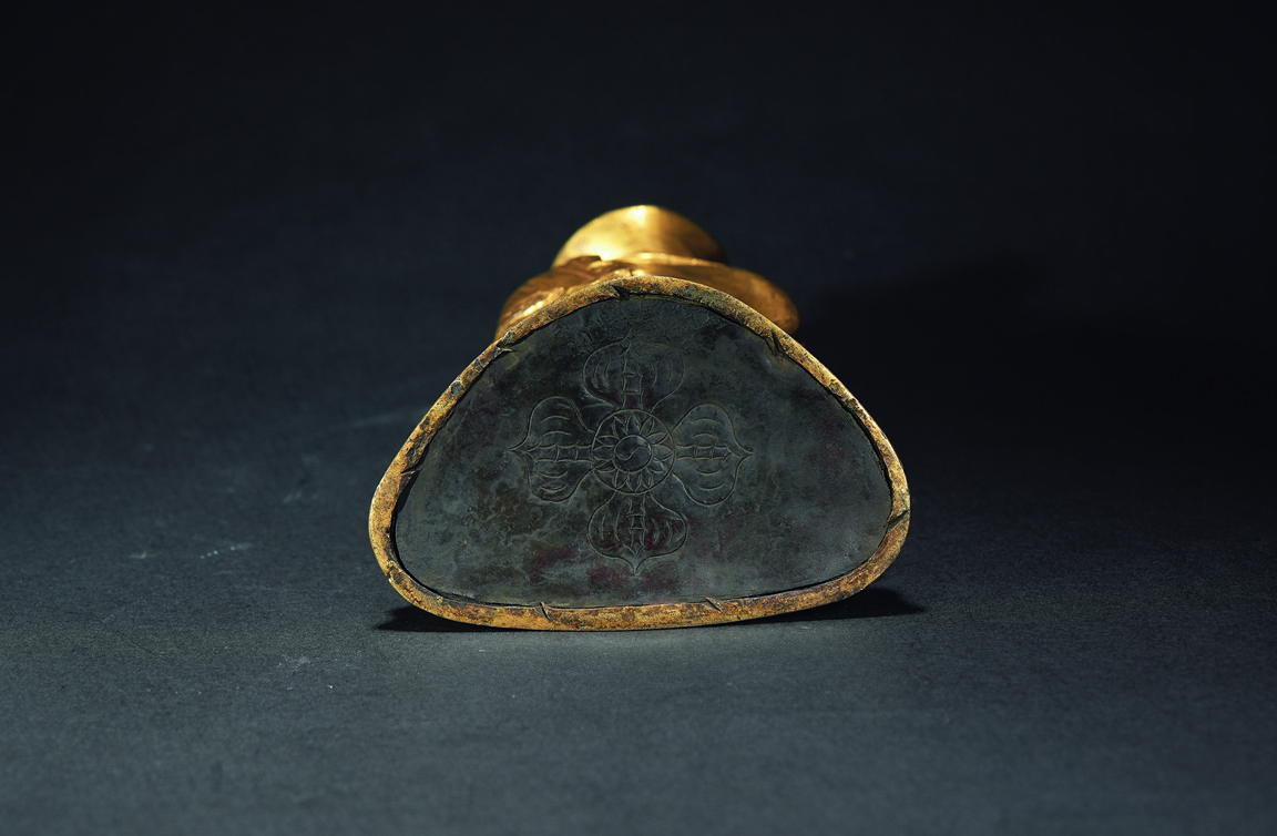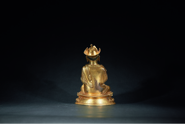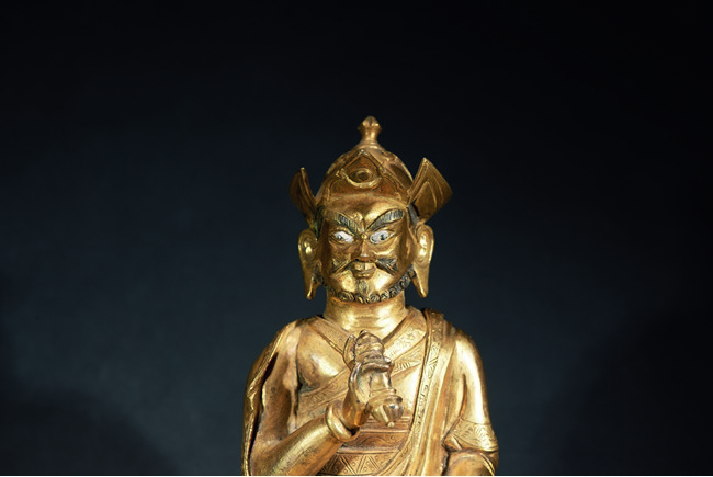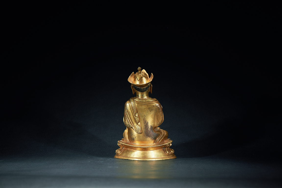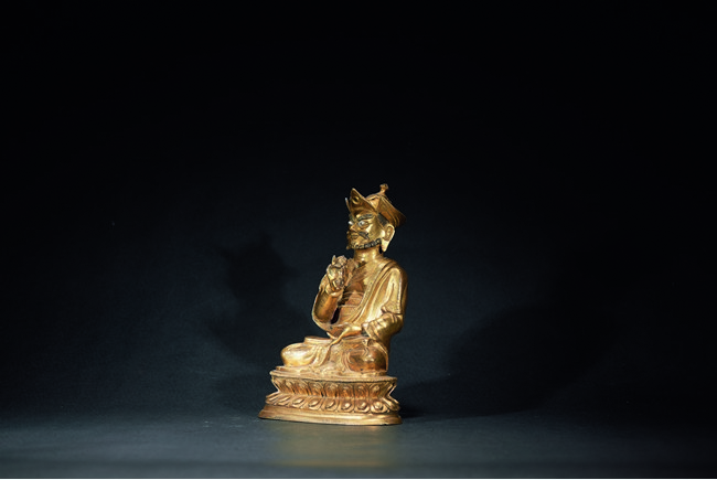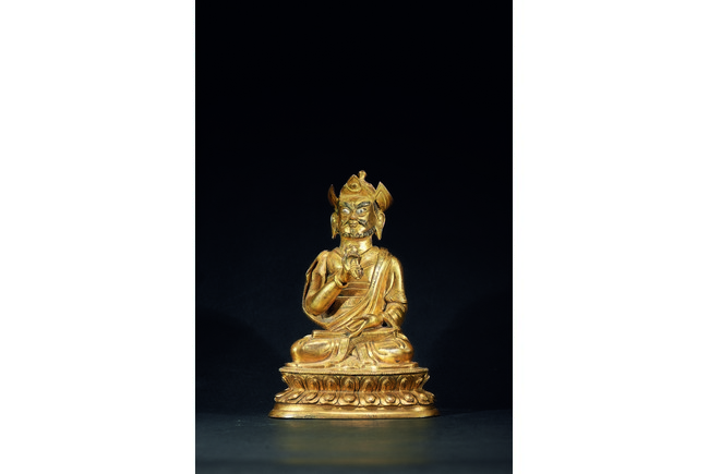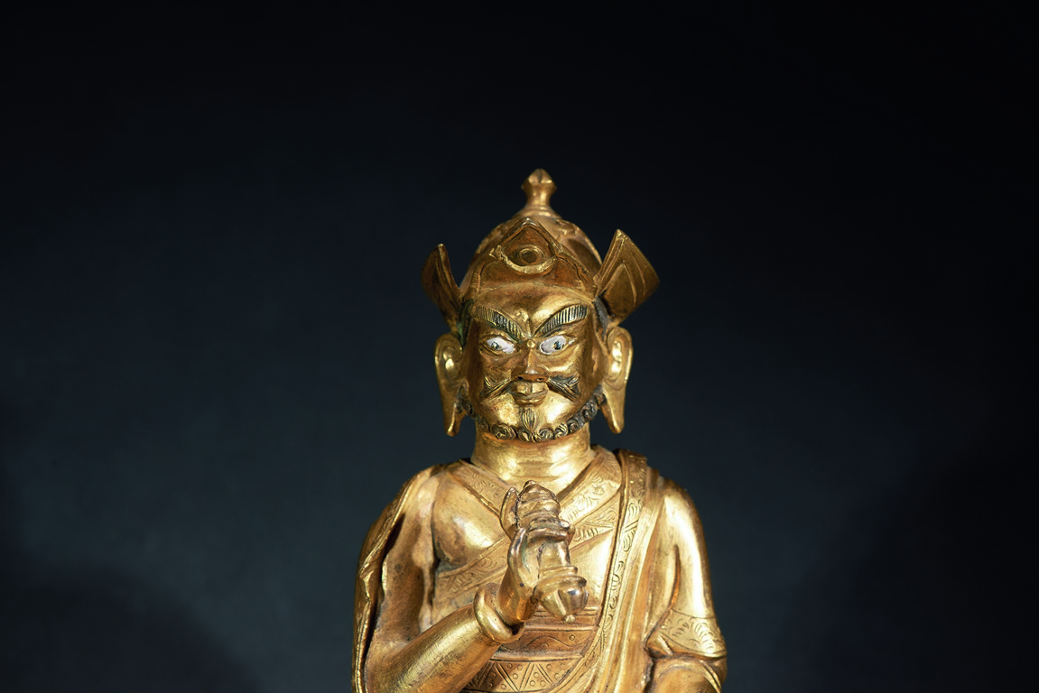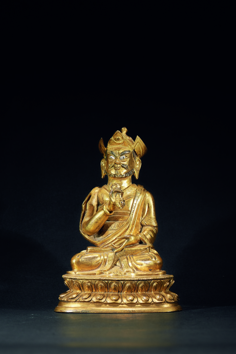 Shown seated in dhyanasana on a double lotus throne, right hand raised holding a vajra, wearing dhoti with incised hems, face with intense expression, wearing pointed hat, overall richly gilt.