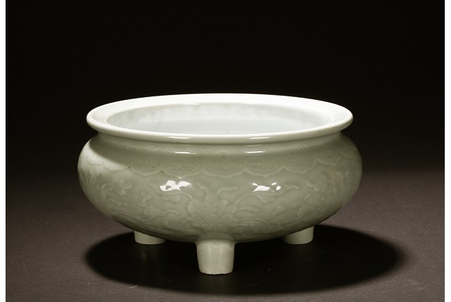 Supported on three short feet, the body is of compressed globular form, body finely carved with a band of continuous scrolling lotus in relief, below a ruyi-head band below the rim.