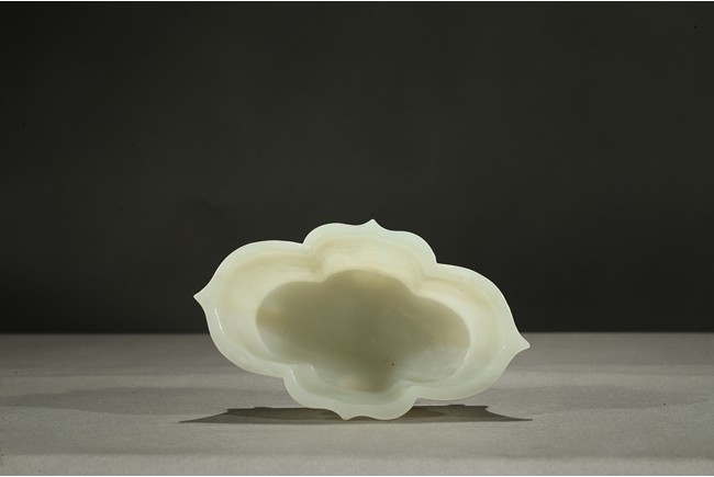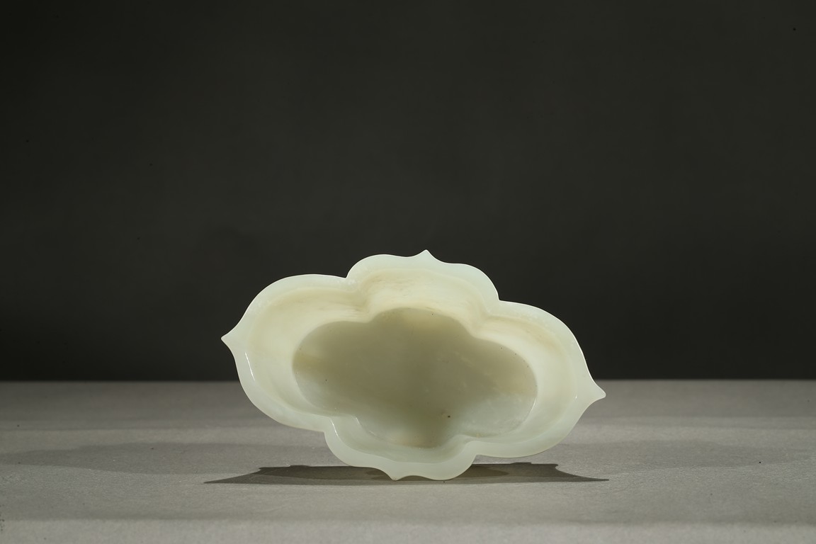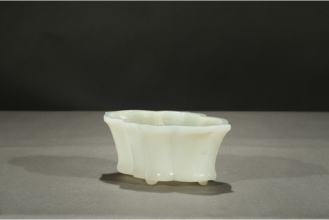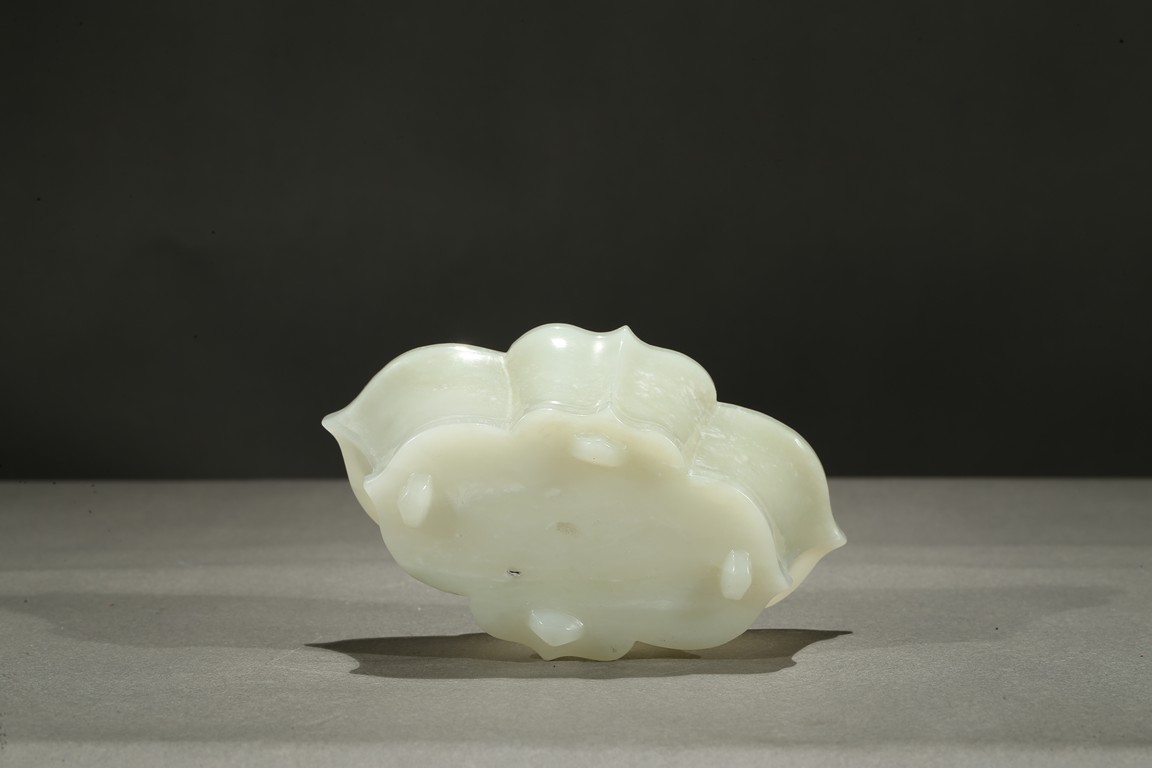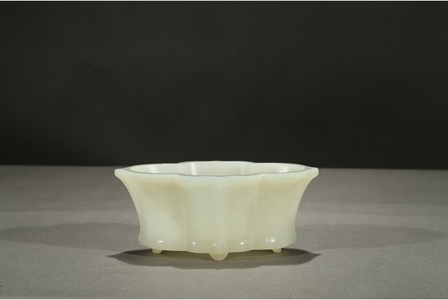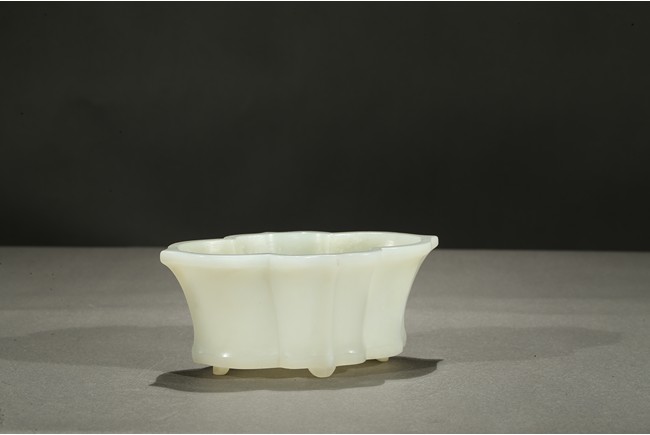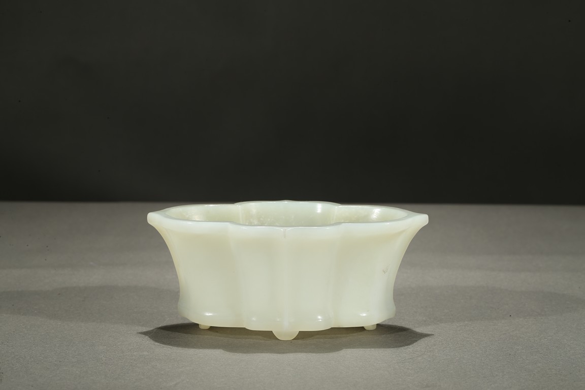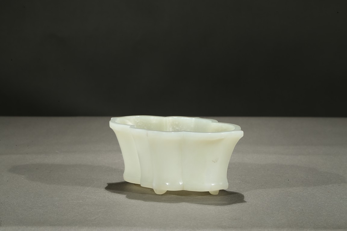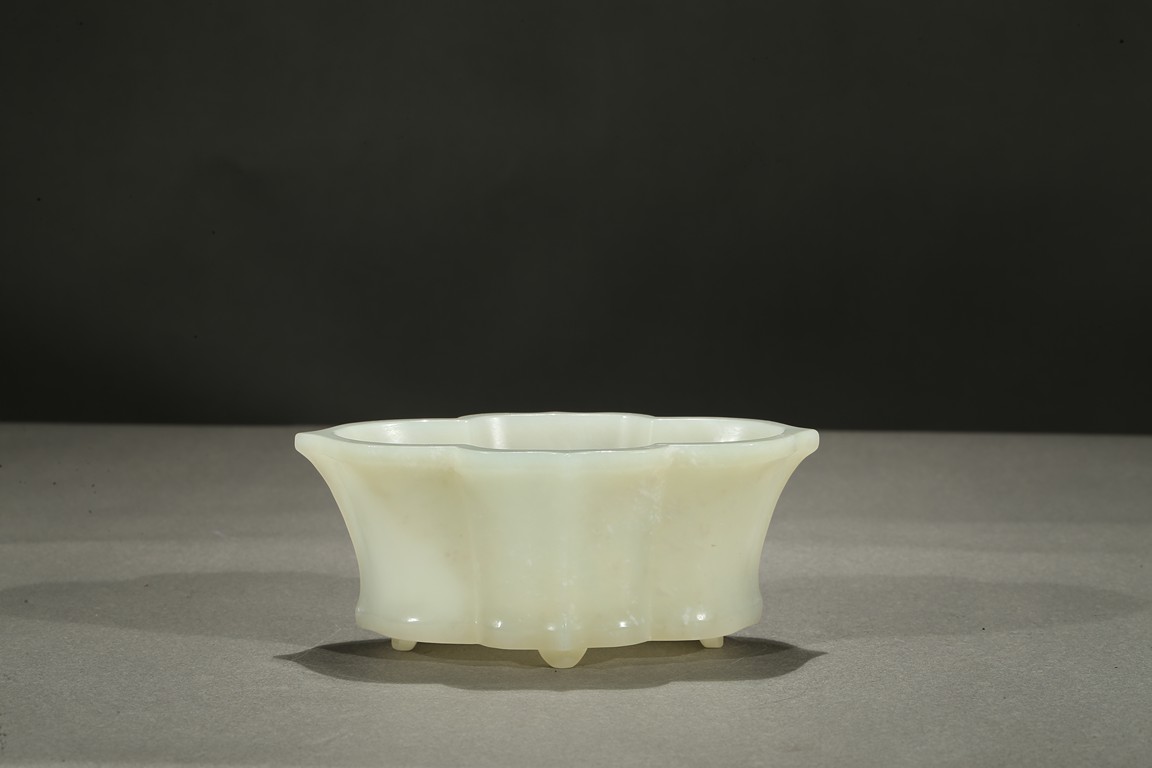 The lobed vessel rising to a flared rim, supported on four stubs, the stone is of smooth translucent white tone.