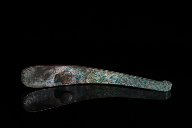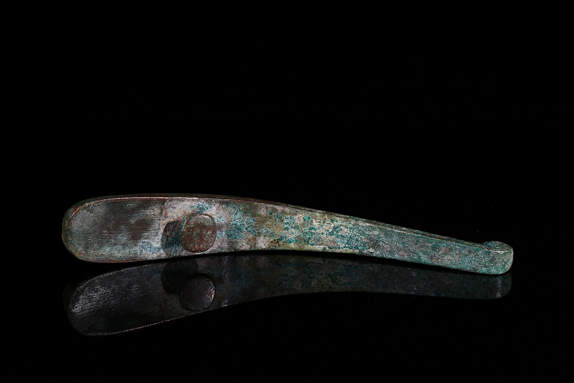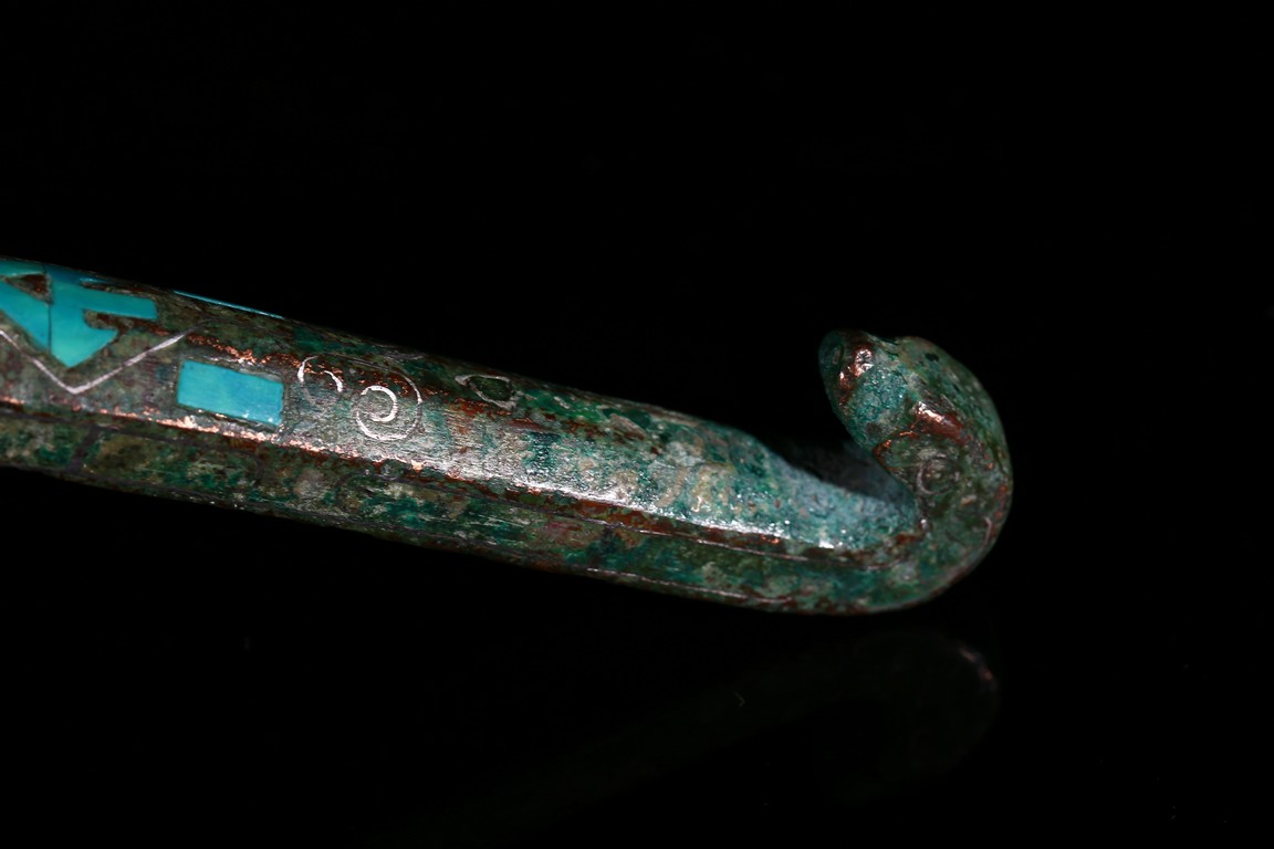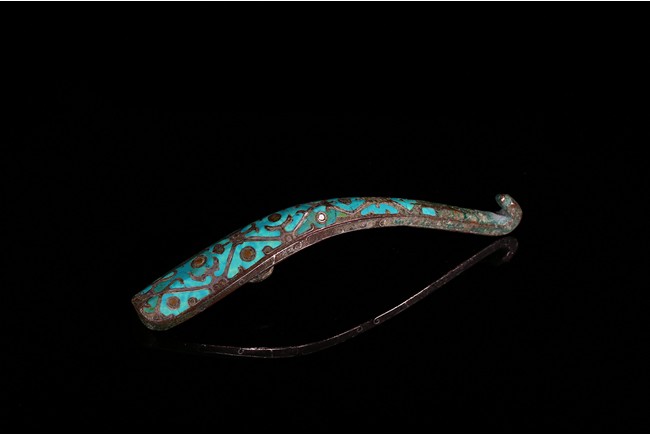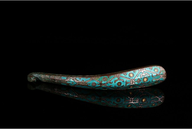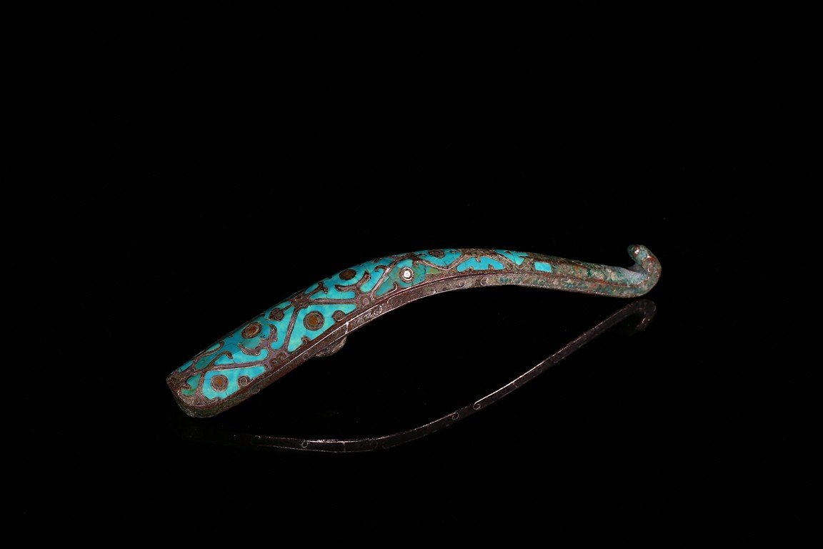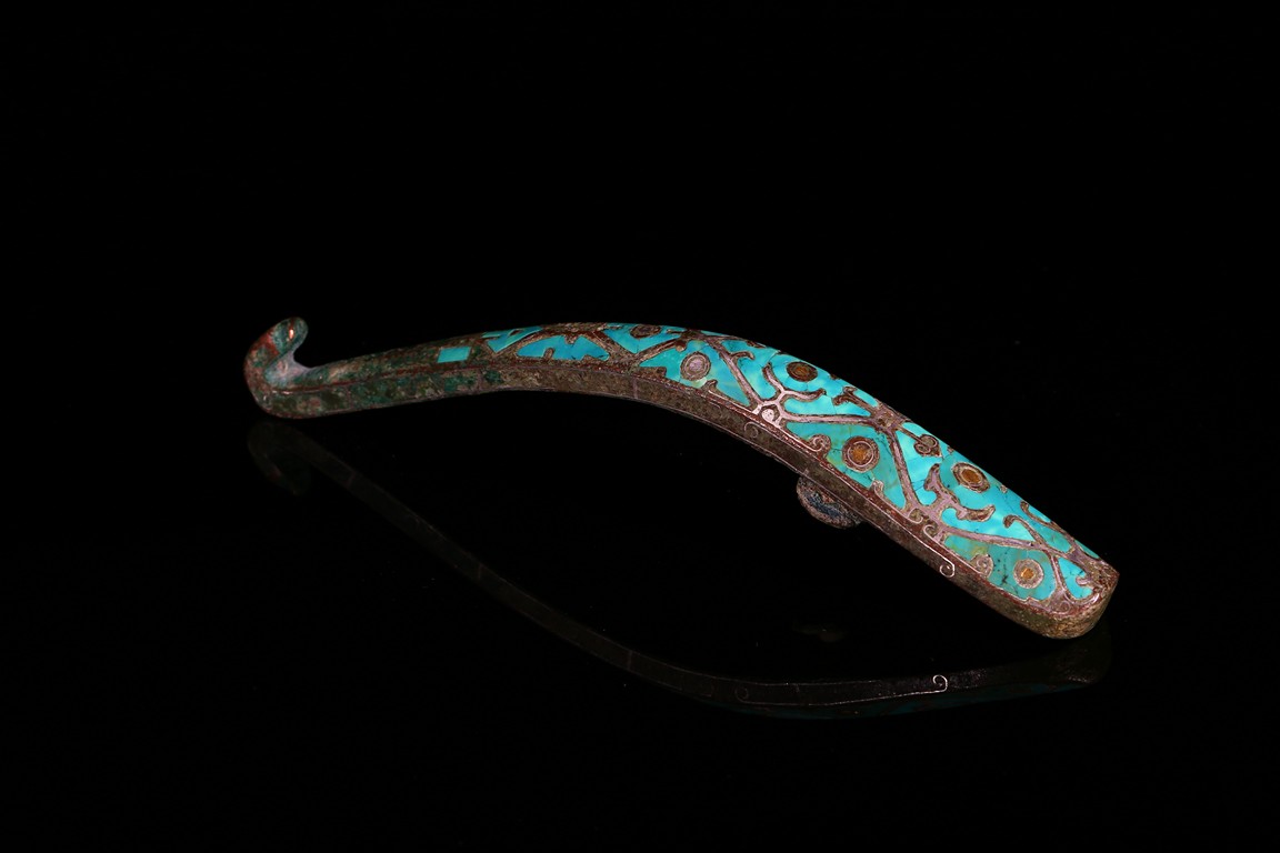 Finely inlaid in gold and silver wire with an intricate overlapping geometric design all filled in with turquoise inlay. Han Dynasty period.
