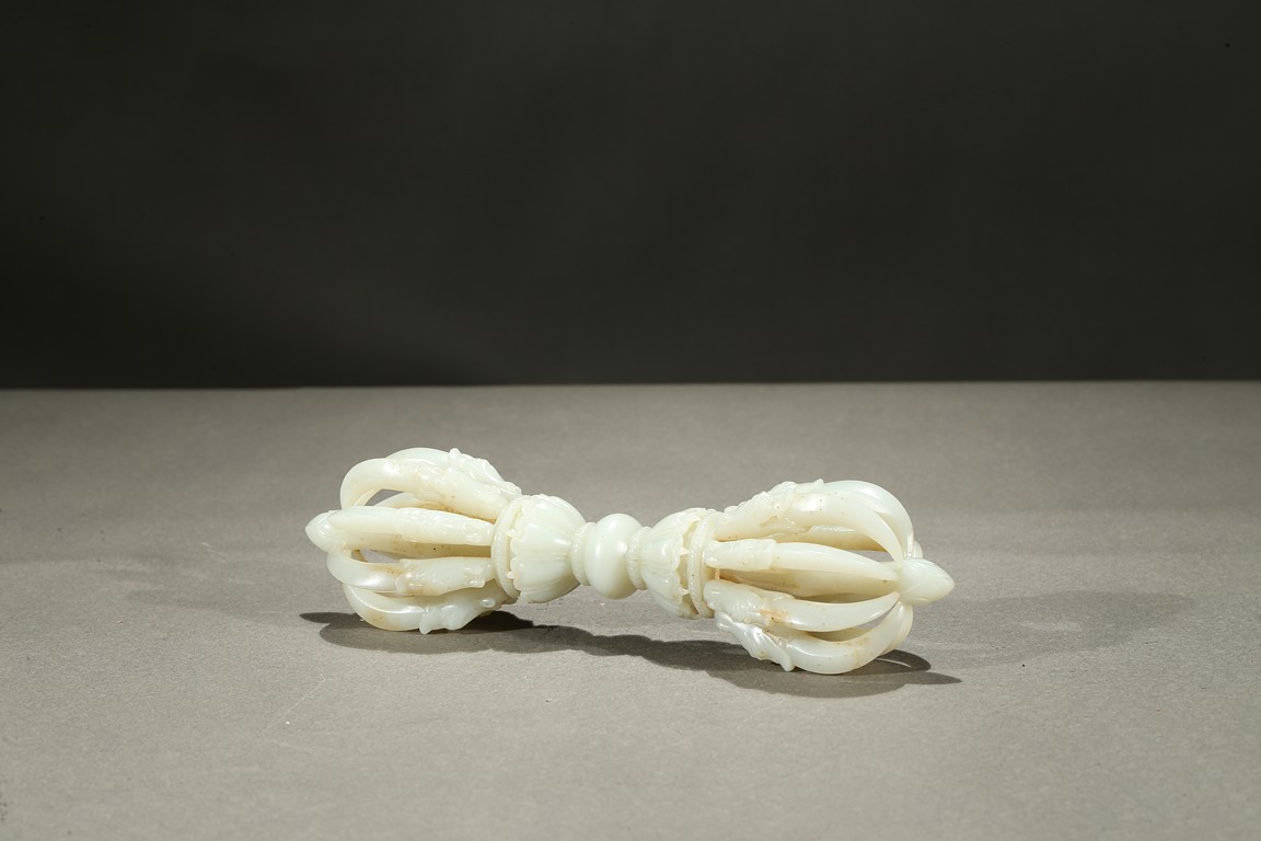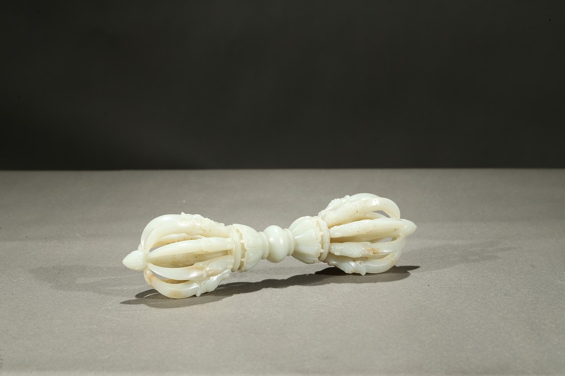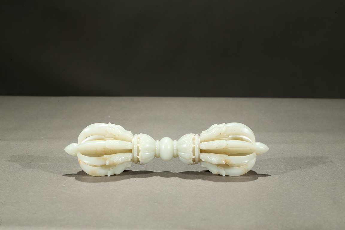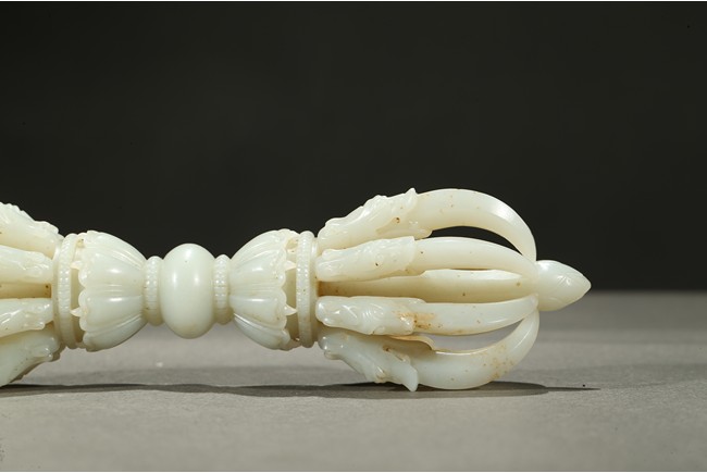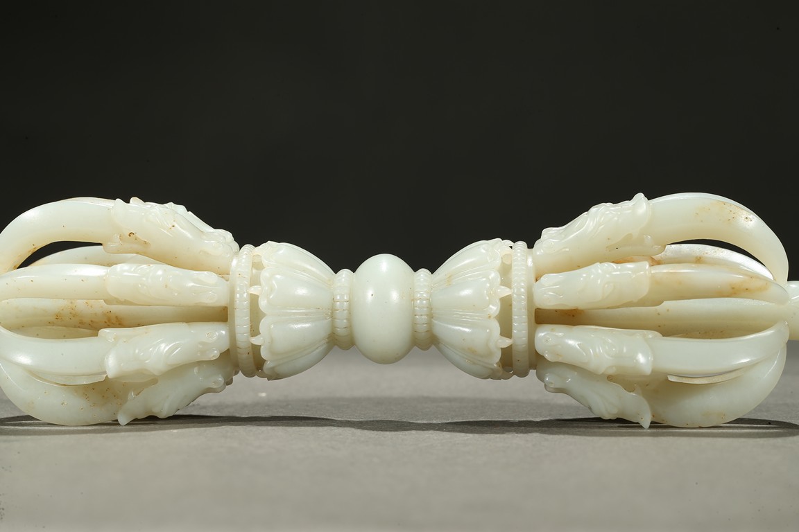 The thunderbolt-scepter is carved with a central bulbous grip that separates two lotus pedestals supporting a central column surrounded by eight arched vajra points emerging from the jaws of makara heads, the stone is of translucent white tone. Qing Dynasty period.