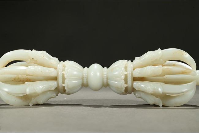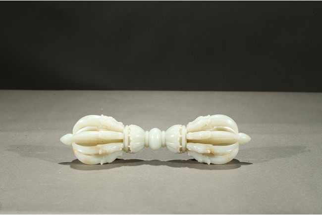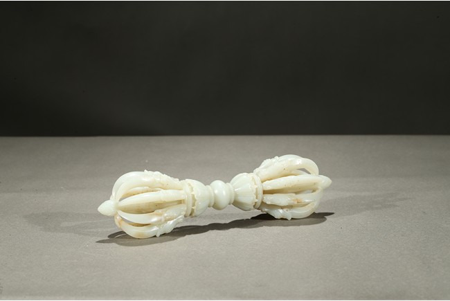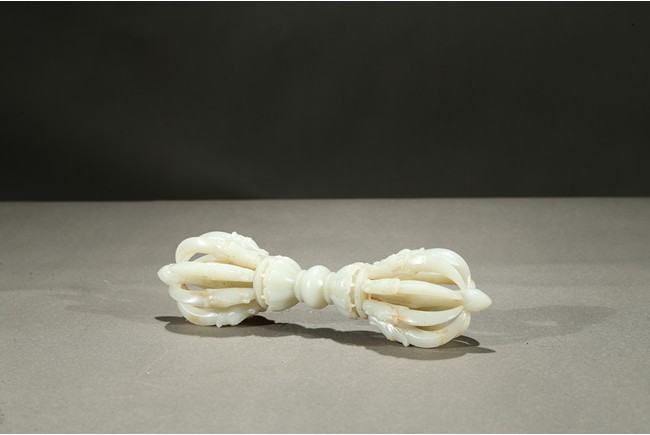 金剛杵,梵名VAJRA,藏語稱“多吉”,又叫做寶杵、降魔杵等。原為古代印度之武器。由於質地堅固,能擊破各種物質,故稱金剛杵。在佛教密宗中,金剛杵象徵著所向無敵、無堅不摧的智慧和真如佛性,它可以斷除各種煩惱、摧毀形形色色障礙修道的惡魔,為密教諸尊之持物或瑜伽士修道之法器。此金剛杵以上等白玉雕琢,技術精湛,刀法嫻熟,線條流暢,打磨極為精細,做工一絲不苟,寓意剛正吉祥,造型別緻,表面溫潤光滑,器型優美凝重,神完氣足且值得細細品味。北京故宮博物院藏有同題材作品,可資比較。 參閲:《故宮博物院藏文物珍品全集·玉器(下)》頁134,圖112。