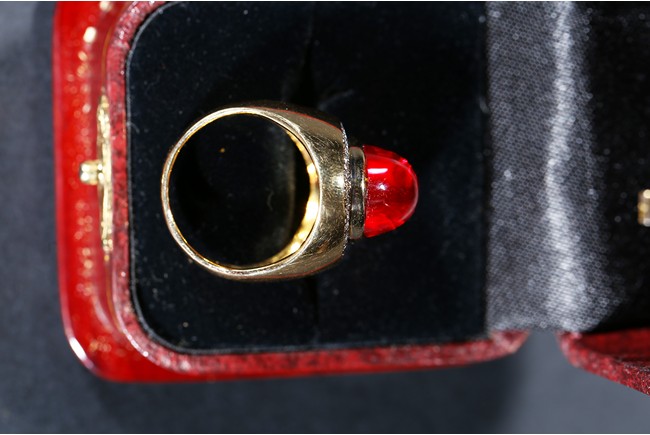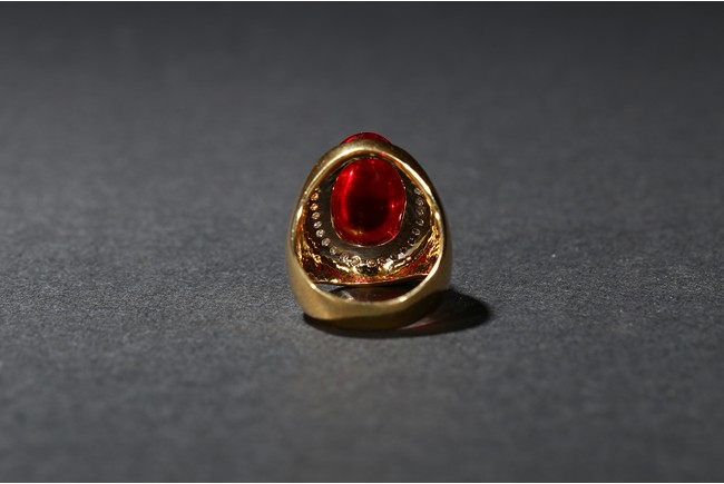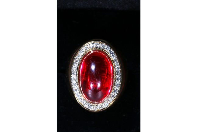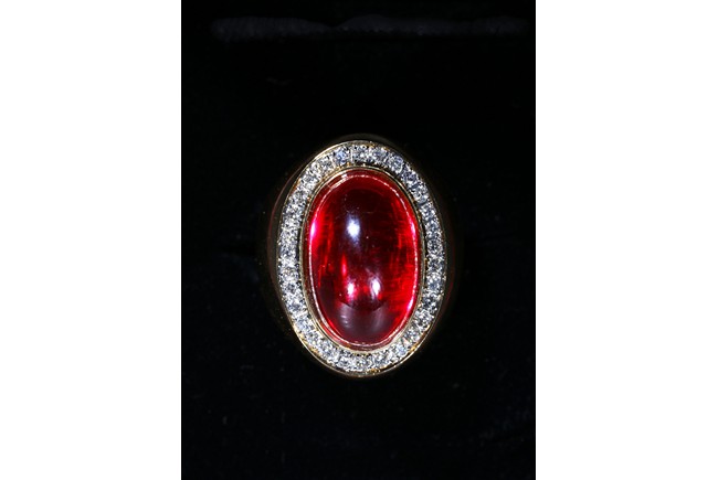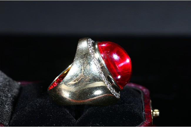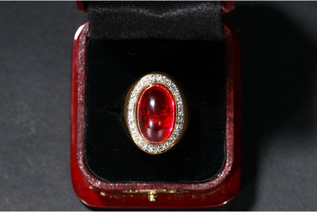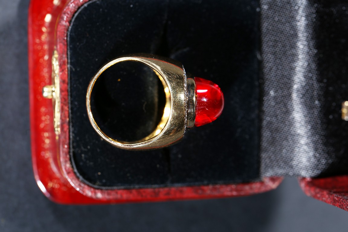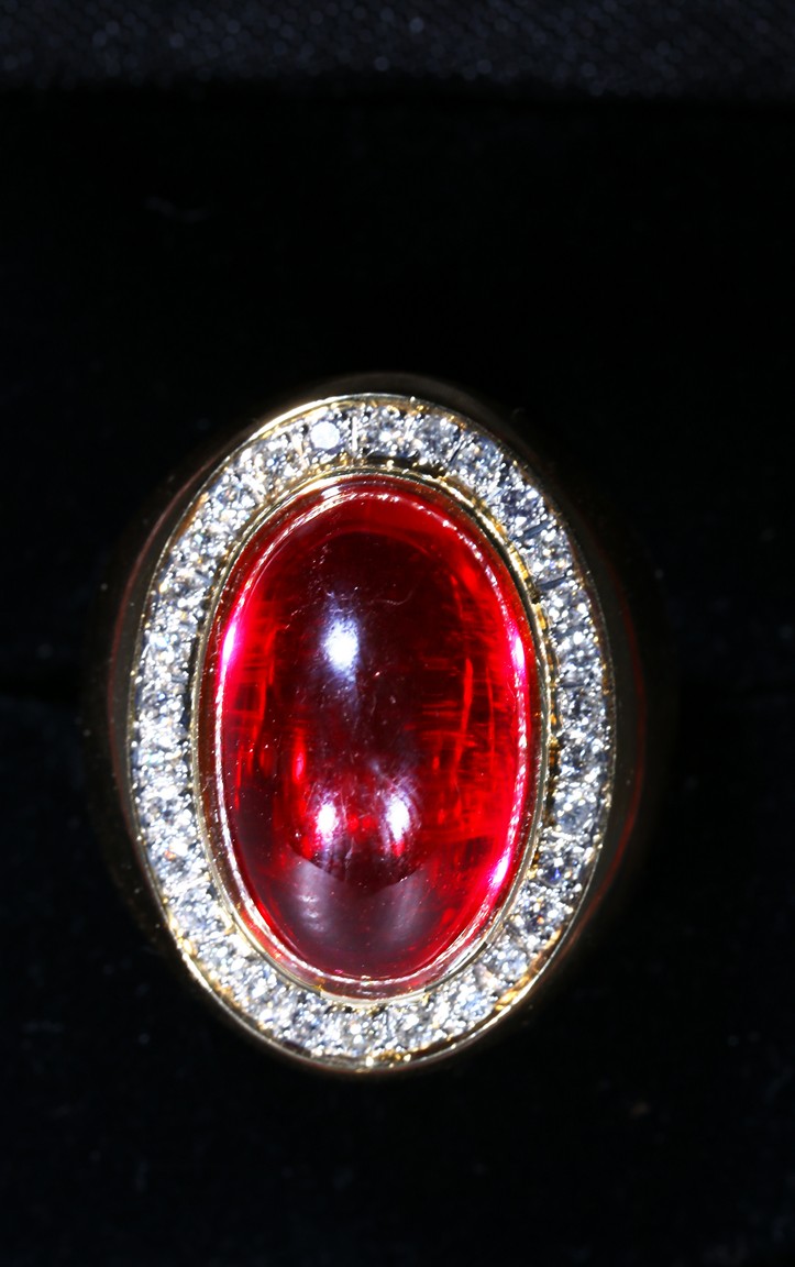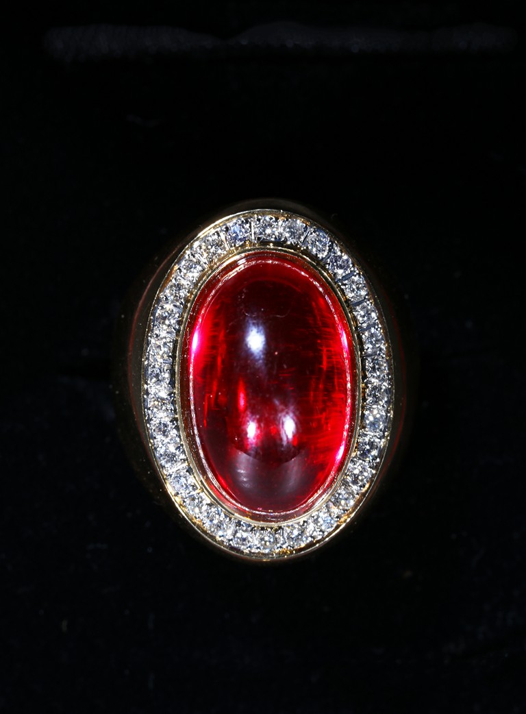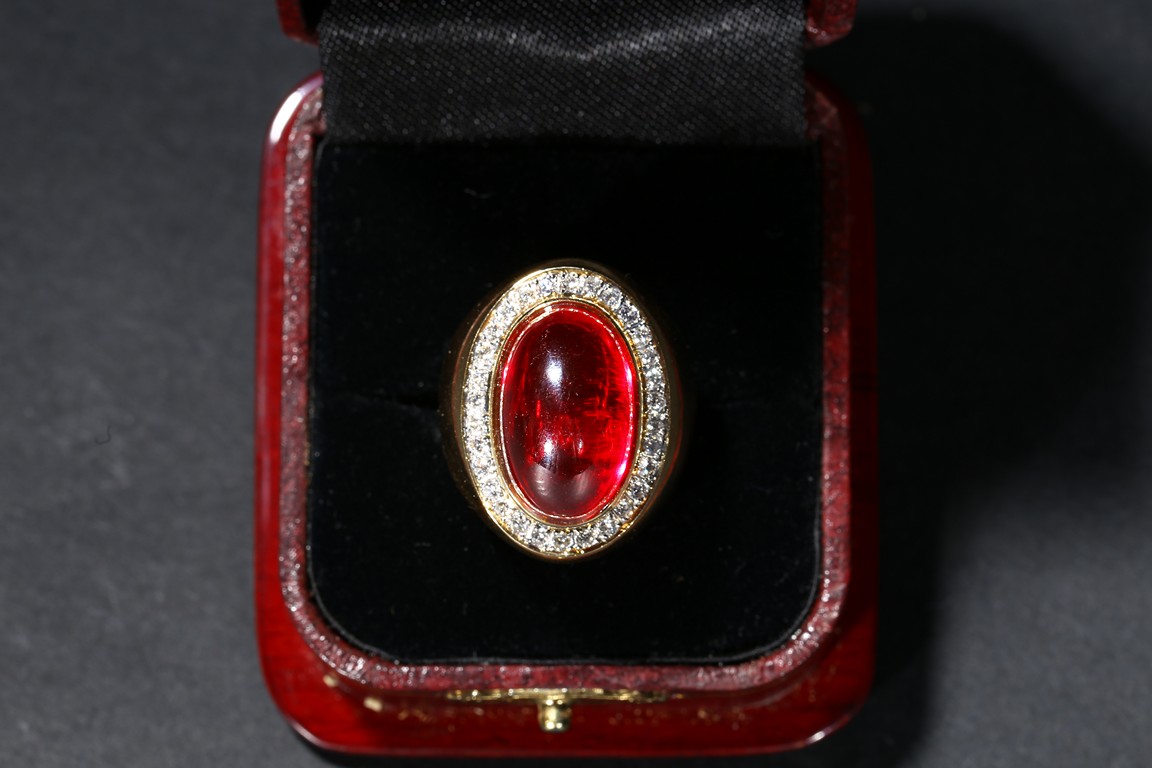 A RED GEM AND DIAMOND GOLD RING 18K金鑲鑽寶石戒指