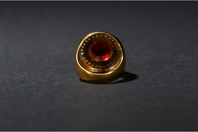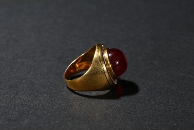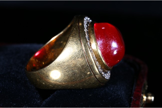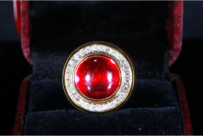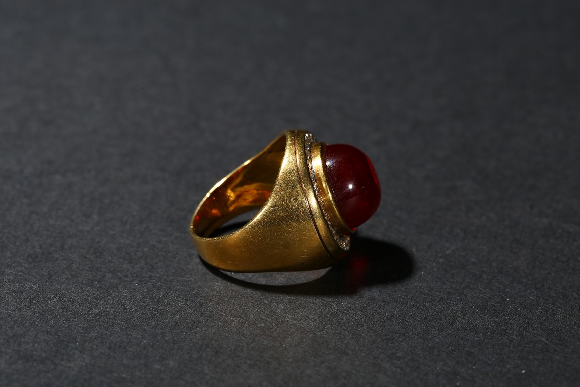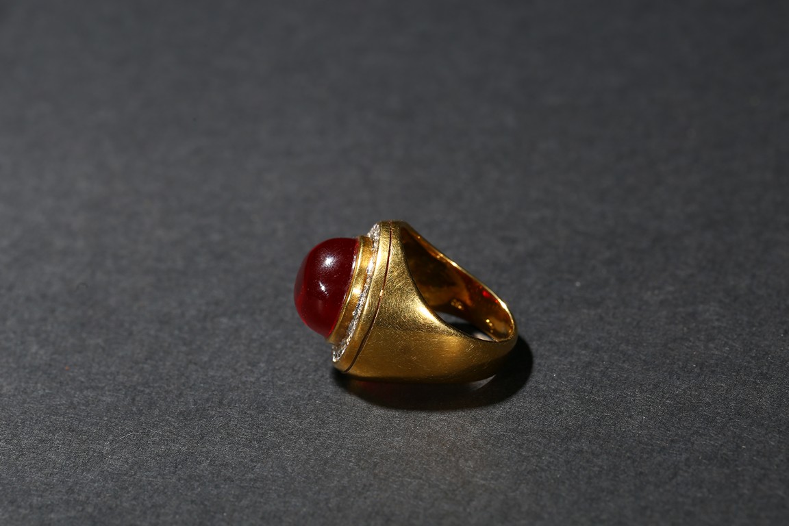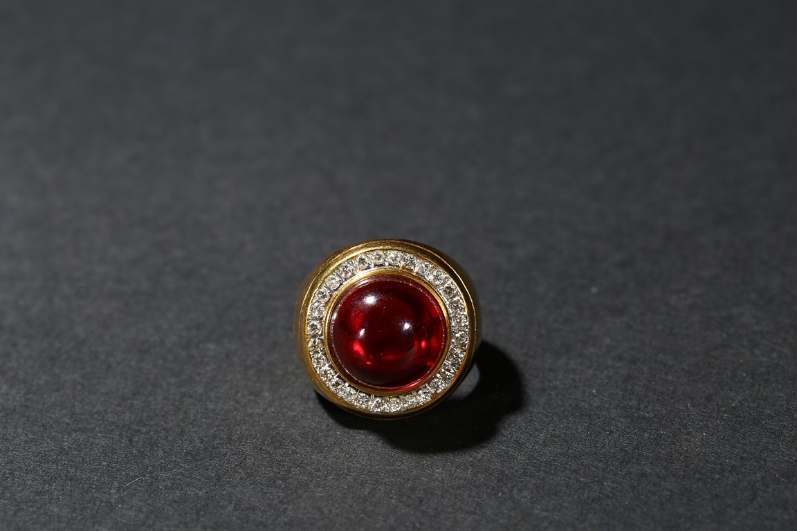 A RED GEM AND DIAMOND GOLD RING 18K金鑲鑽寶石戒指
