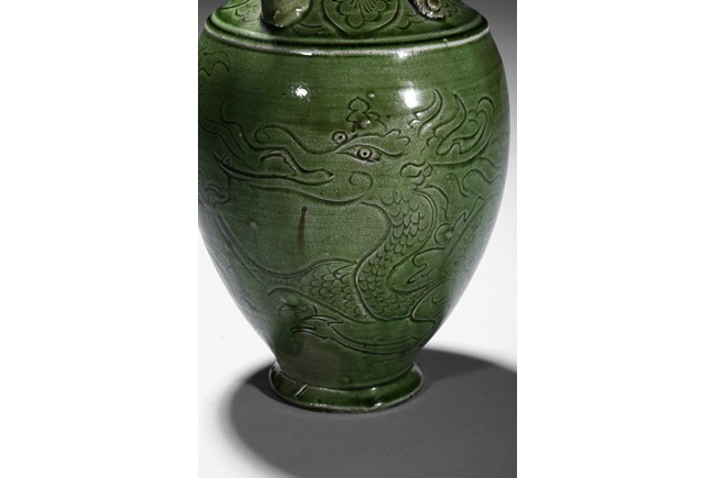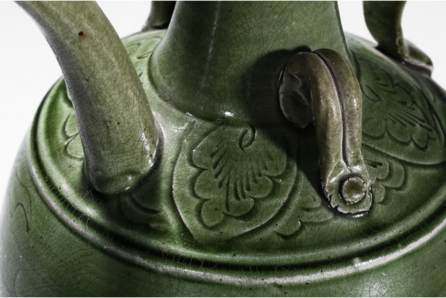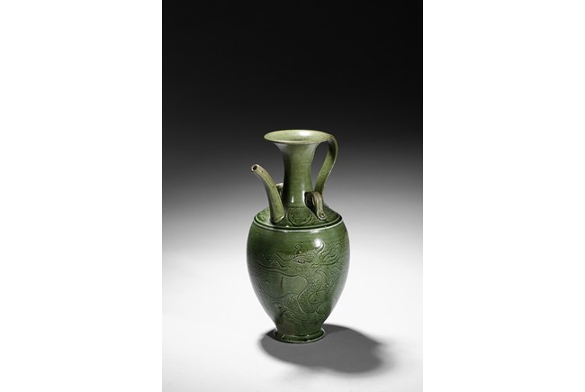Supported on spreading foot, the body finely incised with dragon pattern, shoulders set with a loop handle opposite a curved spout and flanked by two small strap loops, the long waisted neck rising to an everted rim, overall suffused in green glazed.