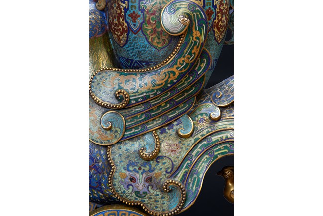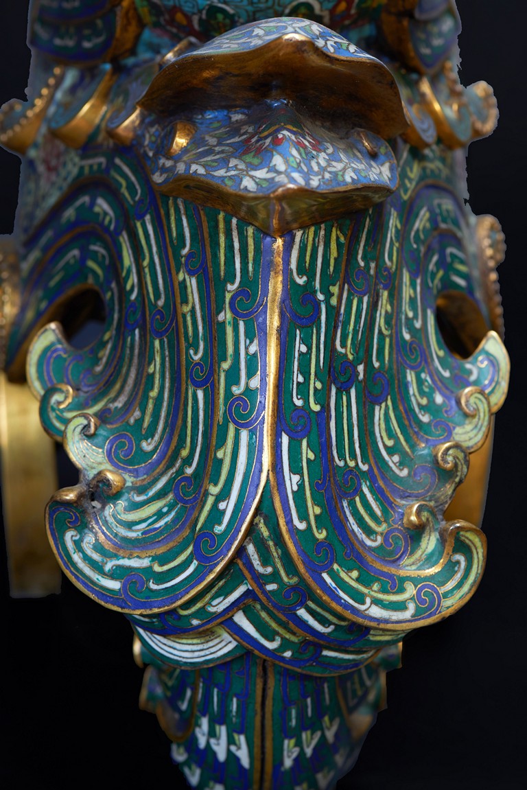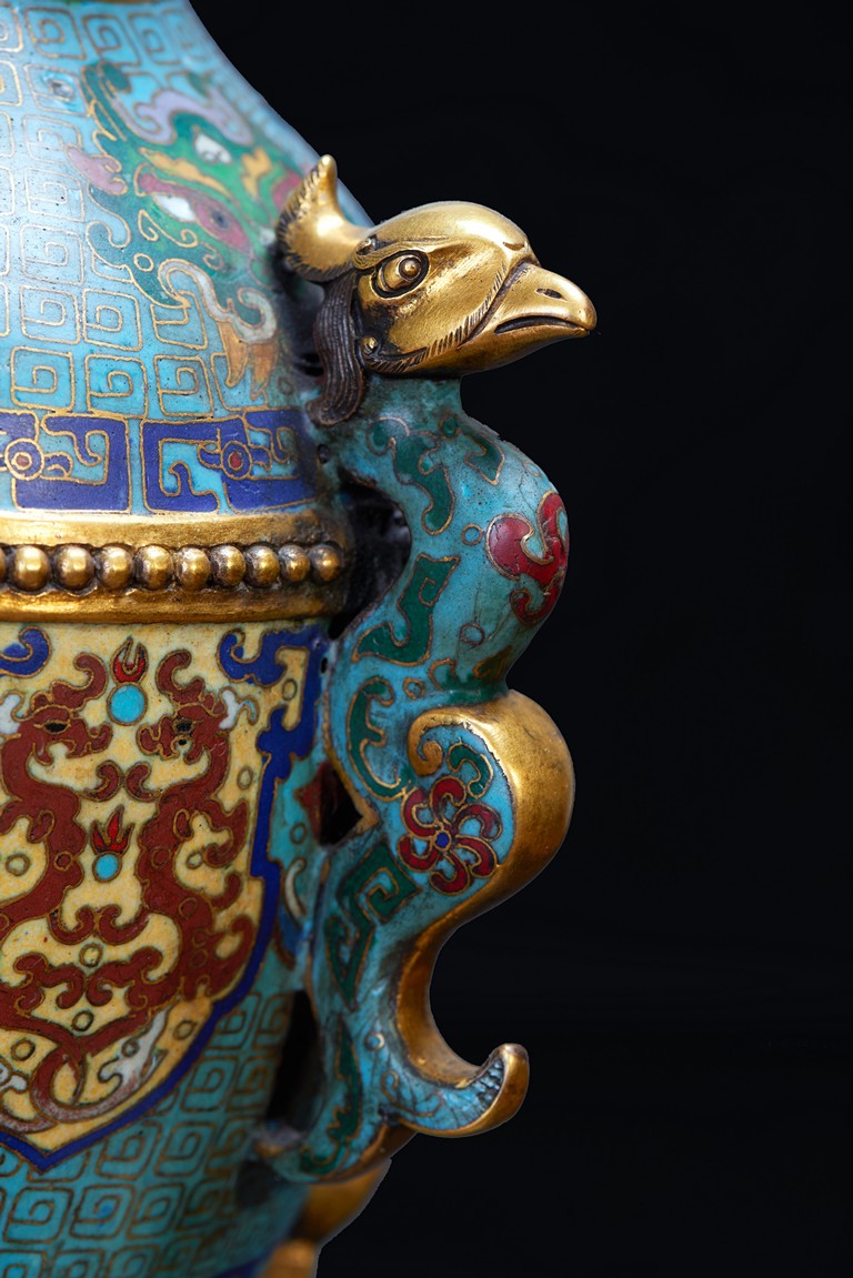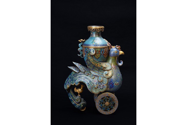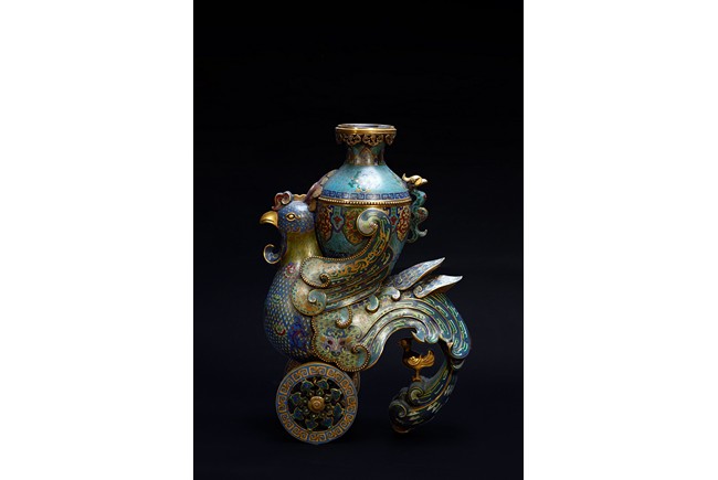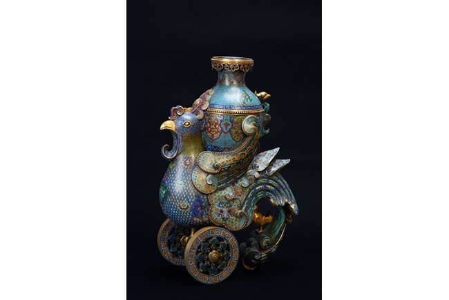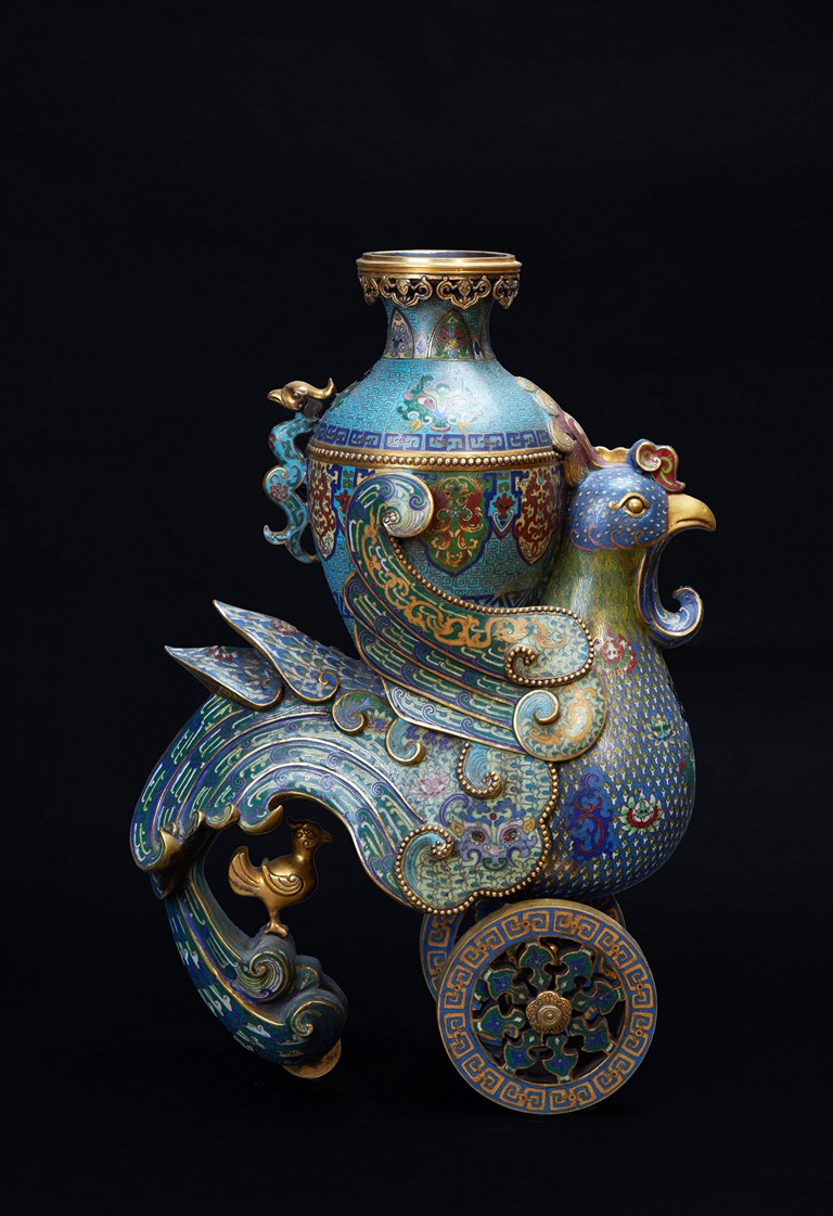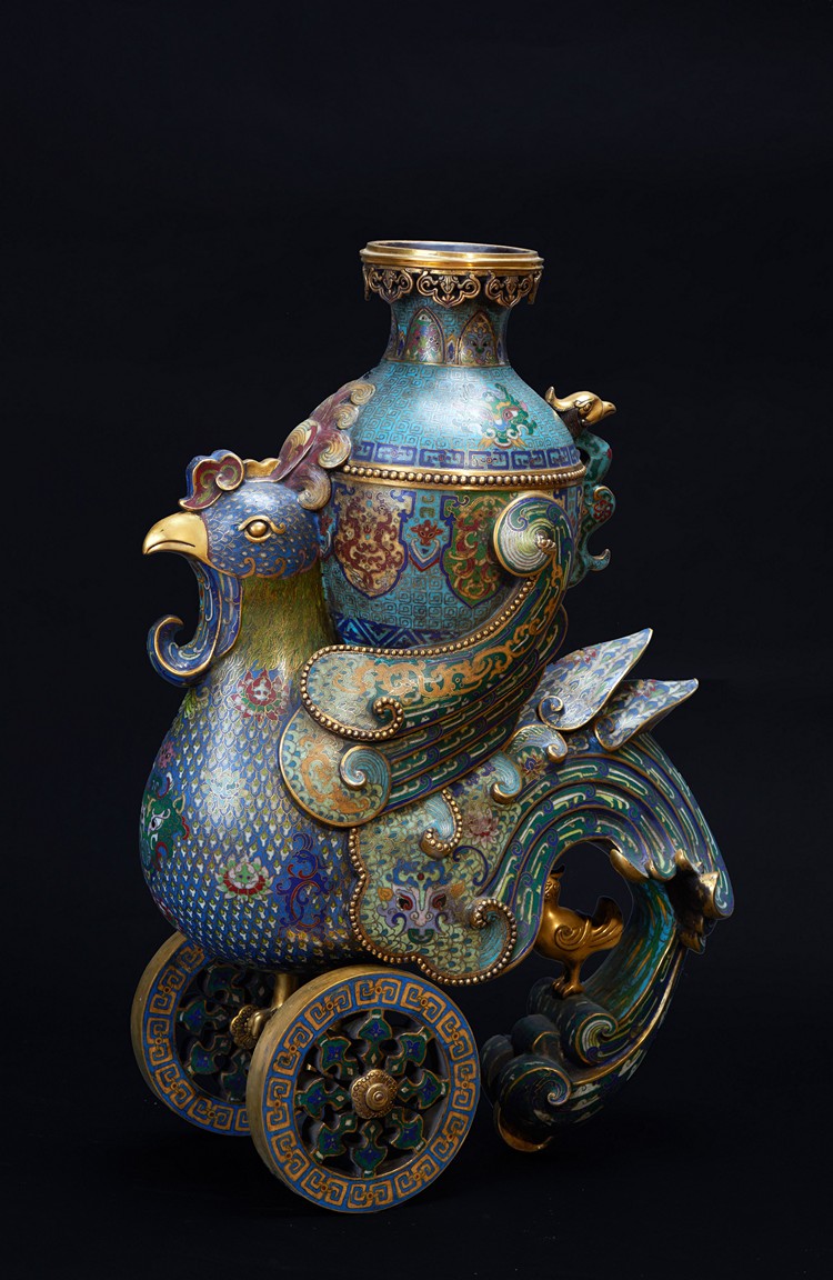 Elaborately modelled into a phoenix perched on an axle between two stationary spoked wheels that decorated with key-fret band rim, the feather enamelled with scrolled cloud and lotus pattern, bearing turquois ground baluster vase on ite back, below the larger phoenix curling tail standing a smaller golden baby phoenix. Qing Dynasaty period.
