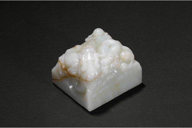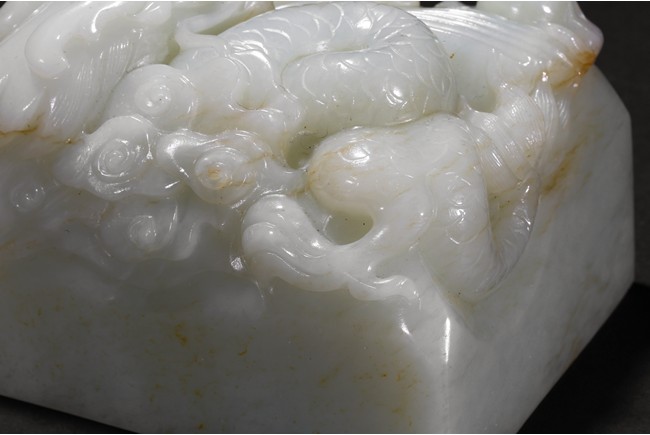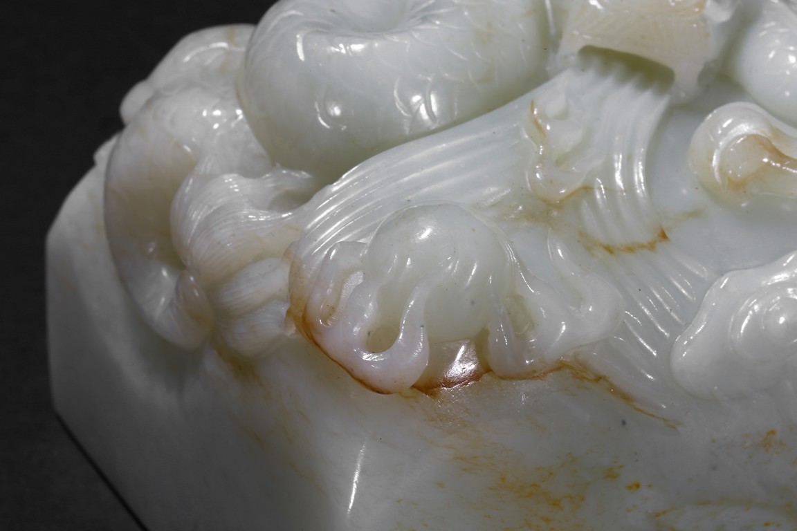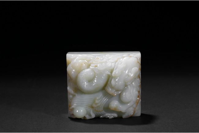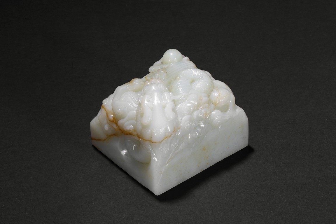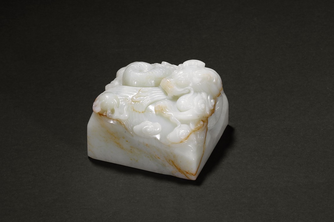 The paper weight is of square section, the top carved with a dragon issuing water streams and flaming pearl. Late Qing Dynasty period.