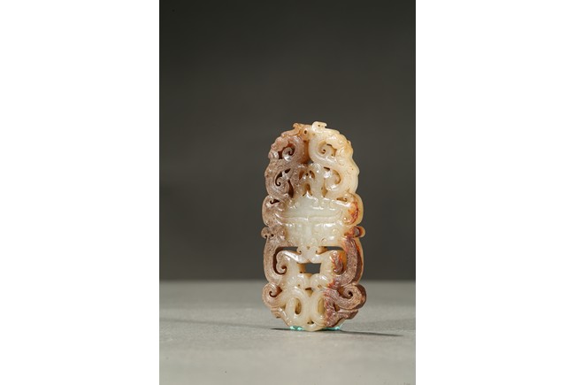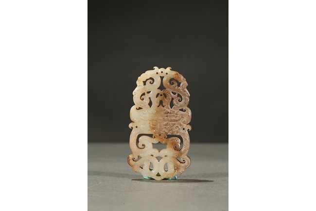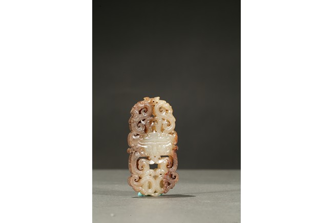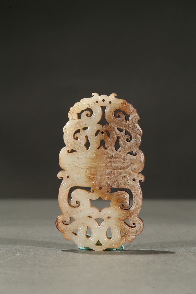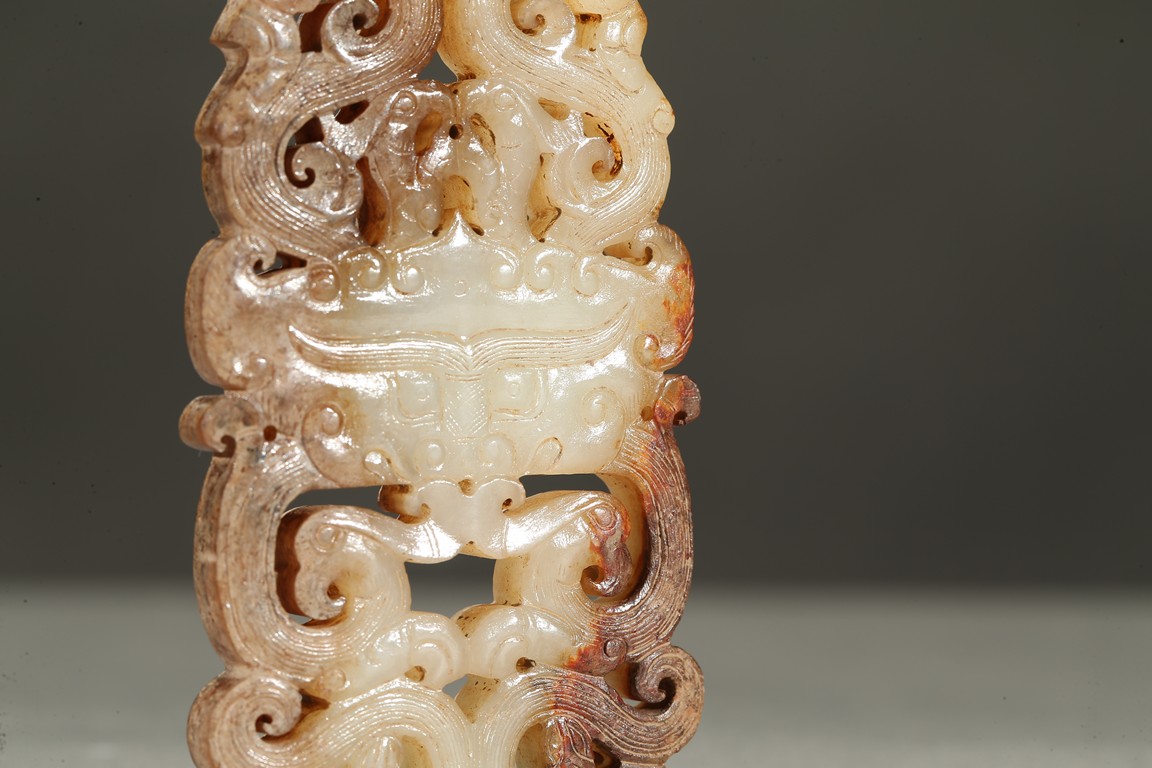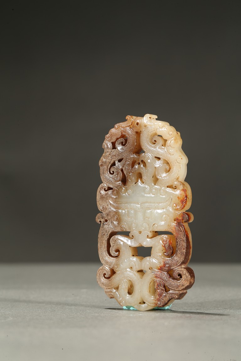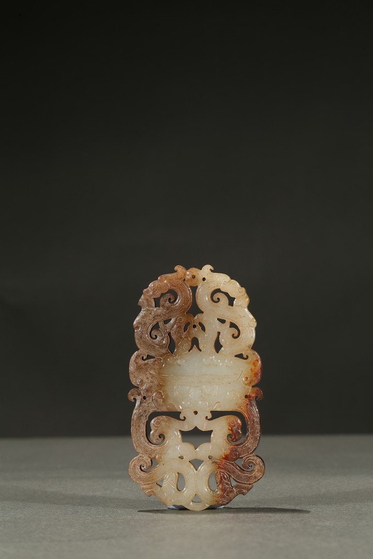 The plaque carved in openwork with a pair of stylized dragons and phoenixes flanking a mythical beast mask at center. The stone is of mottled russet and white tone. Han Dynasty period.