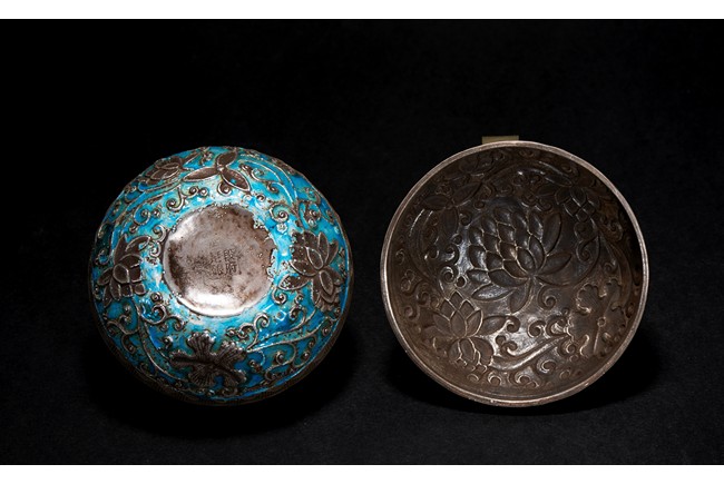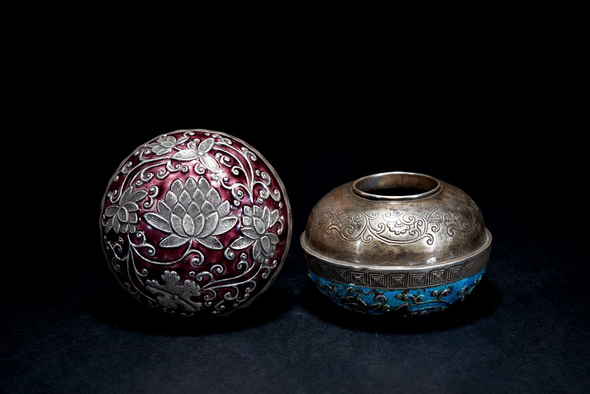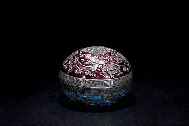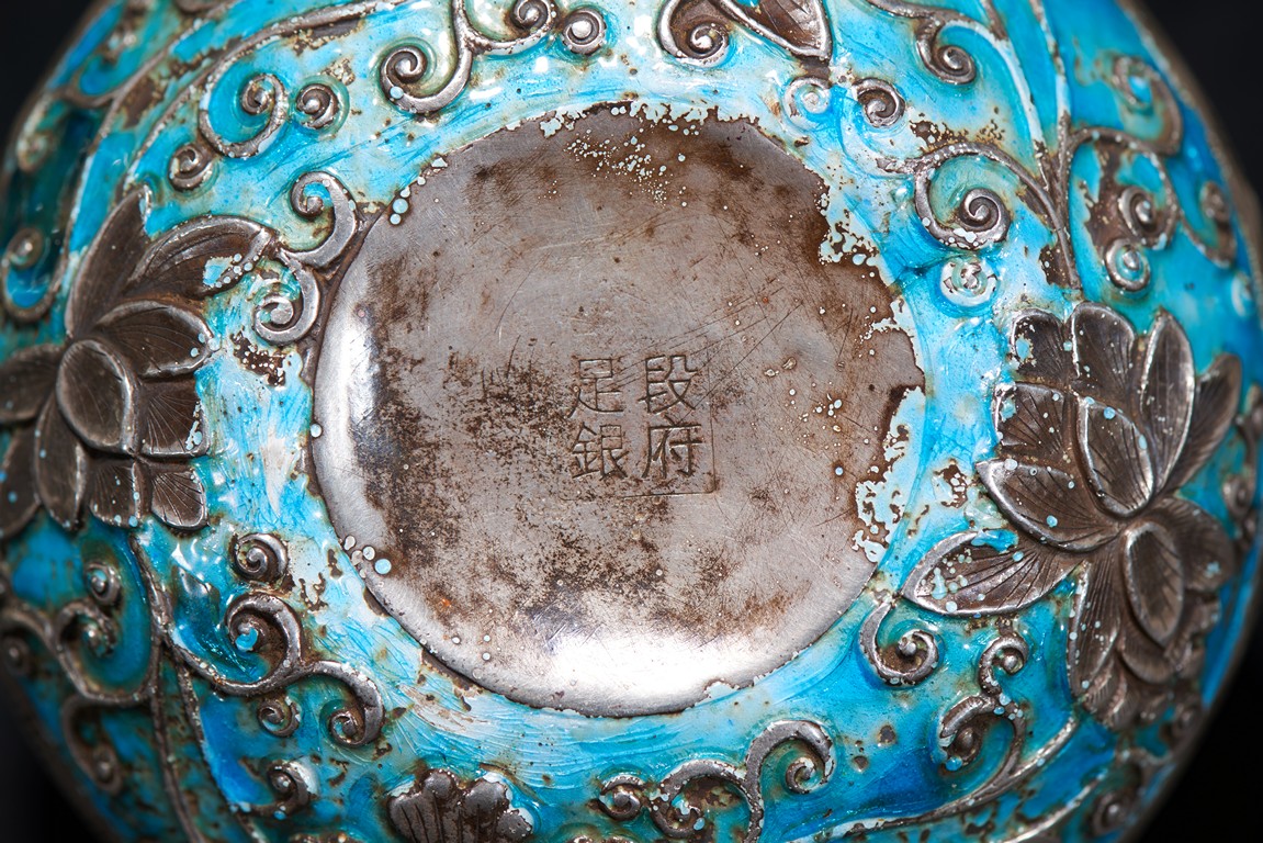 Of rounded form, overall decorated with silver floral scrolling on turquoise and ruby red enamelled ground. Base with four character 'DUAN FU ZU YIN'. Late Qing Dynasty period.