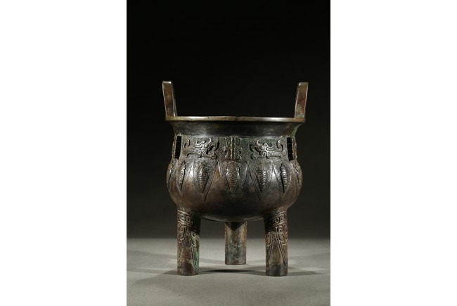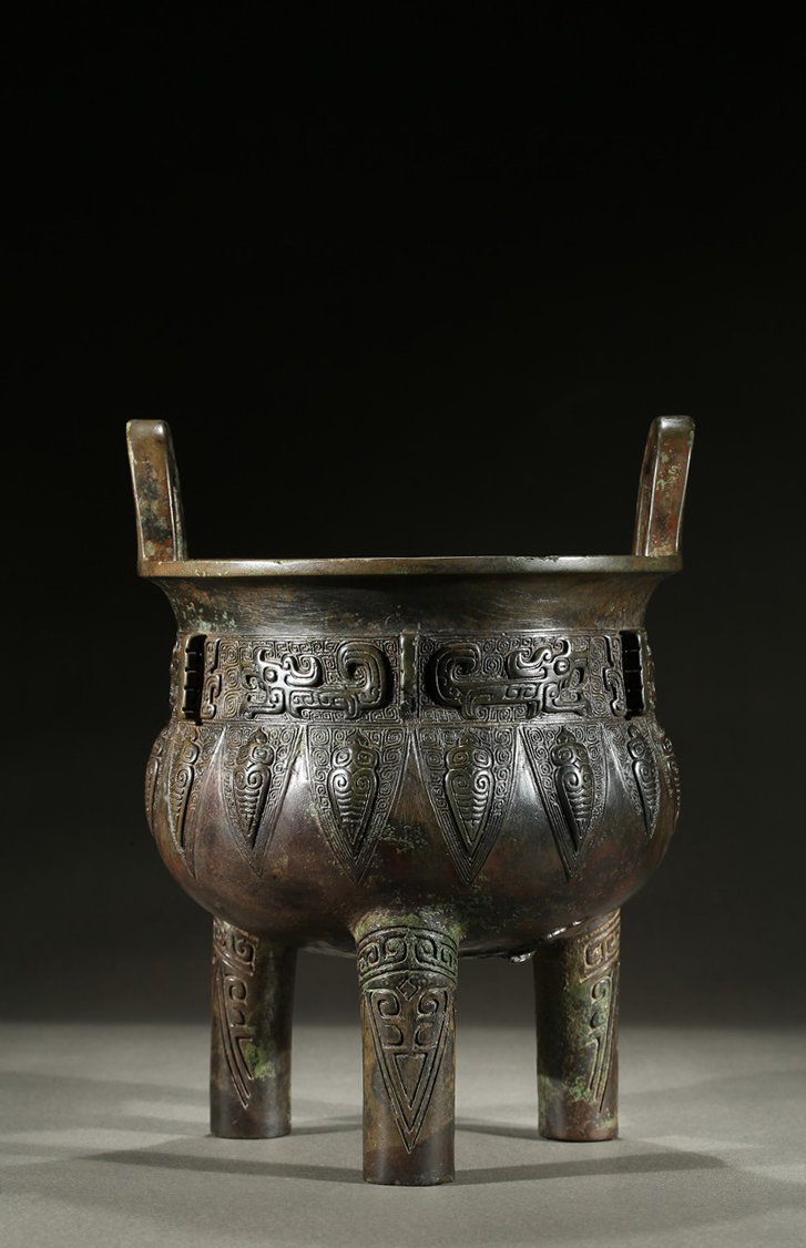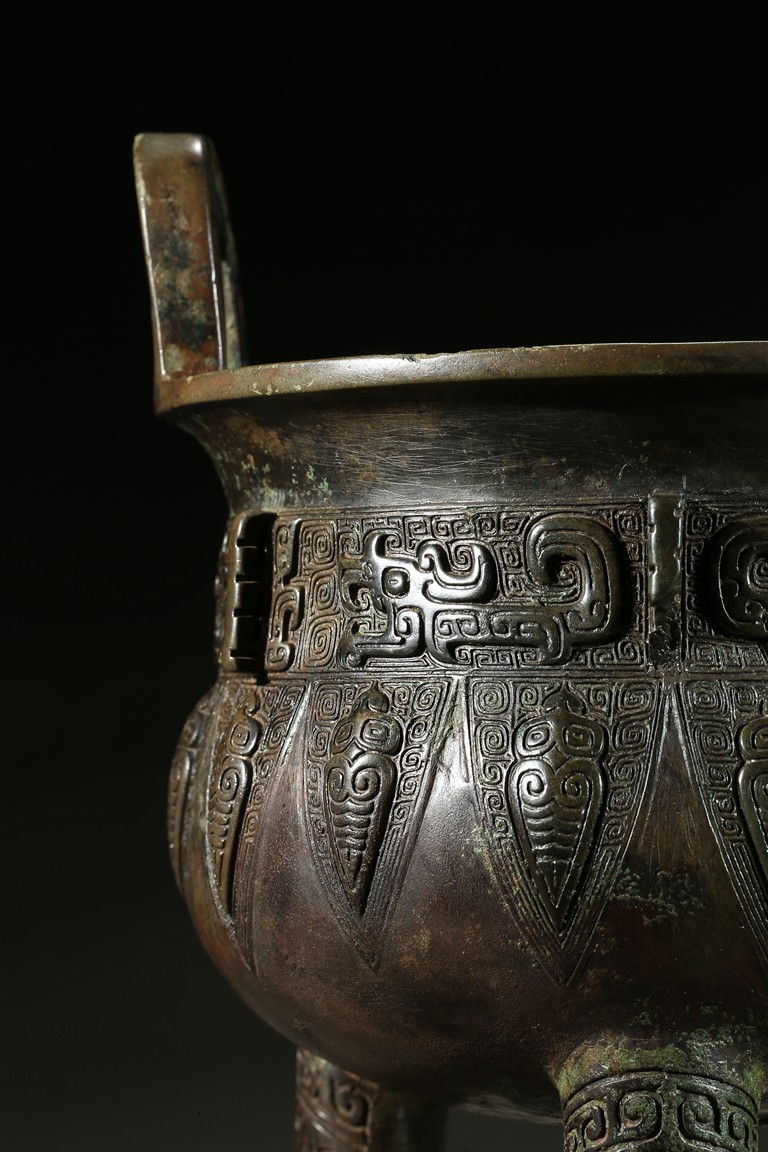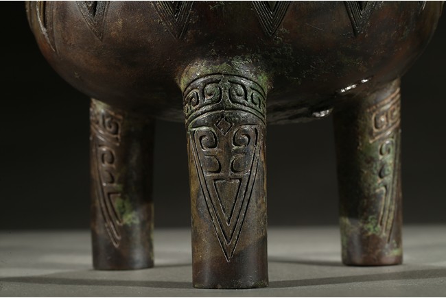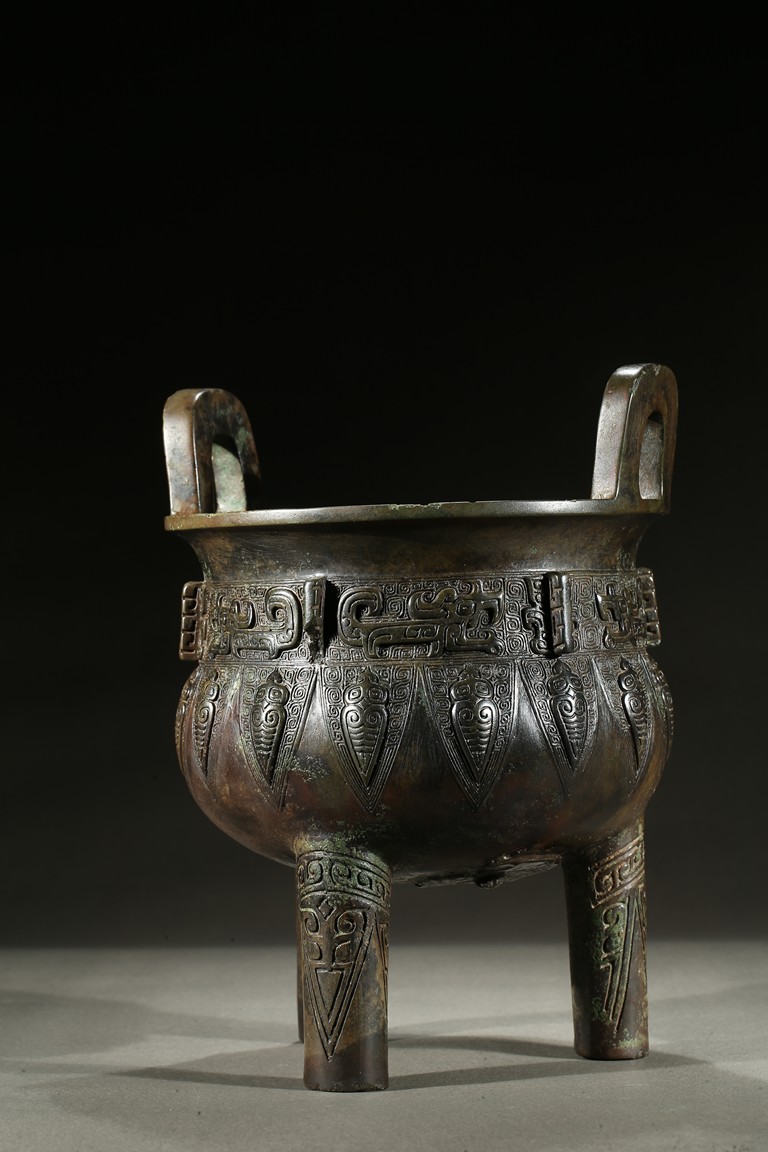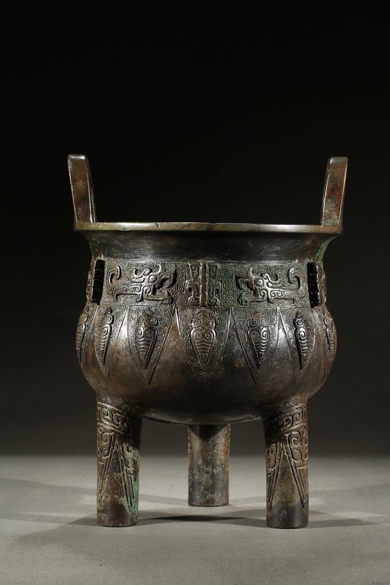 飪食器。直耳,柱足。正面背面腹部各飾一對夔龍紋,正面夔龍尾尾相對,背面夔龍首首相對作相向狀,並以細雲雷紋襯地,有棱脊間隔;腹身下部飾垂葉紋,葉面正中飾蟬紋,亦有細雲雷紋襯地。圖案線條遒勁,雕範刀法流暢,整器紋飾繁覆,鏨刻精美,形體圓實,品相完好, 局部帶青銅銹,古趣橫生,內壁刻銘文,待考,是一件具有代表性的商晚期典型禮器,值得珍藏。类似造型青铜鼎可参考纽约佳士得2010年9月16日拍品号816。 來源:紐約私人藏家多年收藏 Provenance: Private collection, New York City