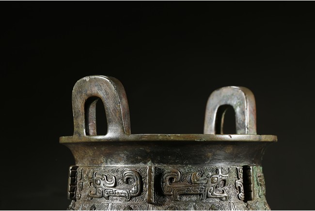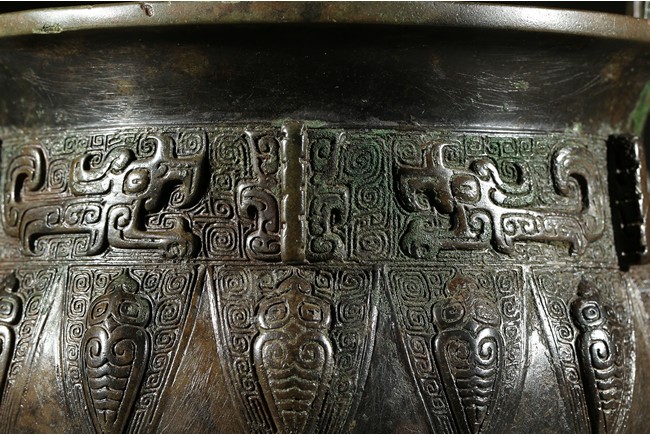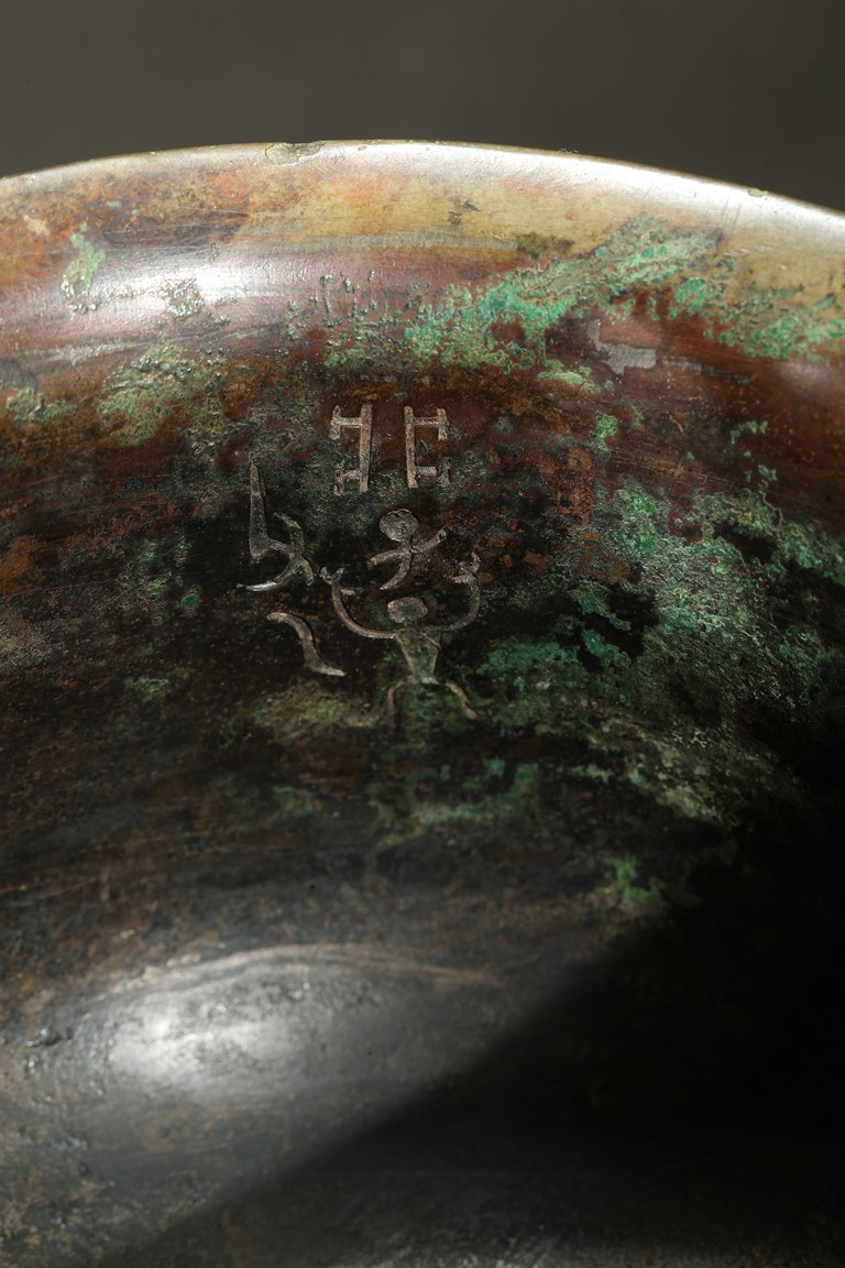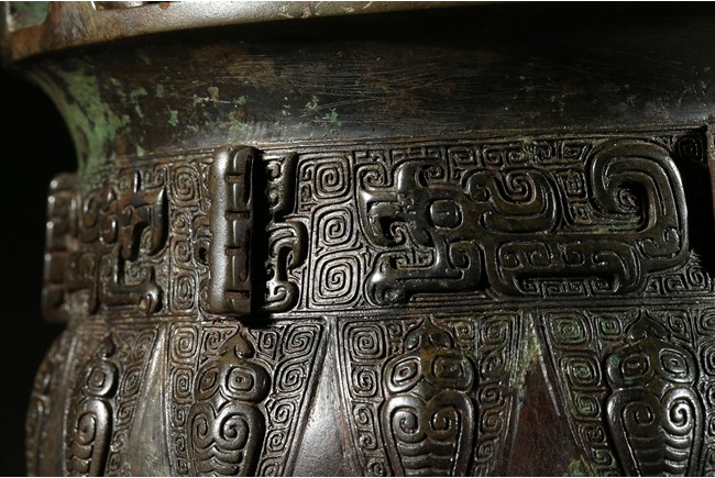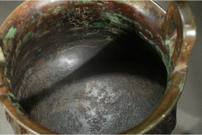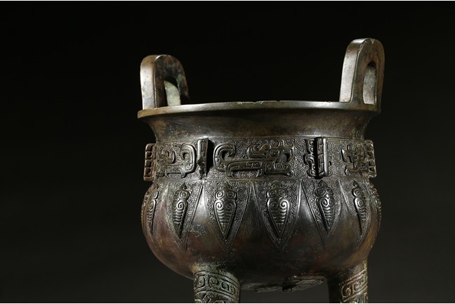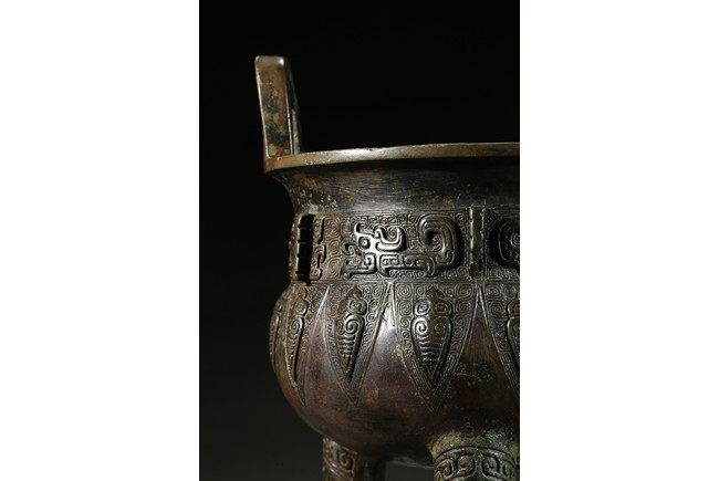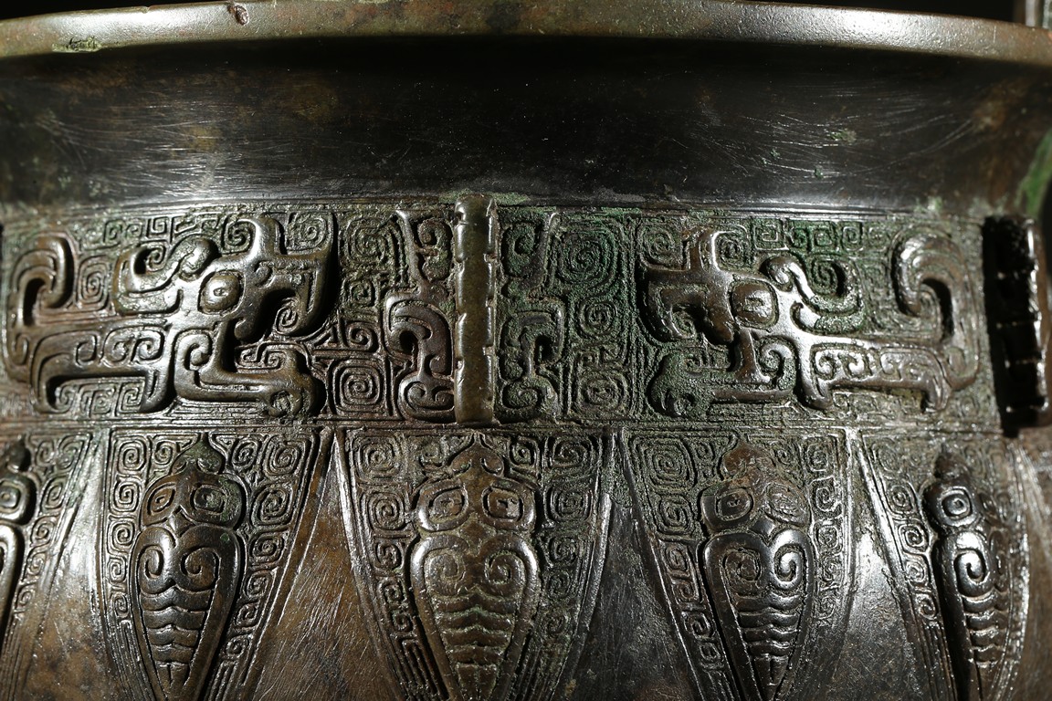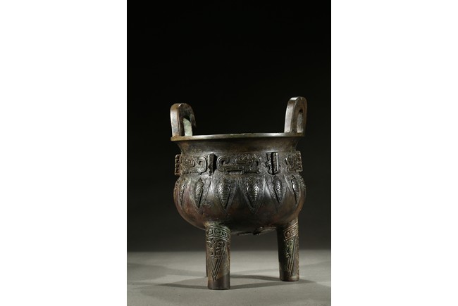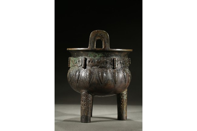 飪食器。直耳,柱足。正面背面腹部各飾一對夔龍紋,正面夔龍尾尾相對,背面夔龍首首相對作相向狀,並以細雲雷紋襯地,有棱脊間隔;腹身下部飾垂葉紋,葉面正中飾蟬紋,亦有細雲雷紋襯地。圖案線條遒勁,雕範刀法流暢,整器紋飾繁覆,鏨刻精美,形體圓實,品相完好, 局部帶青銅銹,古趣橫生,內壁刻銘文,待考,是一件具有代表性的商晚期典型禮器,值得珍藏。类似造型青铜鼎可参考纽约佳士得2010年9月16日拍品号816。 來源:紐約私人藏家多年收藏 Provenance: Private collection, New York City